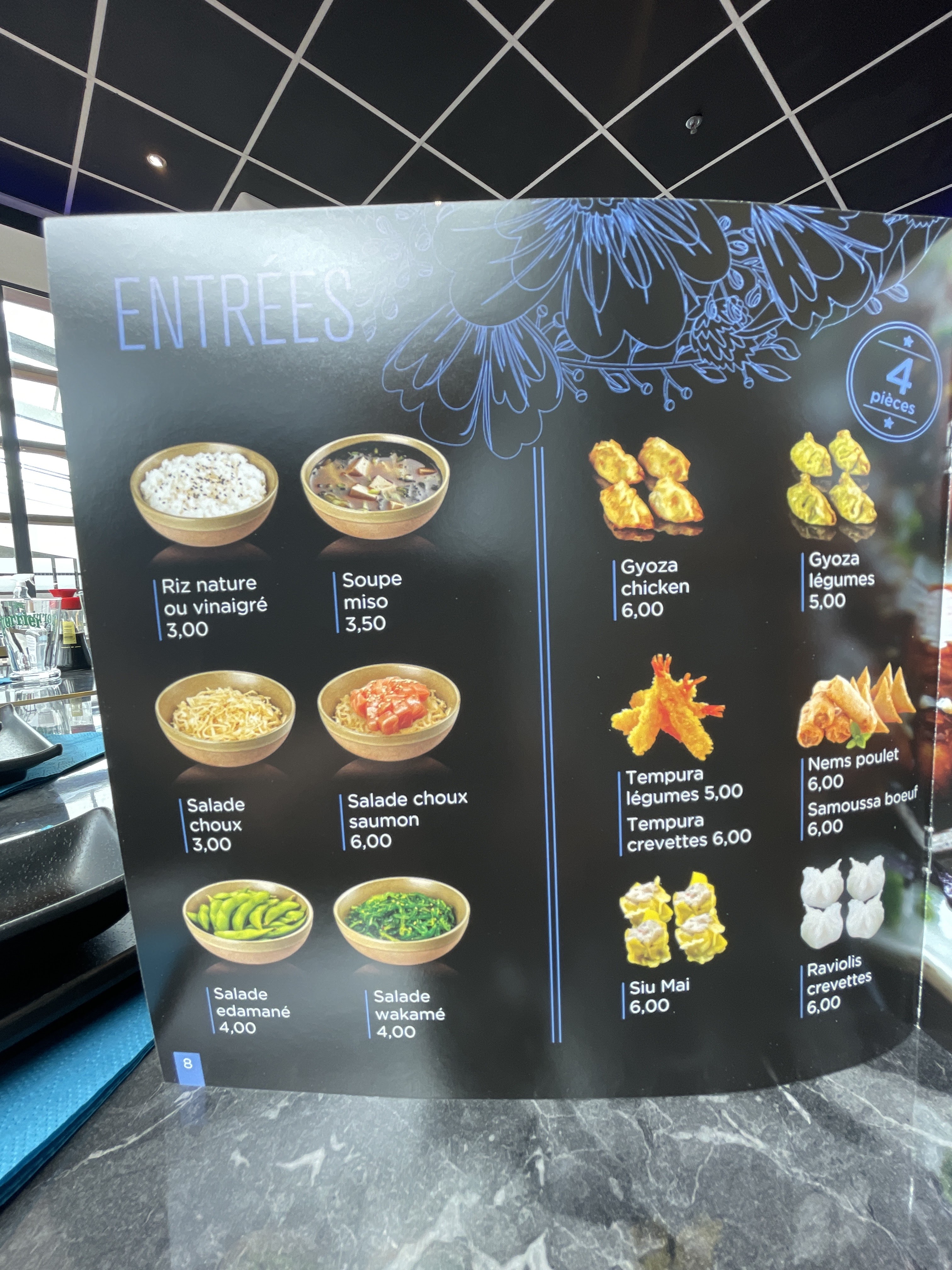 Concept du restaurant japonais , menu 14,50€ avec choix à volonté sur trois tours, bon copieux, service très sympa, le seul point faible, il fait très froid à cause d’une mauvaise isolation, je conseille.