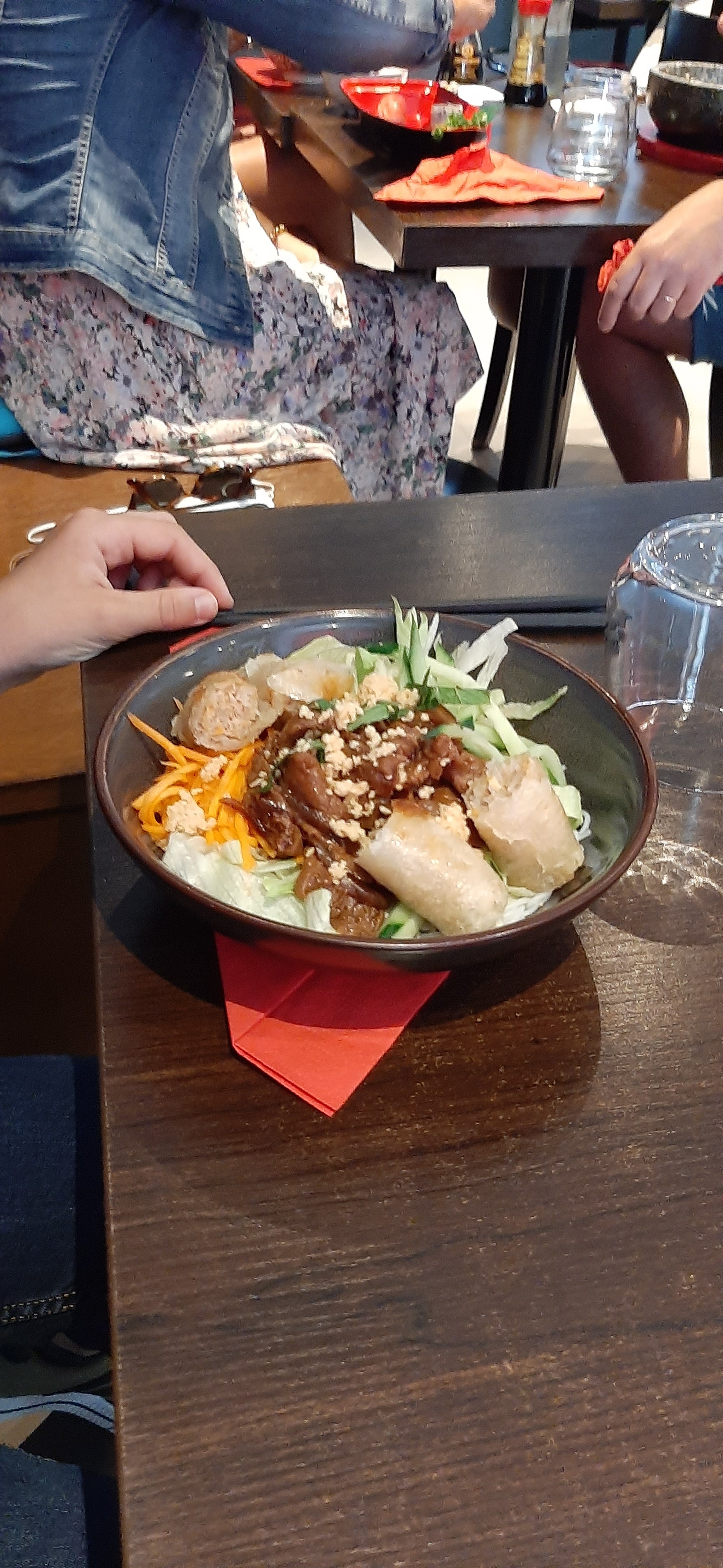 Les plats étaient assez bon, mais les quantité un peu juste. Juste 2 feuilles de menthe et de salade pour 4 nems et le bo bun correspond plus à un repas enfant qu'à un repas adulte. J'en ai jamais vu d'aussi petit !!