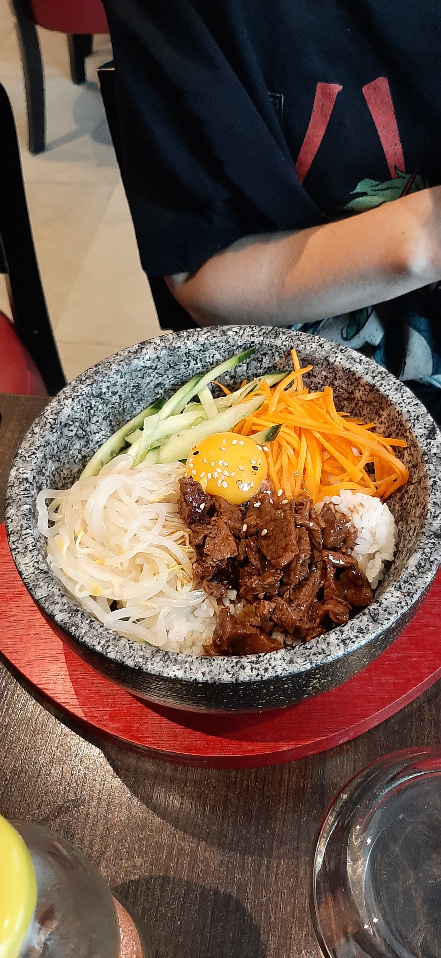 Je ne peux pas parler du reste de la carte, mais j'ai pris un bibimbap, une spécialité maison apparemment. Je me suis retrouvé avec un bol en granit, bouillant, avec 90% de riz, quelques épluchures de légumes et trois morceaux de bœuf qui se battaient en duel. Aucun assaisonnement, le riz était mauvais je n'ai même pas pu finir mon assiette car j'avais des haut le cœur à la fin. Alors je veux bien qu'on me parle des gouts et des couleurs, que justement dans la cuisine japonaise les ingrédients sont souvent bruts ect mais 15.5€ pour un bol de riz, il me reste un peu en travers, désolé. Donc plus de 20€ pour un bol de riz et une bière, en ayant faim en ressortant. Quand au service ça n'a choqué personne que je ne finisse pas mon assiette, personne ne m'a demandé si ça s'était bien passé, peut être ont ils l'habitude ?
