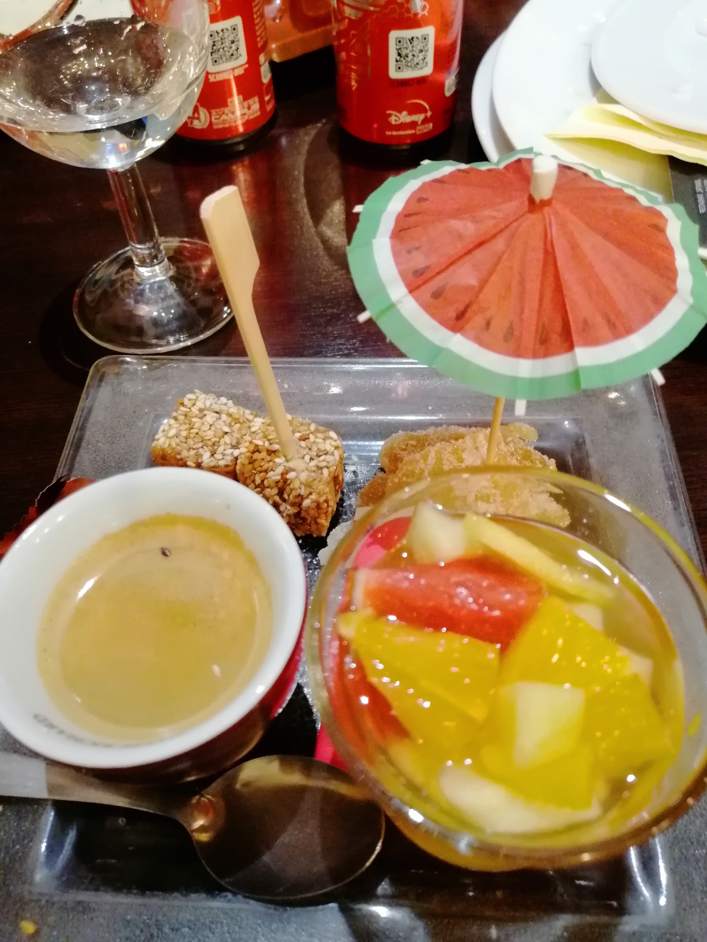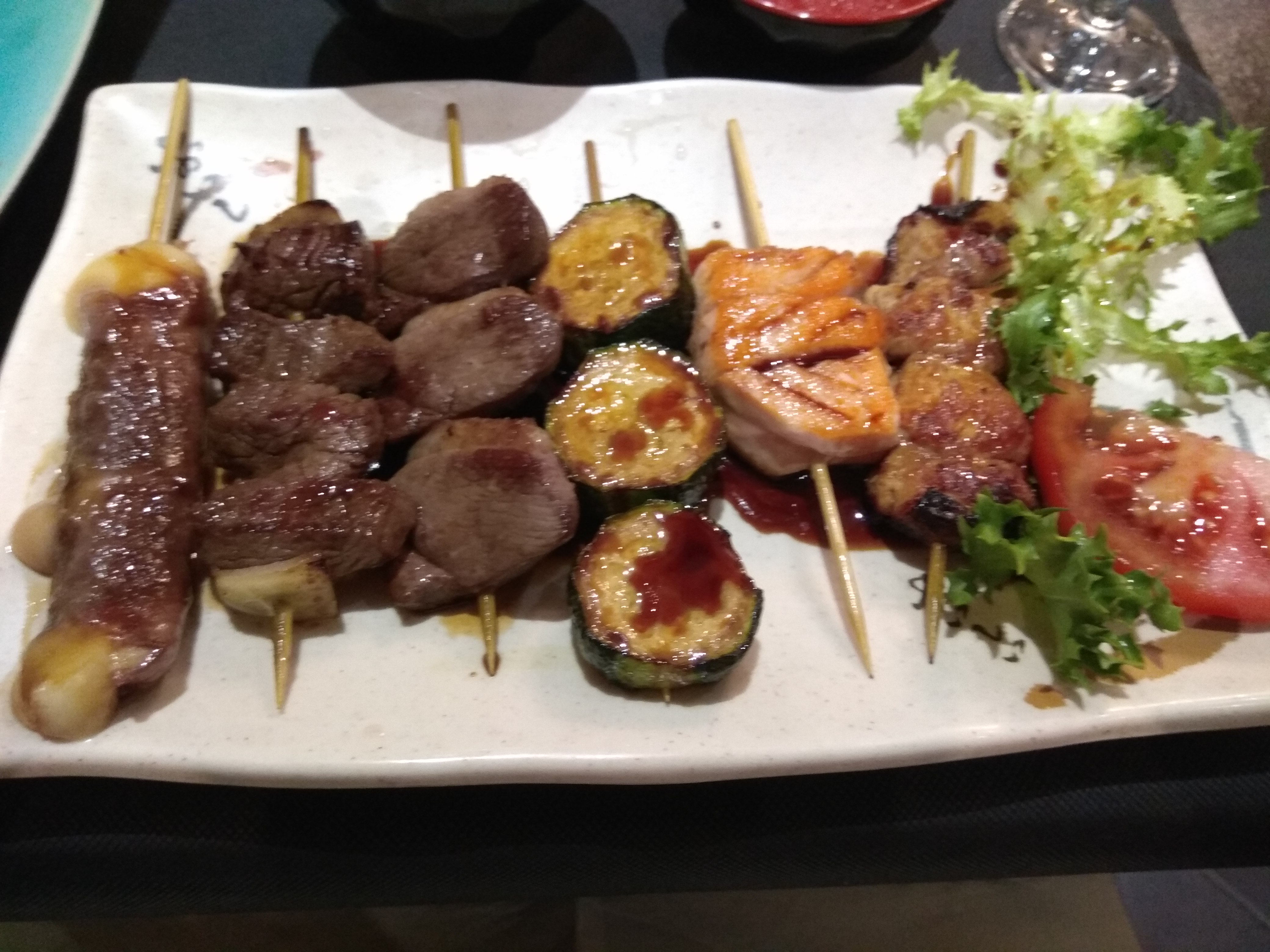 Portion des sashimi au saumon (petit cube) et des brochettes de saint Jacques (2 brochette de 3 très cher) ridicule Bon accueil malgré cela ...