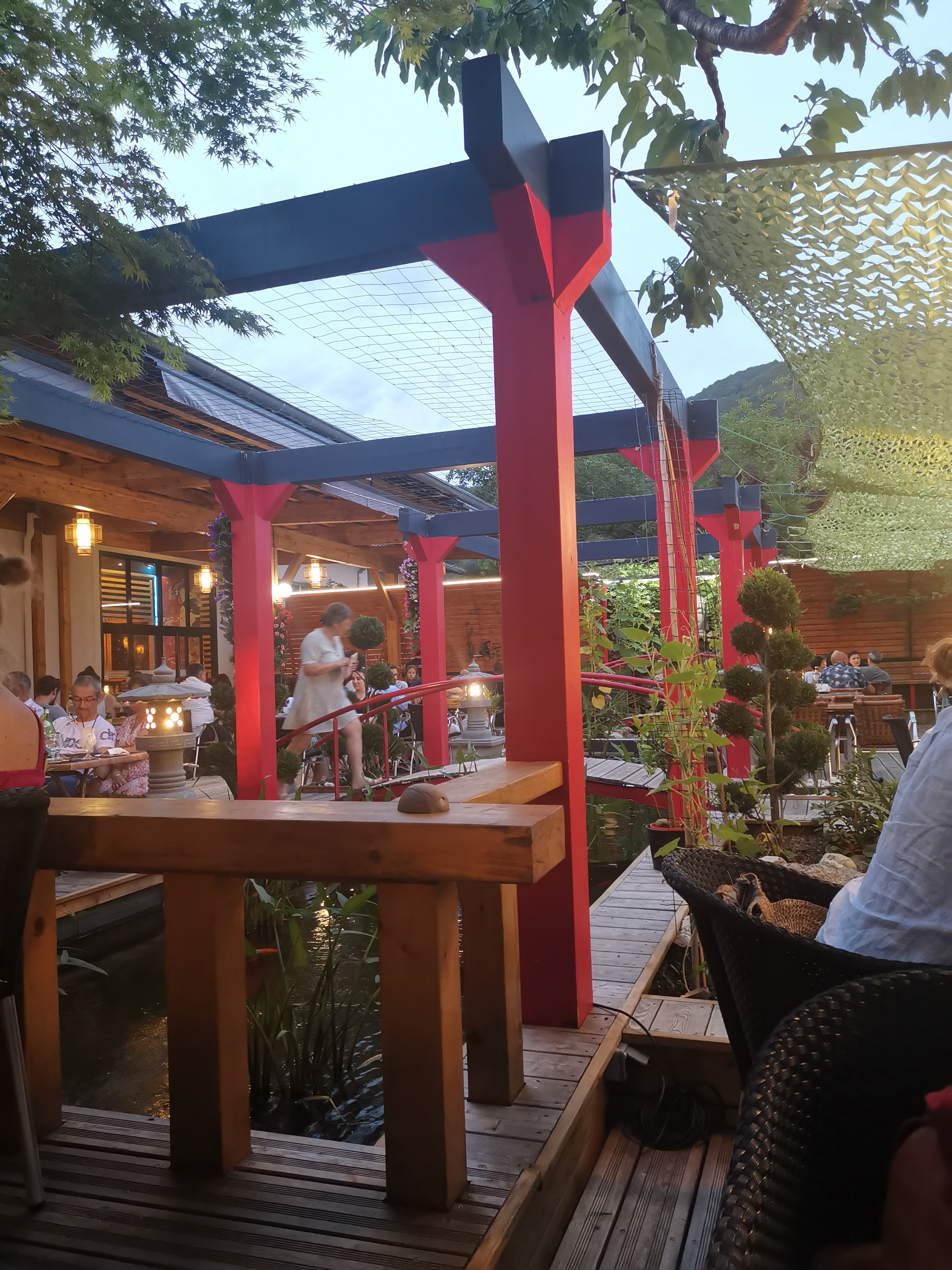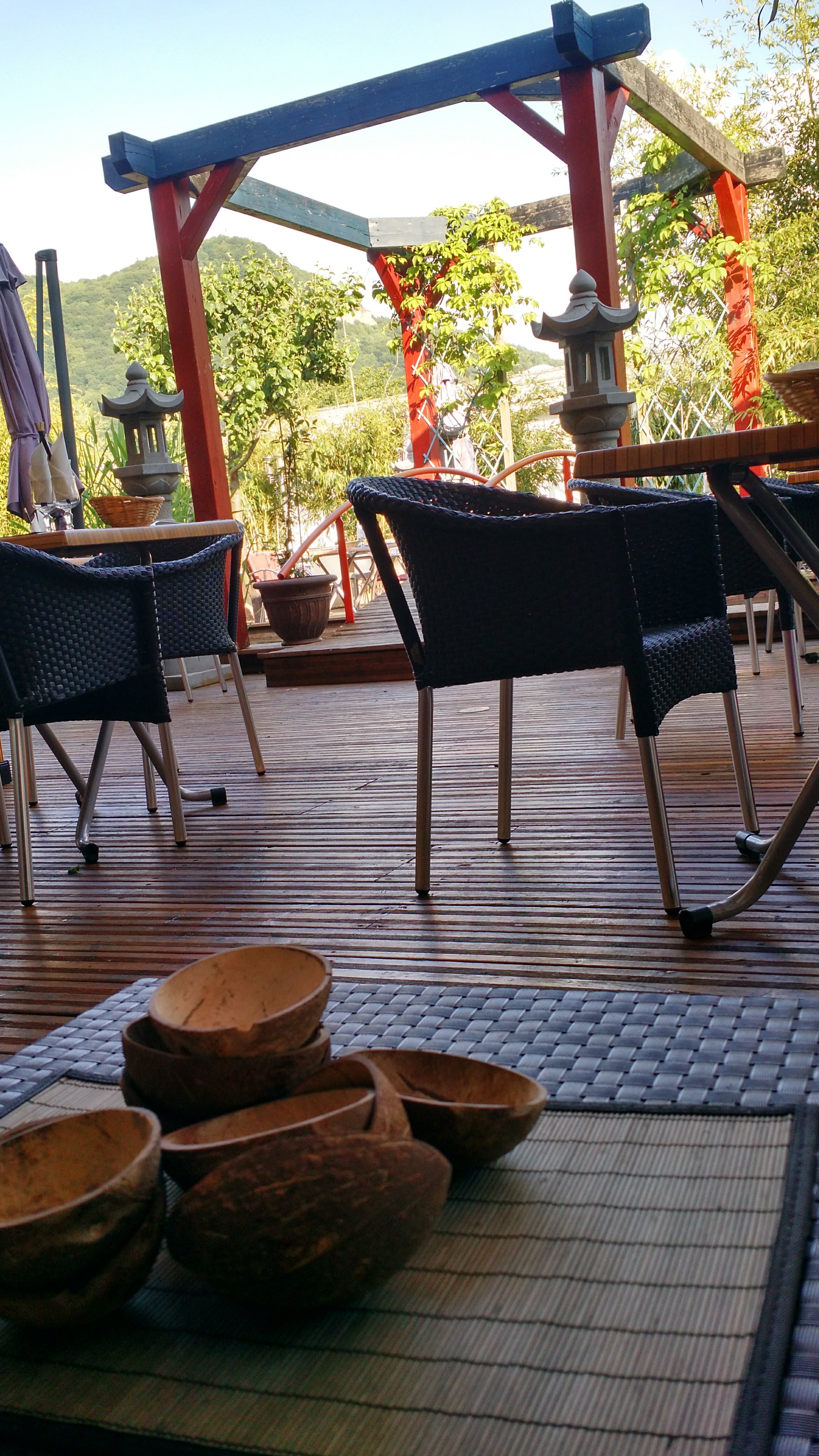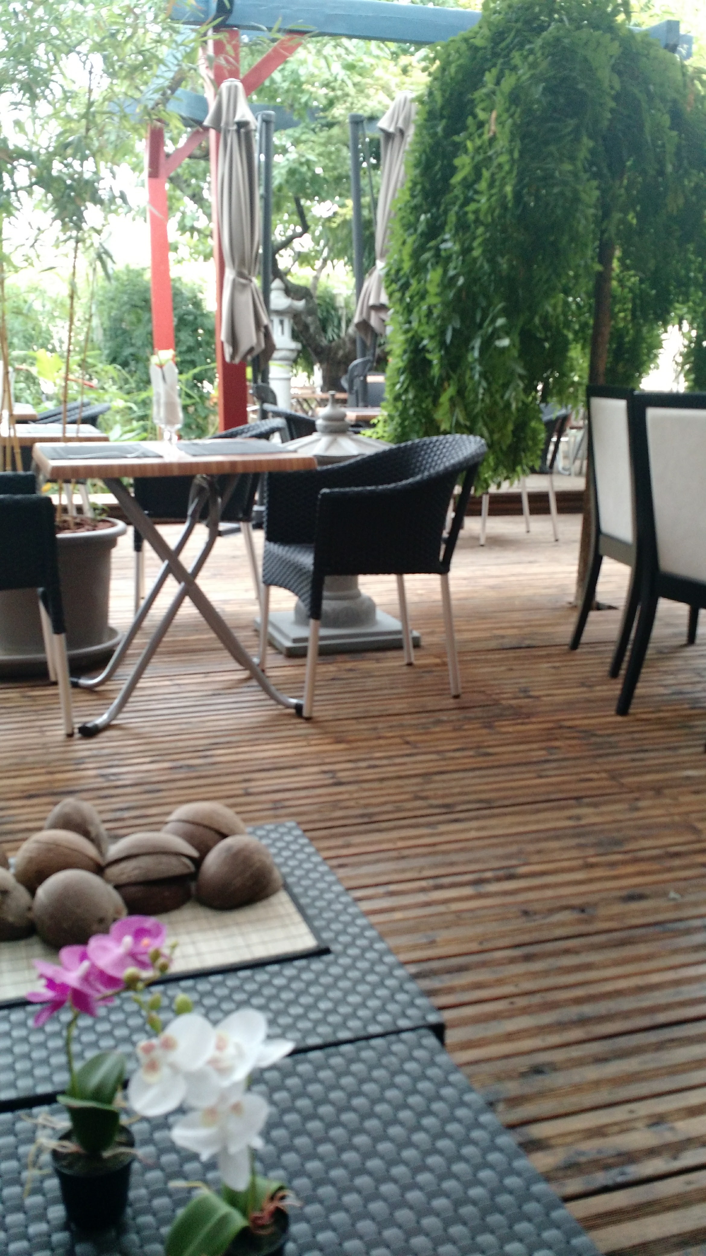 Terrasse idyllique on se croirait vraiment dans un jardin japonais ! Beaucoup de verdures, des cerisiers, des ponts en bois, des bassins à poissons, des lanternes et des coins intimistes. L'interieur est plus classique mais a son charme. Nourriture excellente, fraîche et très seine ce qui rend logiquement le service un peu long. Un grand choix, salade, sushis, nouilles, brochettes, nems etc... De très bons cocktails sont proposés mais attention pensez à réclamer l'apéro car ce n'est pas dans leurs coutumes ! Les prix ont un peu augmentés mais ça reste justifié.