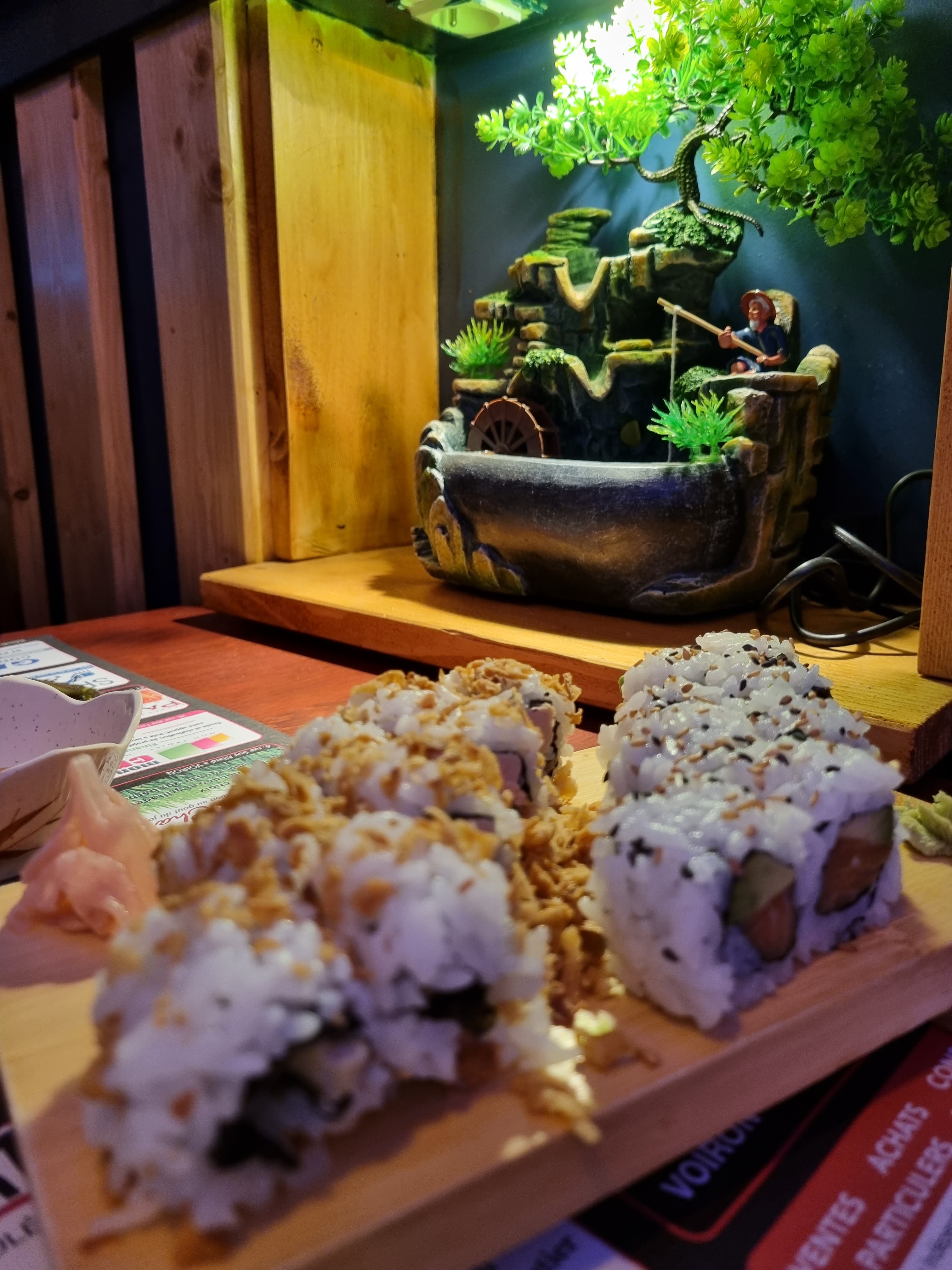 Je m'y suis rendu plusieurs fois, le service est top, l'endroit est très sympathique. On est dépaysé : bassin de poissons, verdures, musique calme. Les plats proposés sont corrects au niveau des quantités . Ils ont une large gamme de sushi, ainsi que de plats asiatique. Les prix sont corrects. Un endroit très sympathique pour passer un bon moment et manger correctement.