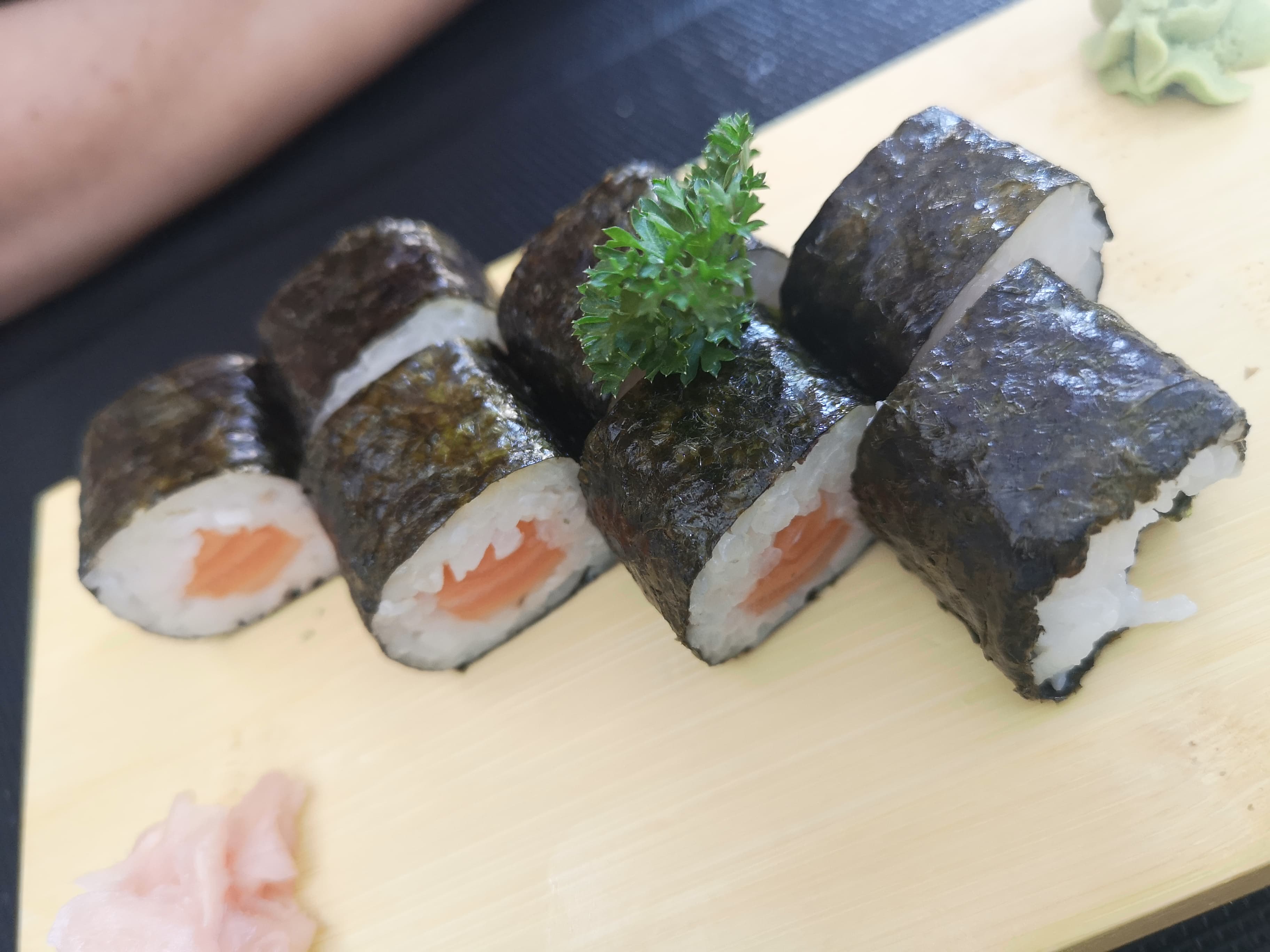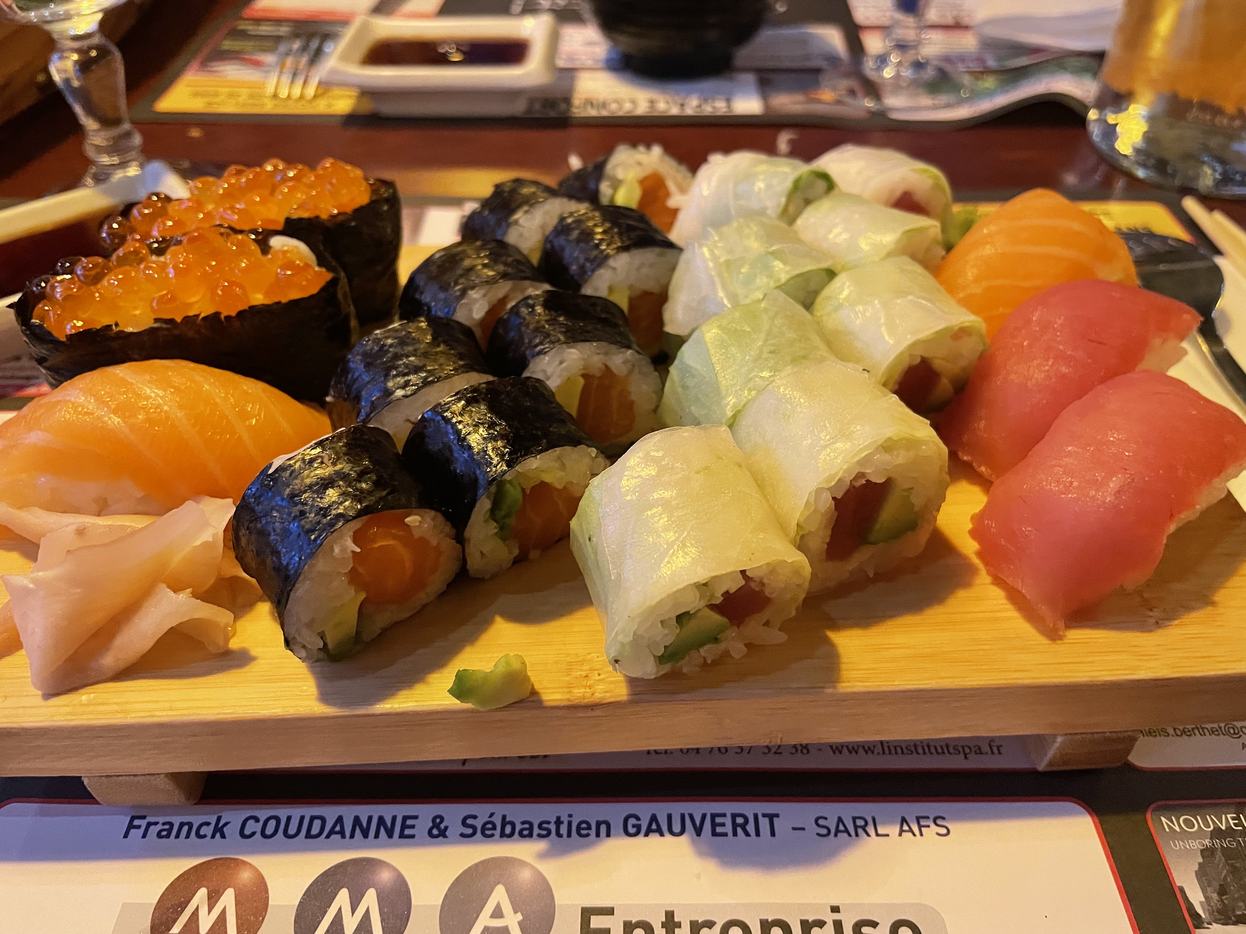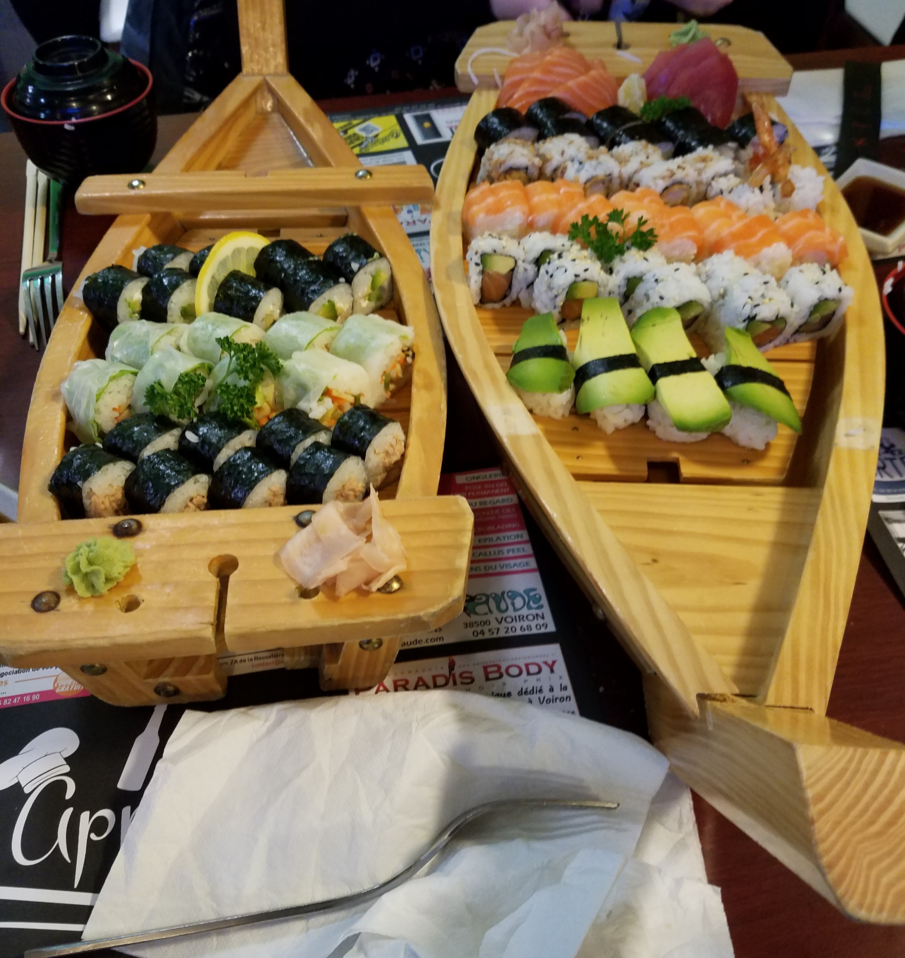 On a pris à emporter. Beaucoup plus jolies que sur les photos du site. Nous nous sommes régalés. Étant des gourmands, on a pris le plus grand plateau pour 2. On en a eu pour notre argent. On a été rassasié. 1 étoile en moin car le wasabi et gingembre un peu juste.