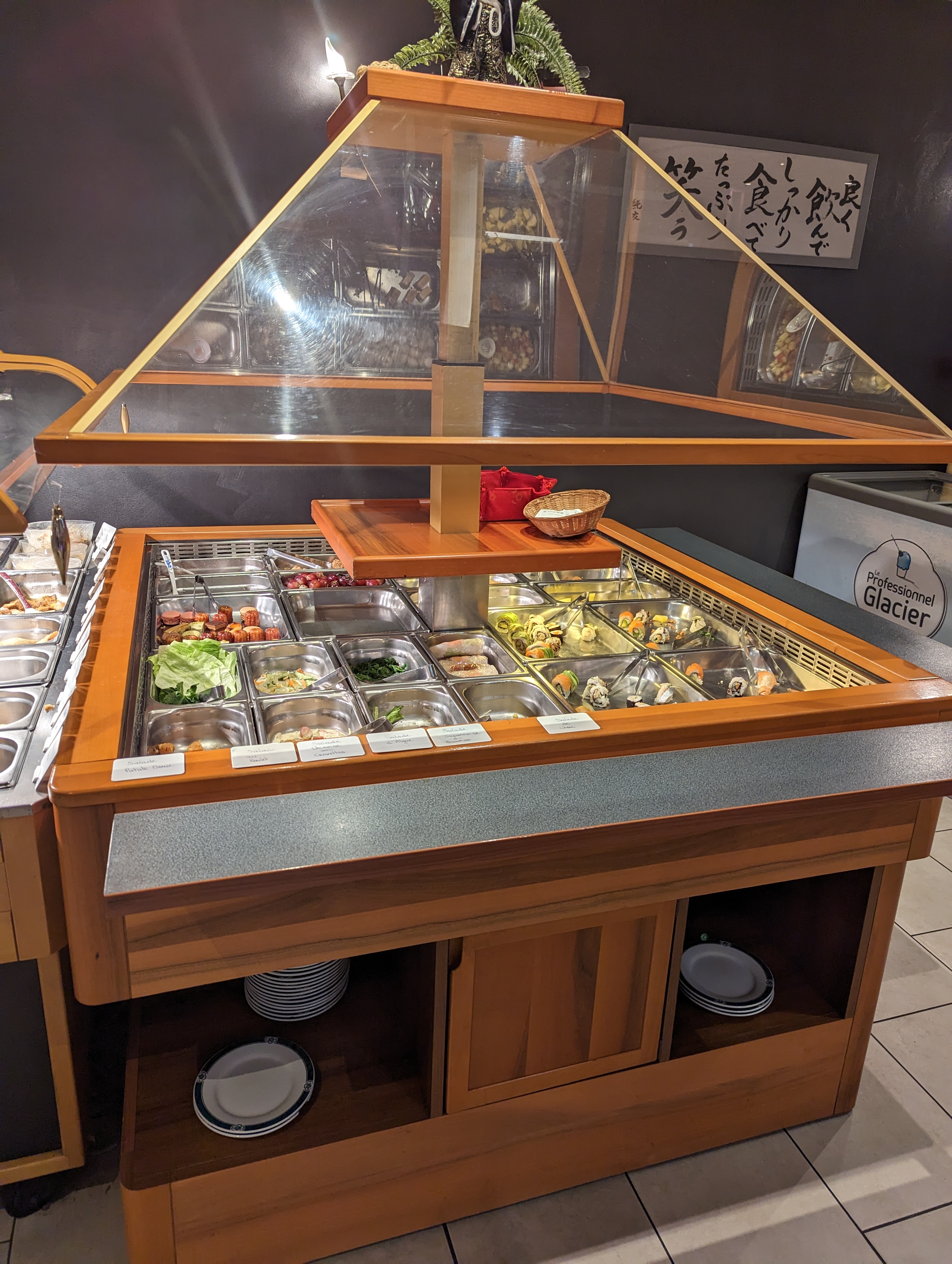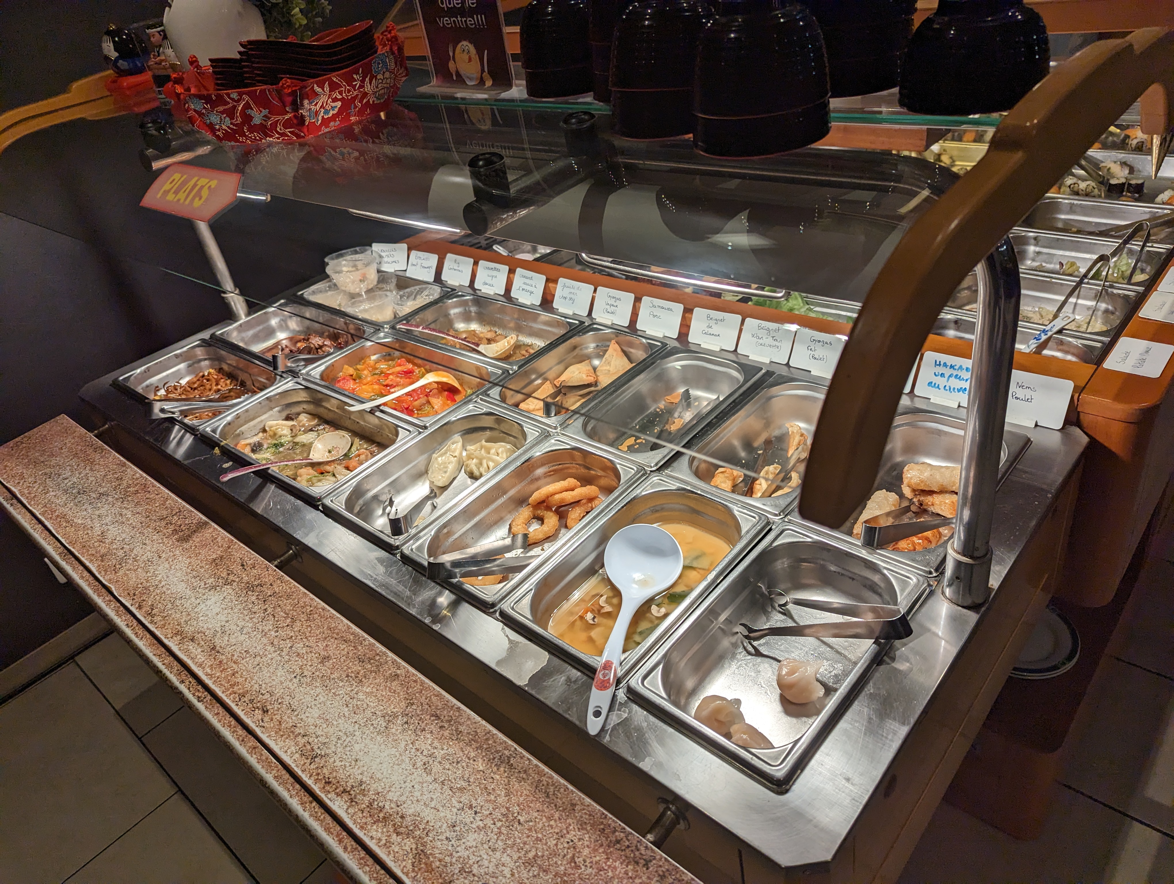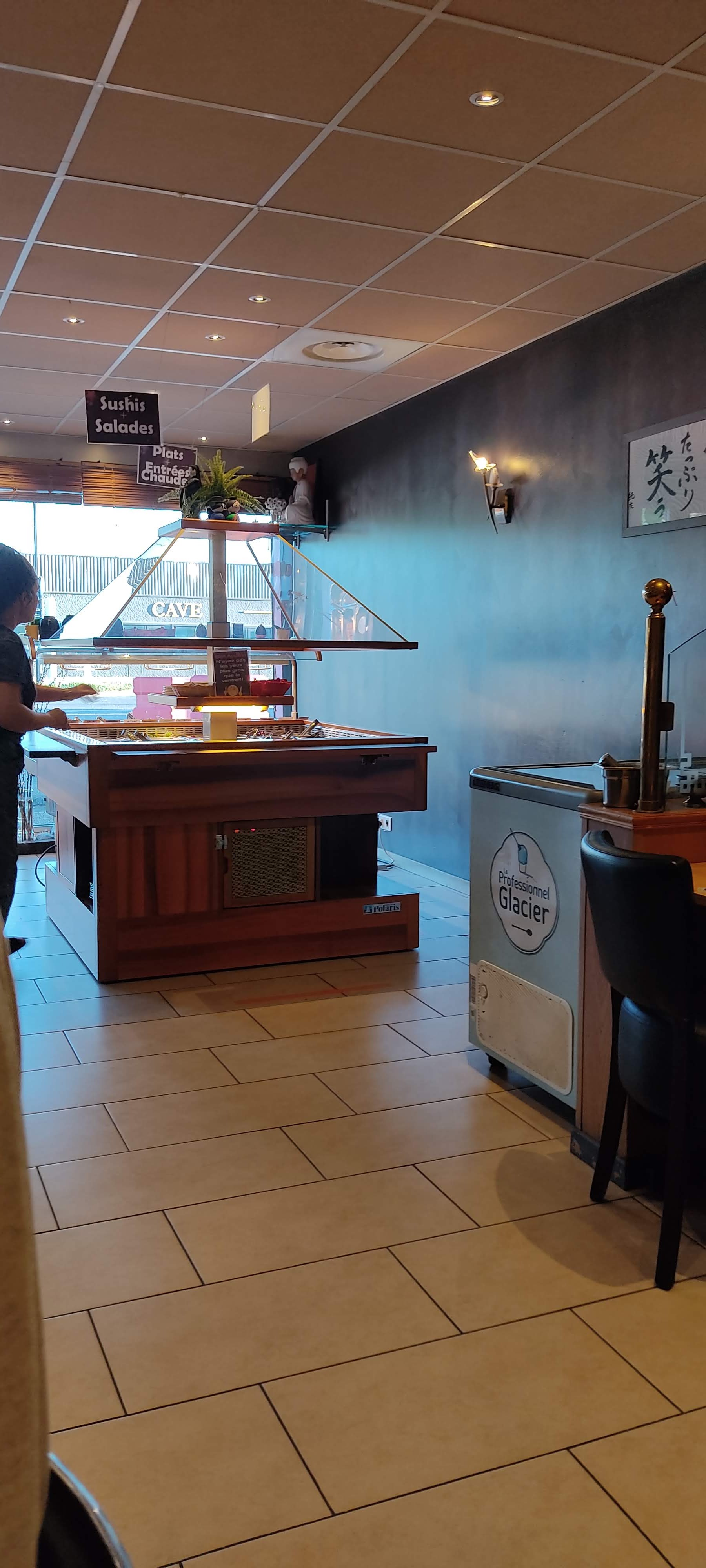 Sur le fond, il manque des classiques : salade de choux simple, d’algues, maki, sushi thon, sashimi, brochette (autre qu’au porc). Le goût n’est pas à la hauteur, malheureusement. Ni la composition. Il y a trop de riz. La partie desserts est décevante : il y a des fruits frais et ça c’était cool. Mais le reste n’est pas ouf : pot de yahourt, compotes, glaces, bref rien de japonais. On veut des mochii ou des desserts traditionnels s’il vous plait ! Sur la forme, l’équipe est serviable et accueillante. Rien à dire ! La décoration du restaurant n’est pas belle. Certaines assiettes sont ébréchées. En résumé, si vous aimez la nourriture japonaise vous serez déçus. D’autres buffets à volonté font mieux et pour le même prix. Je ne pense pas avoir consommé pour 18,90€