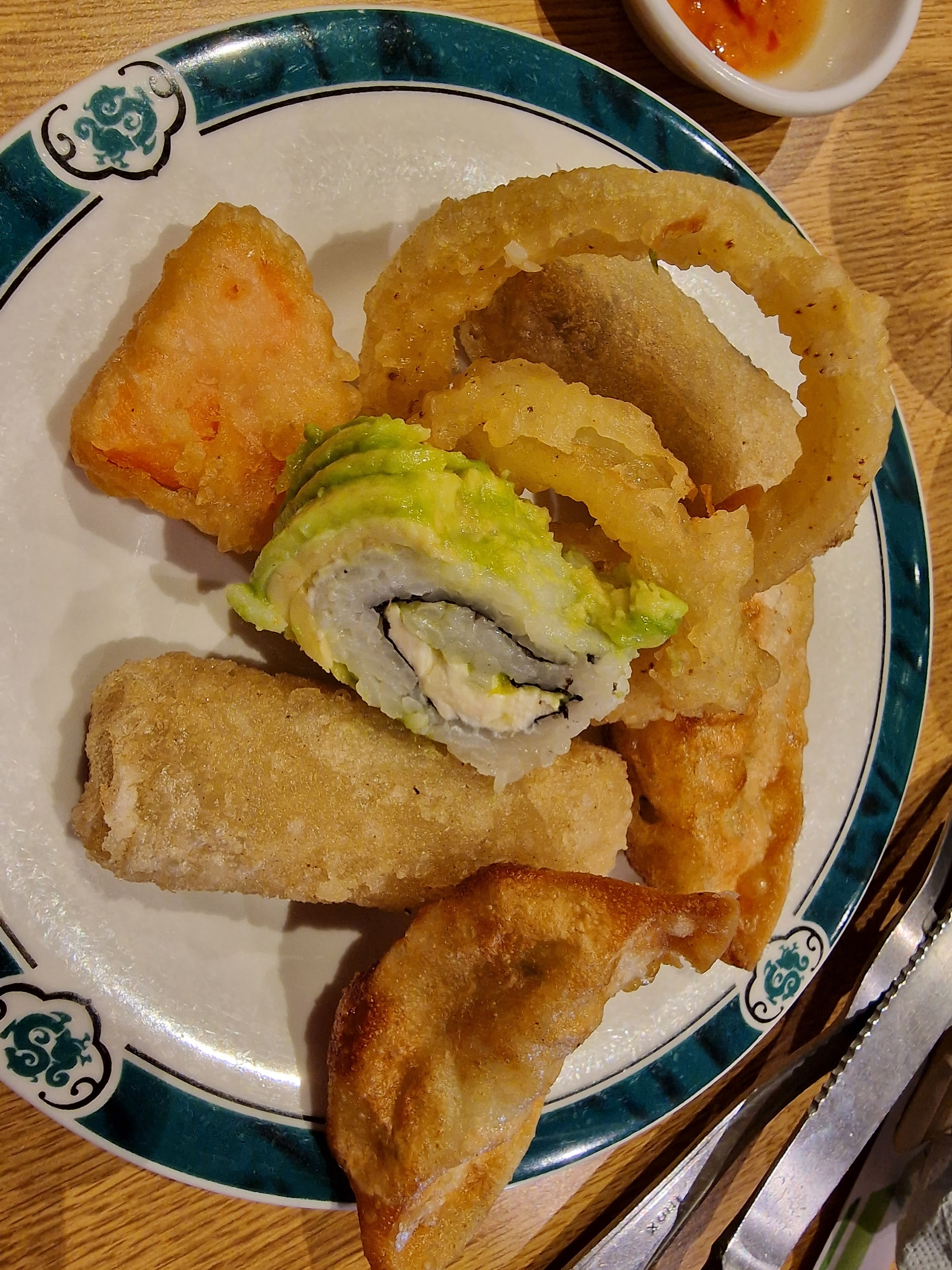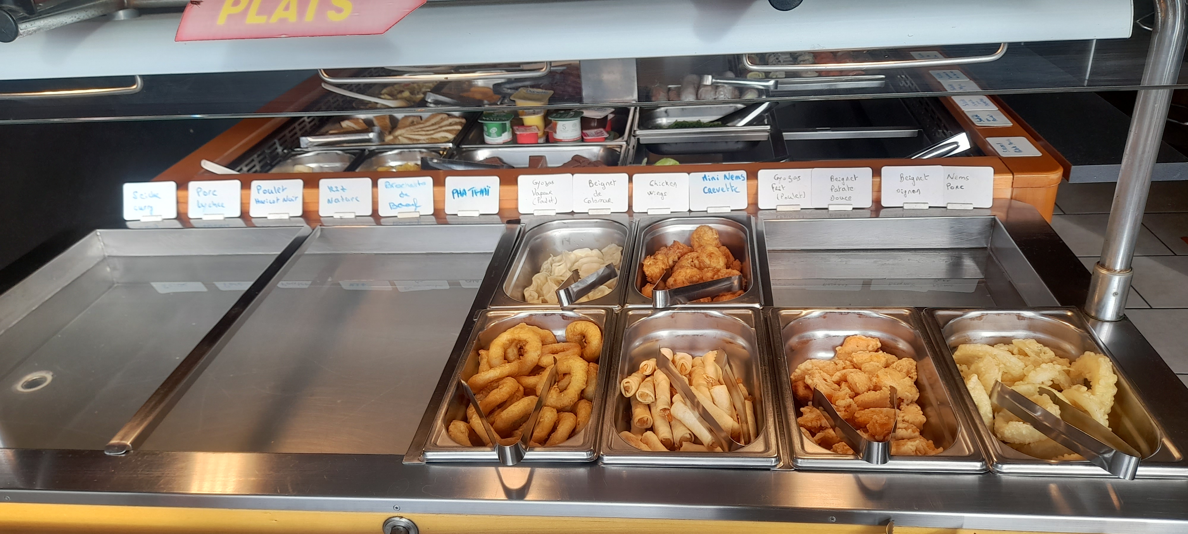 Large choix d'entrées (salades, boulettes, patate douce) et de desserts a volonté (pleins de petit gâteaux, macarons etc). Le bar avec les petites assiettes de sushi sont assez variées et amènent un peu de piquant et d'inconnu a une soirée qui peut être banale. En revanche petit conseil, mettez vous du côté du mur pour le bar pour choper les assietes le plus rapidement possible. Sinon des fois il est possible de se faire sucrer une target lointaine.