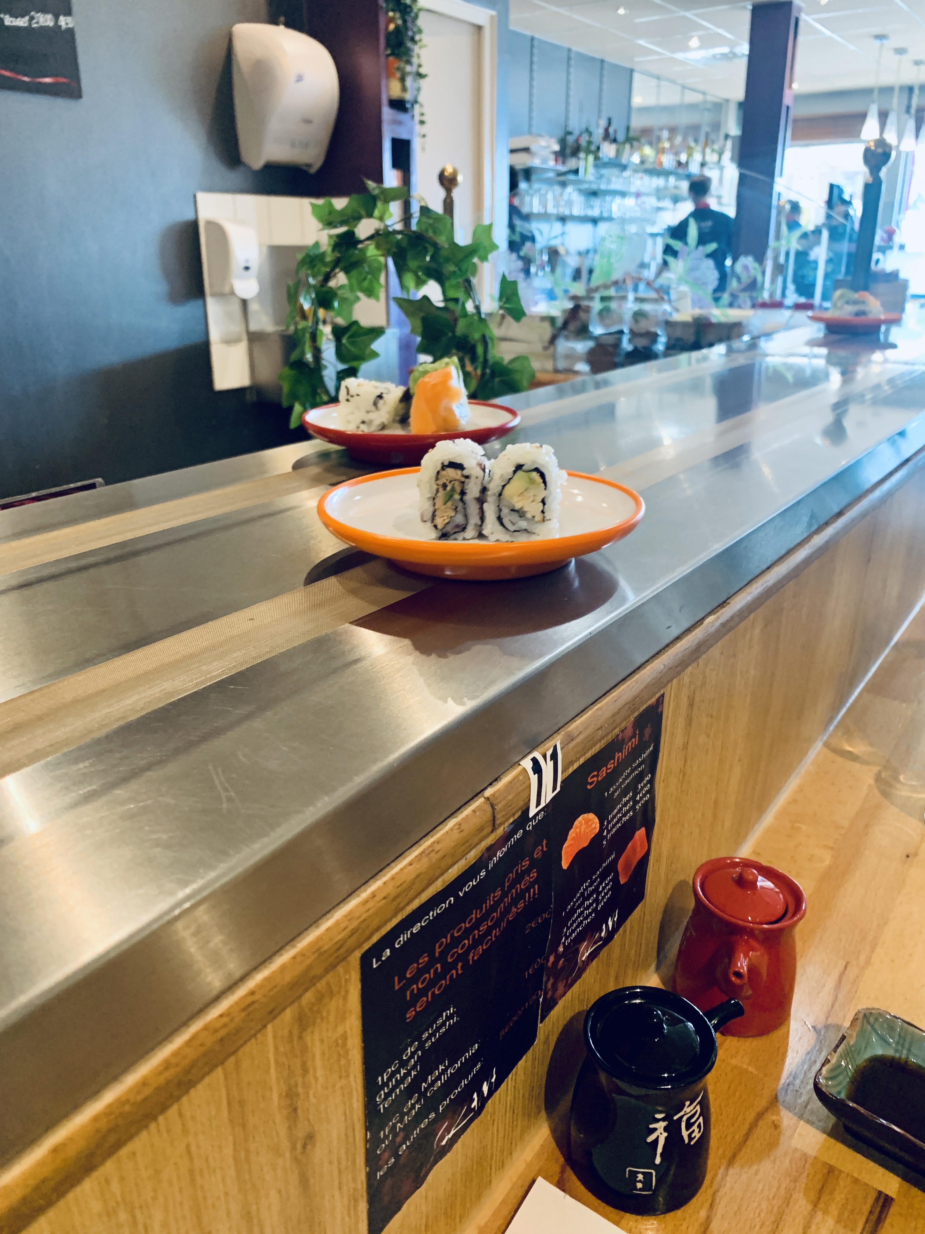 Au premier abord, la face du restaurant fait vraiment peur. Mais belle surprise lorsque nous sommes entrés. Tables directement en face du tapis roulant, proche du maître sushi. Buffet assez peu conséquent, il faut plu venir pour les sushis, mais les plats sont vraiment de très bonne qualité Déçue que le contenu du buffet change selon les semaines… déçue de ne pas avoir eu l’info avant de venir surtout, j’en attendais beaucoup de la brochette viande fromage. Le tarif de la formule à volonté change selon le jour de la semaine, passer de 18euros à 26 c’est très excessif, et pas vraiment justifiée.
