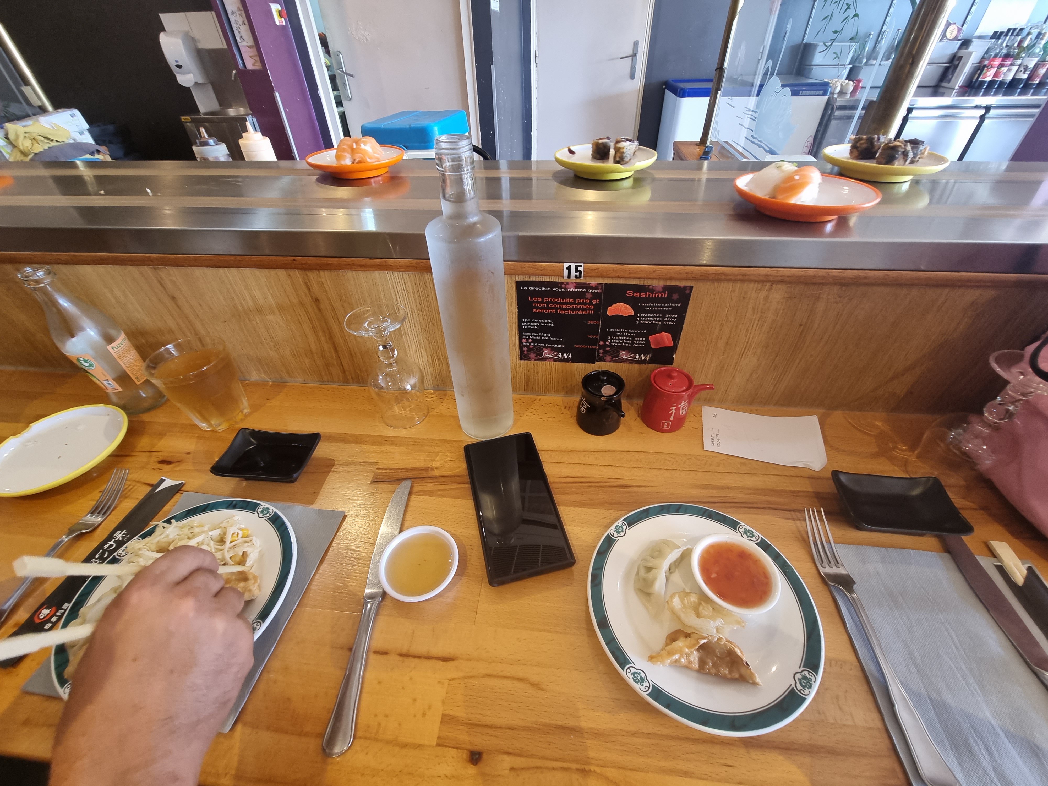 Ambiance sympa avec table tournante et robot ainsi que les WC japonais Buffet vide et peu garni Serveuse pas aimable Prix cher par rapport à quantité et qualité
