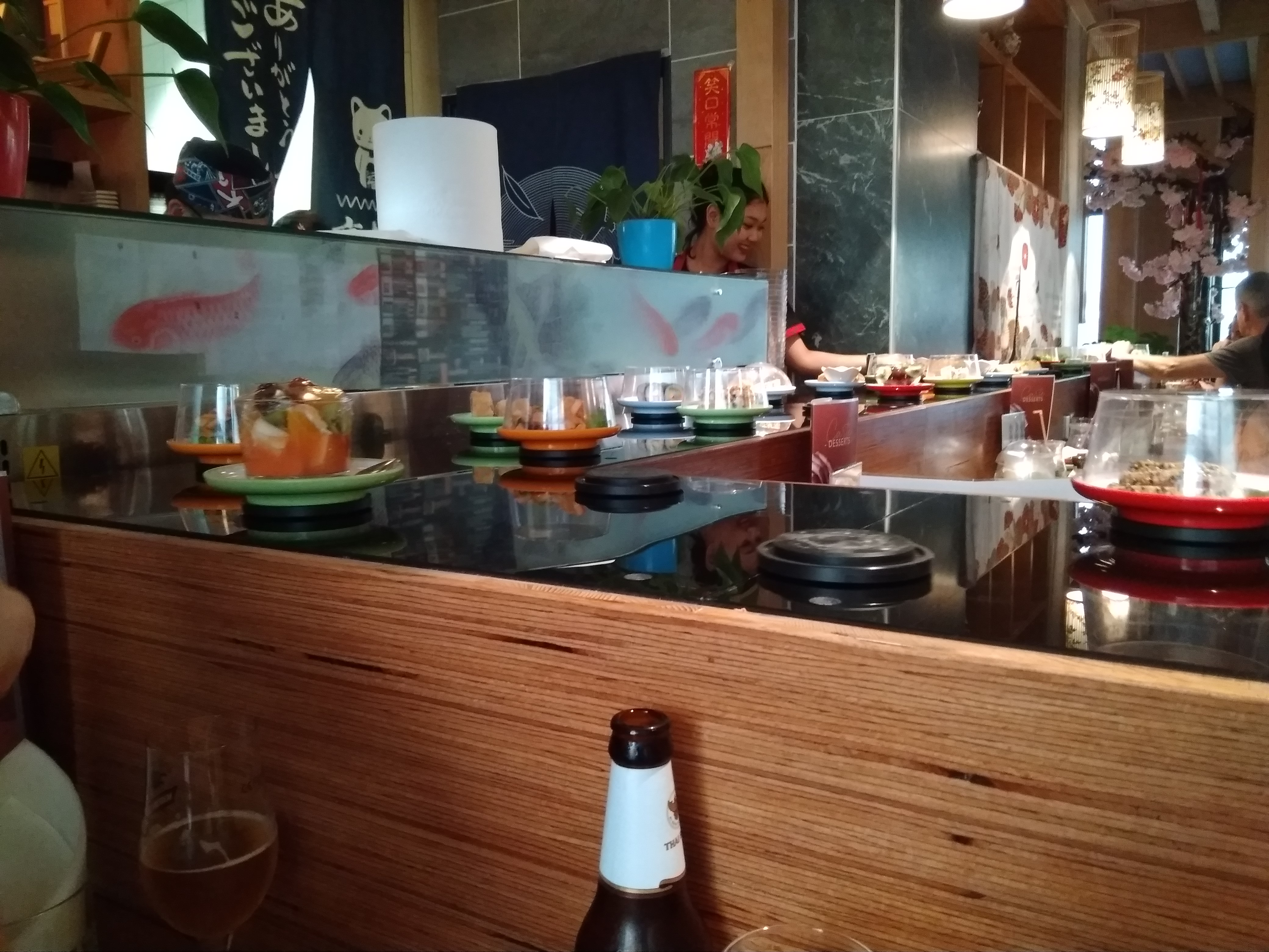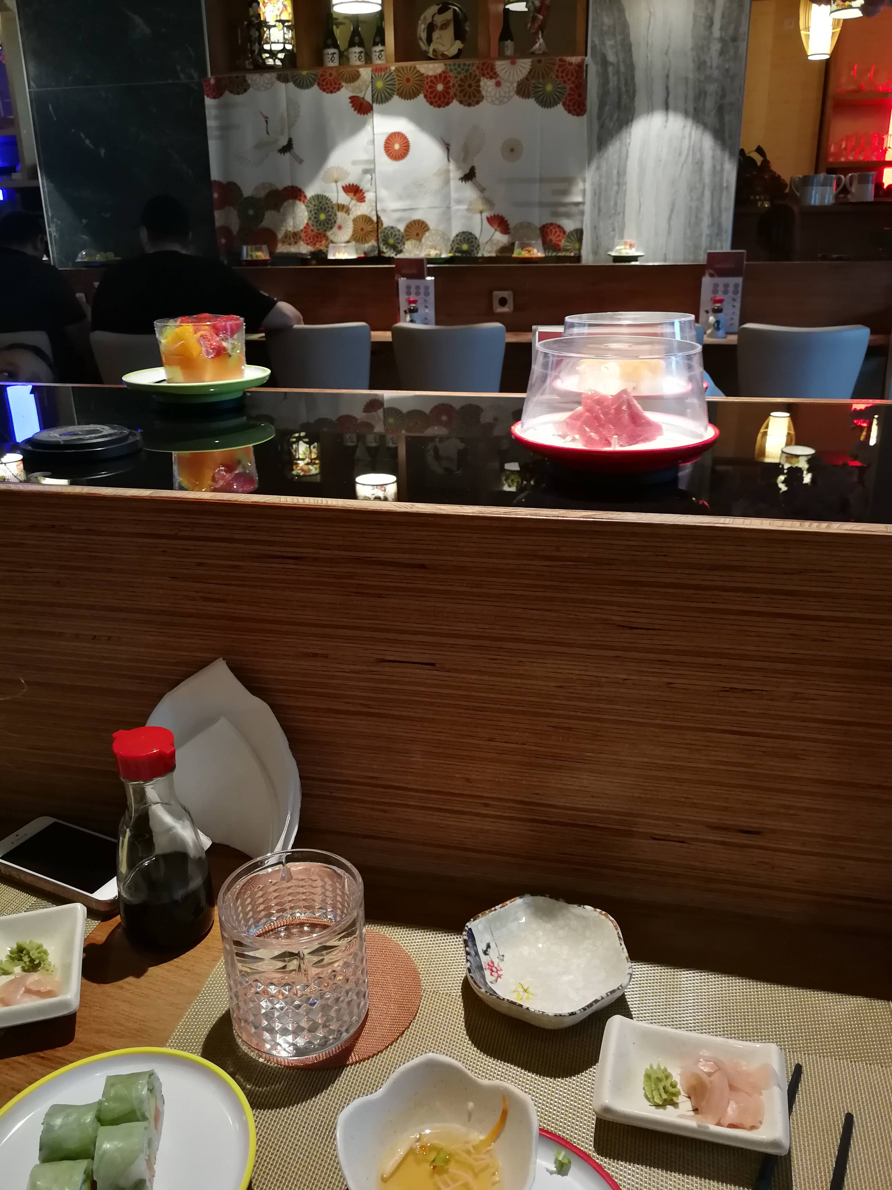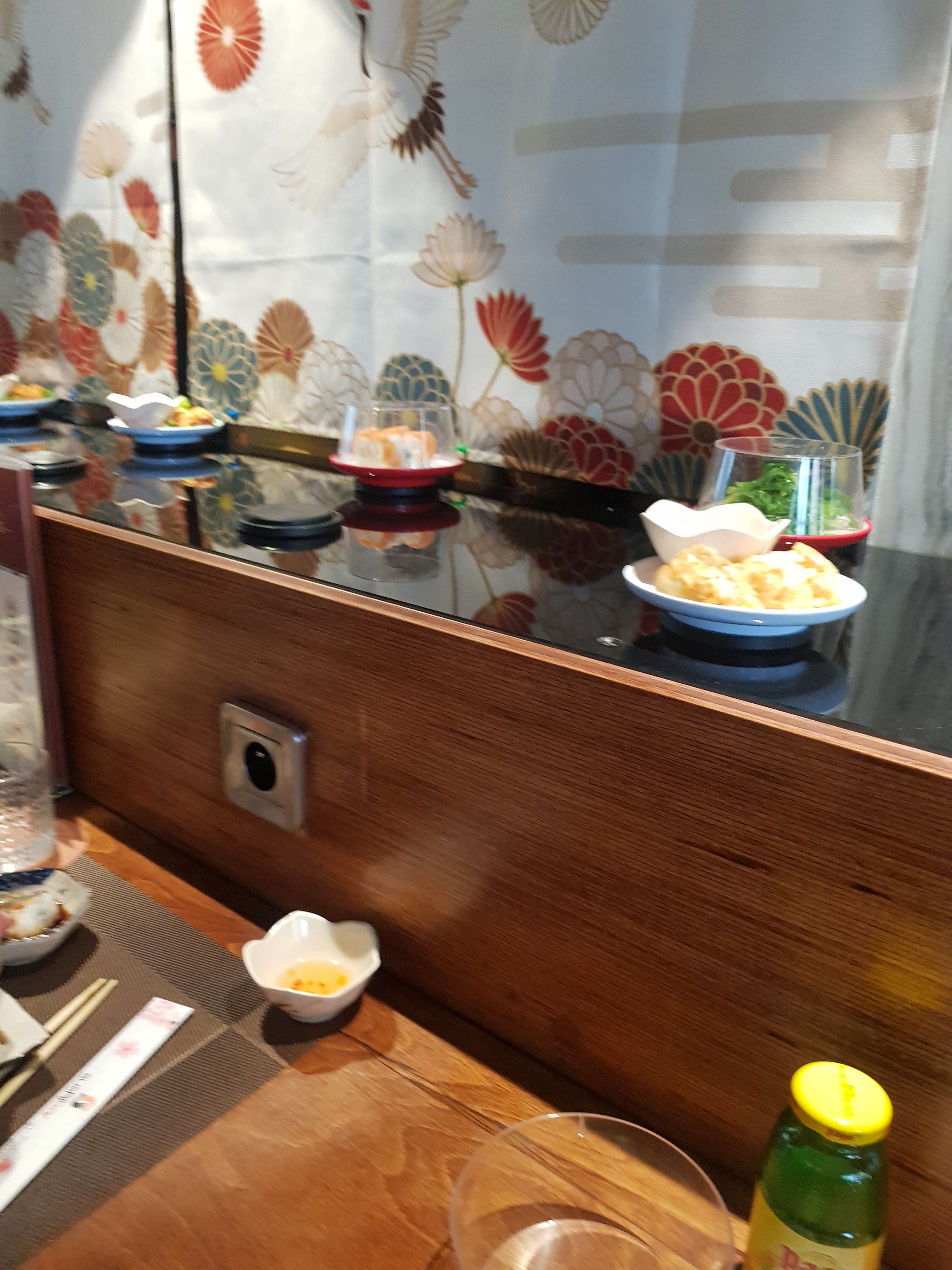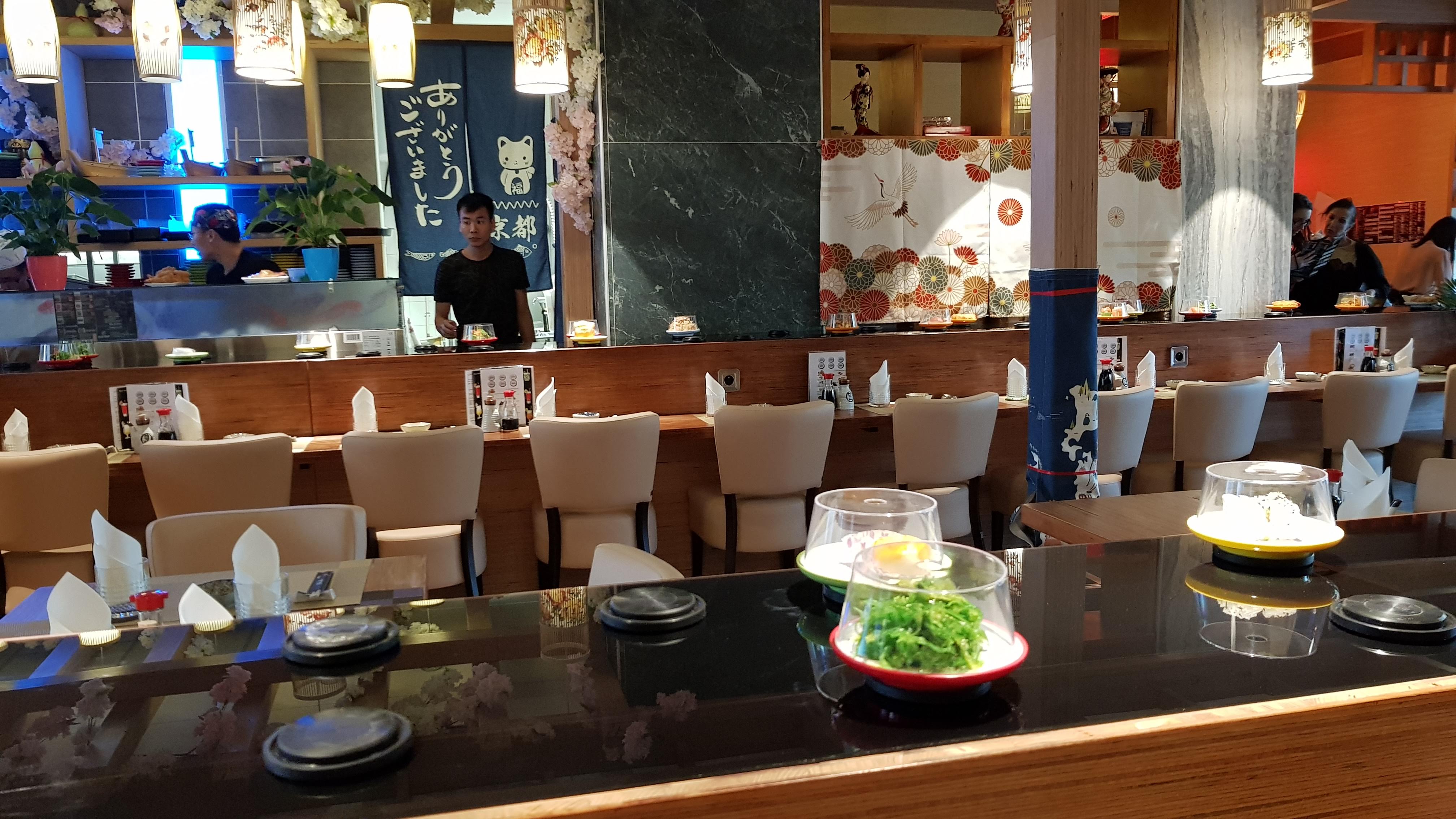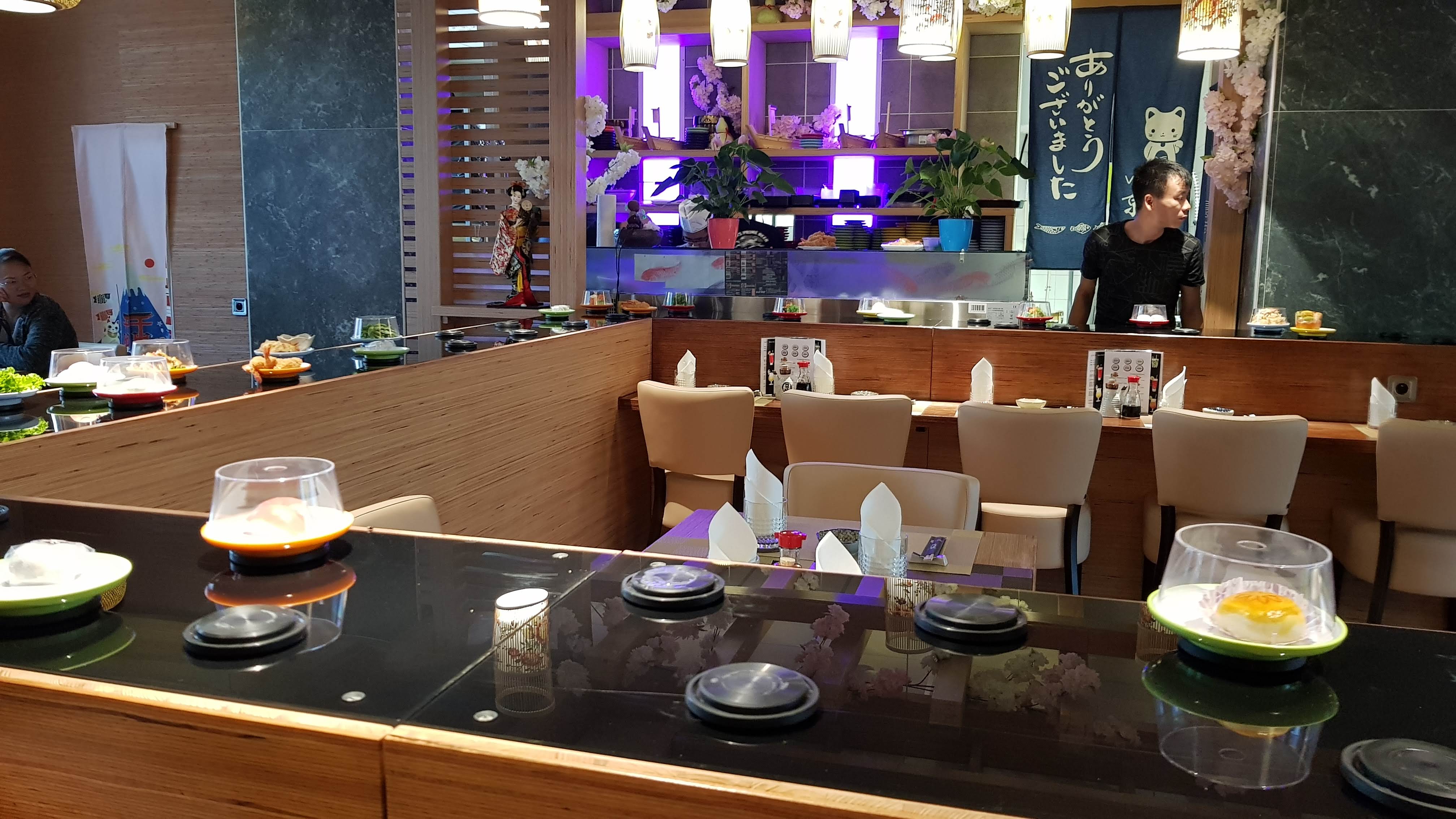 Sushi sur un tapis roulant l intérieur est sympa sans plus. La jeune femme qui débarrasse ne prête pas attention à vous. Attention a la caisse une erreur de comptage des assiettes arrive très vite. La qualité est médiocre pas mieux qu en supermarché.