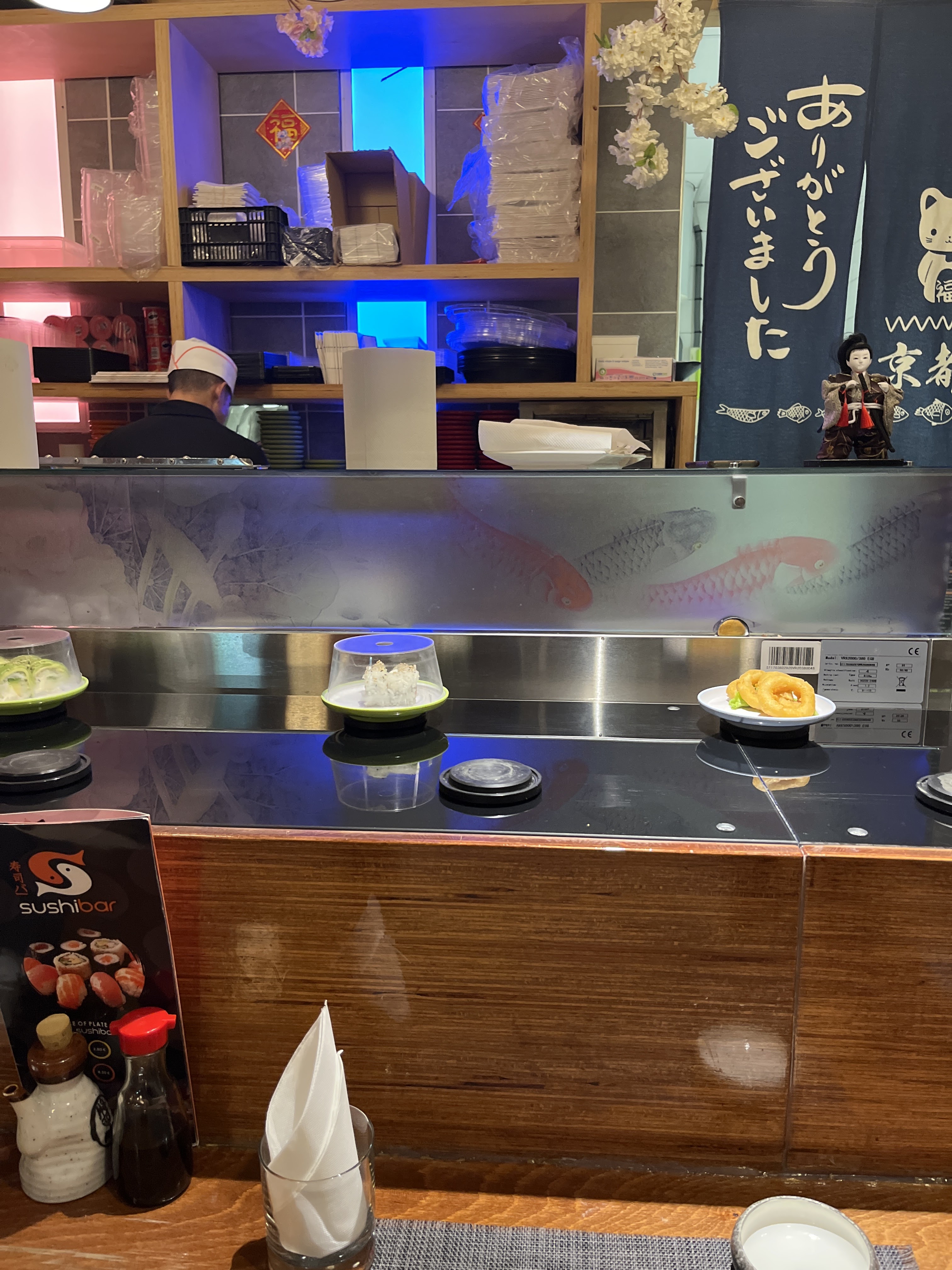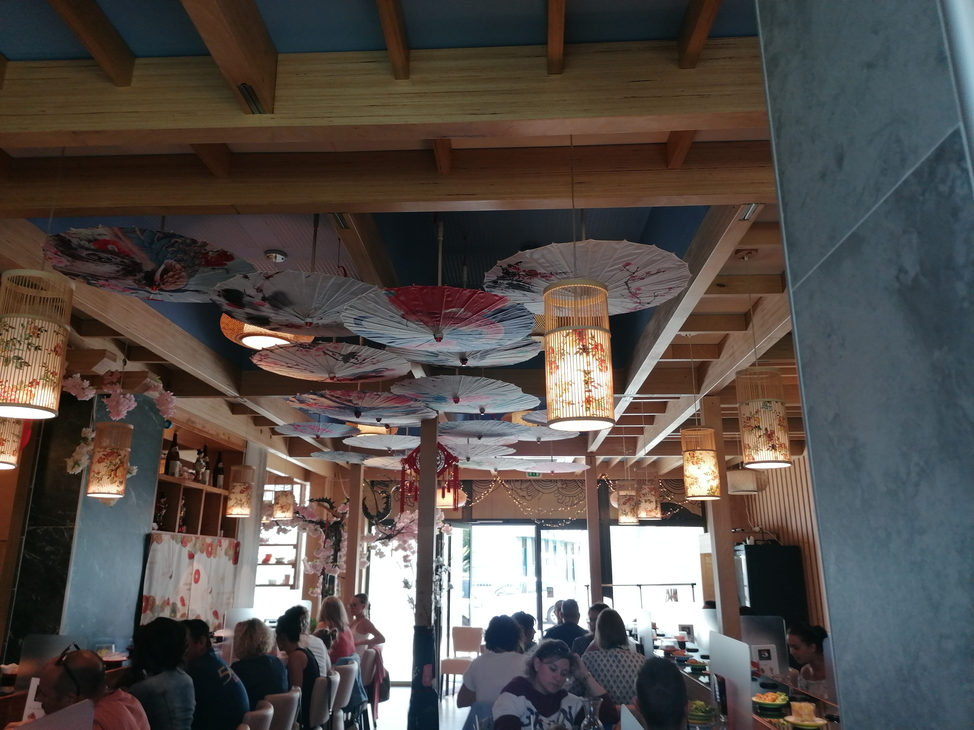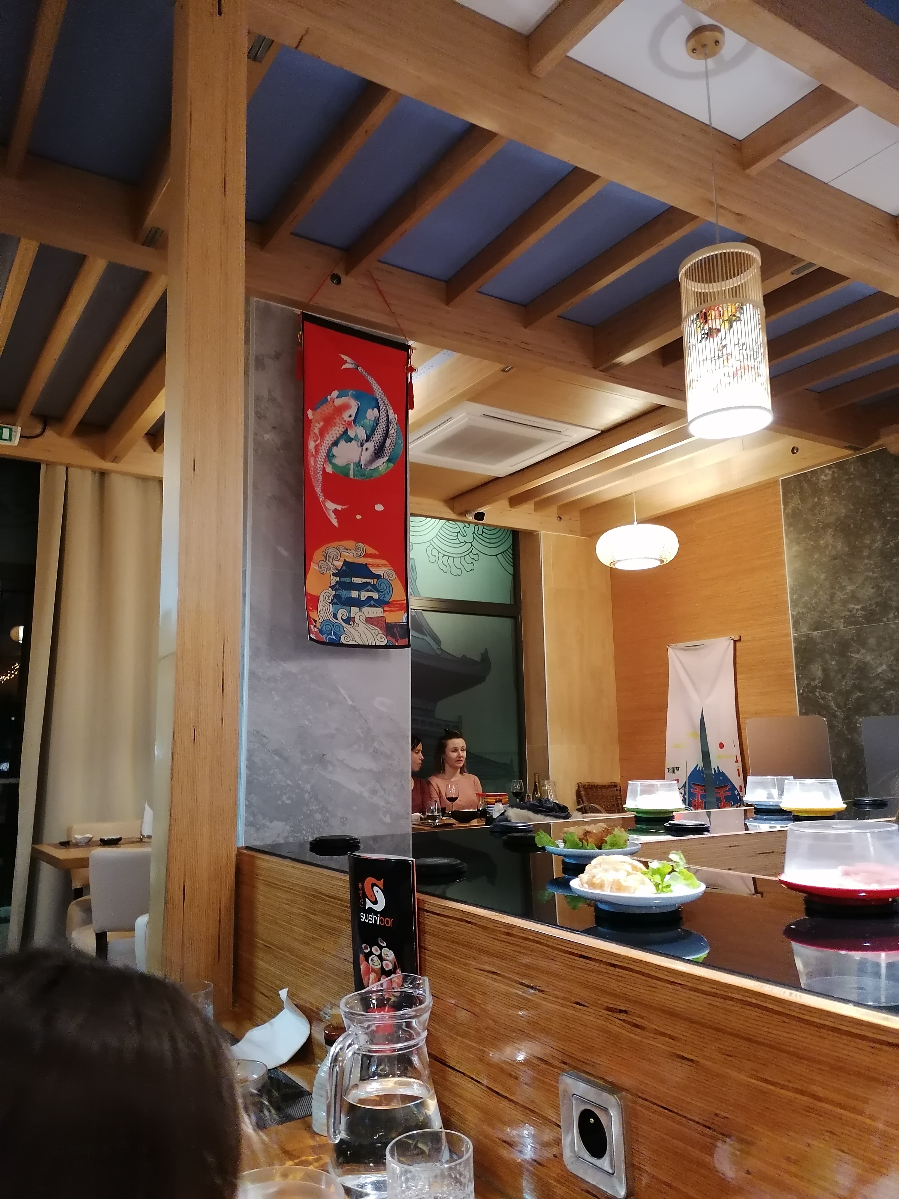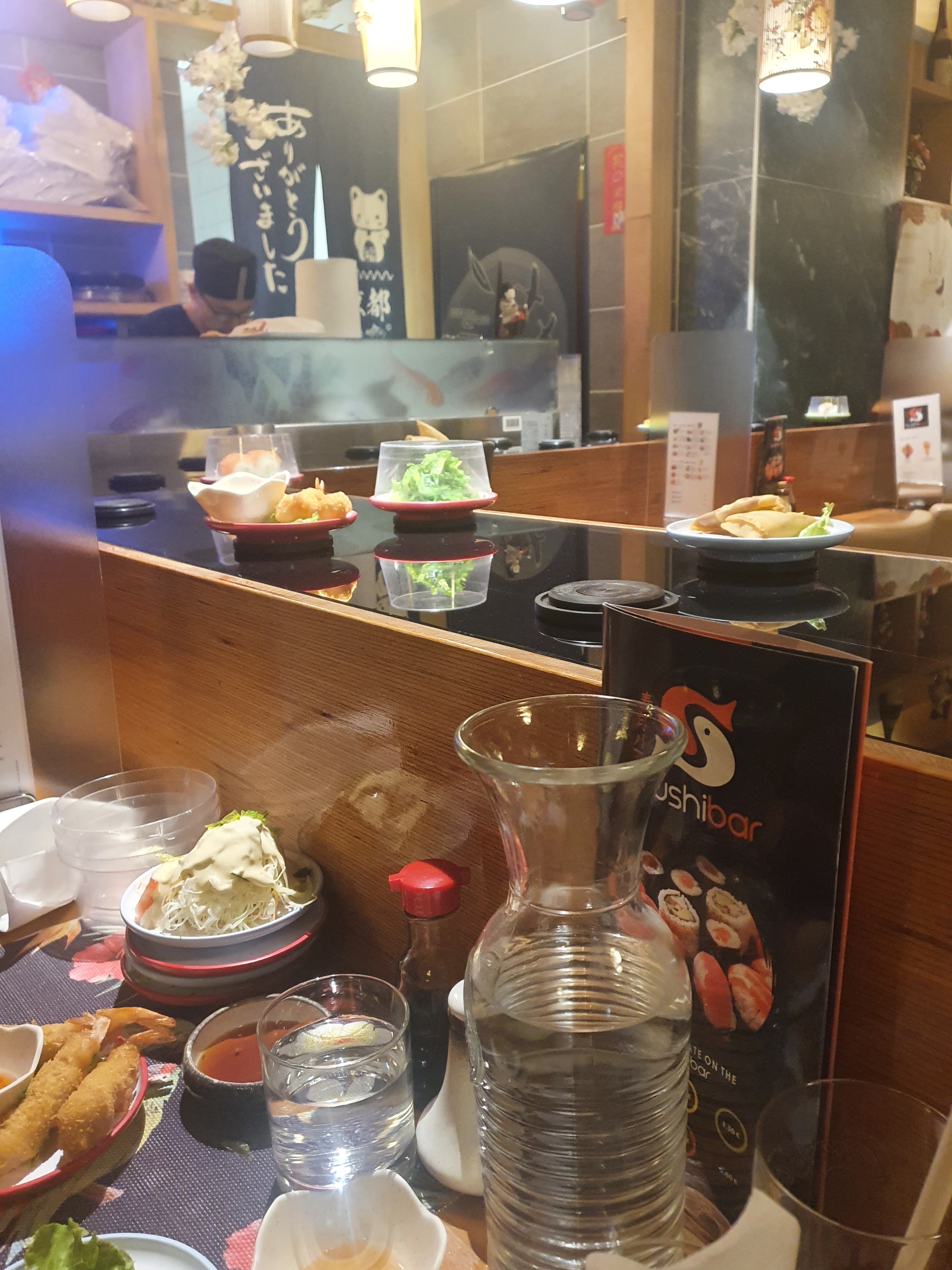 Sushi sur un tapis roulant l intérieur est sympa sans plus. La jeune femme qui débarrasse ne prête pas attention à vous. Attention a la caisse une erreur de comptage des assiettes arrive très vite. La qualité est médiocre pas mieux qu en supermarché.