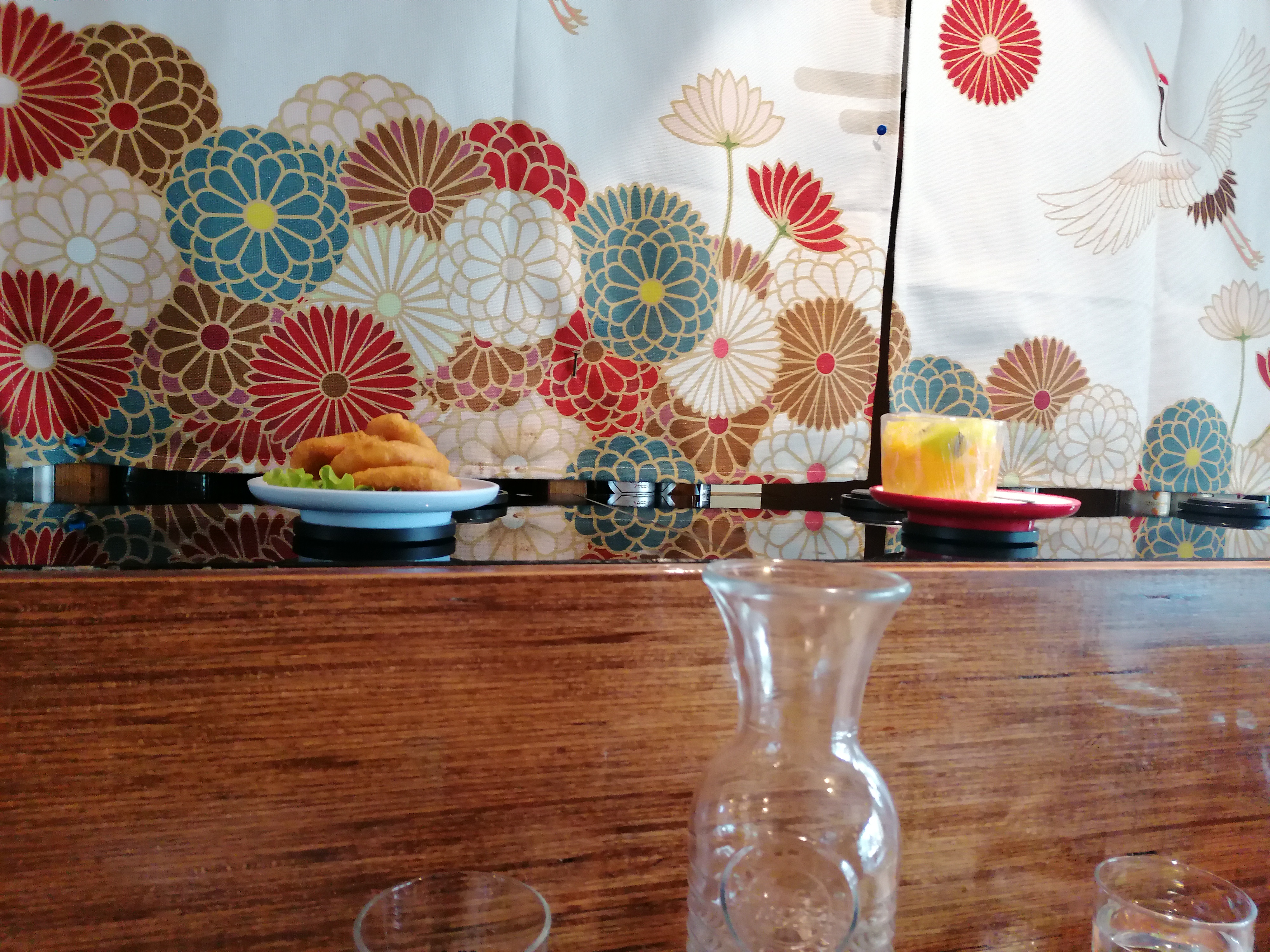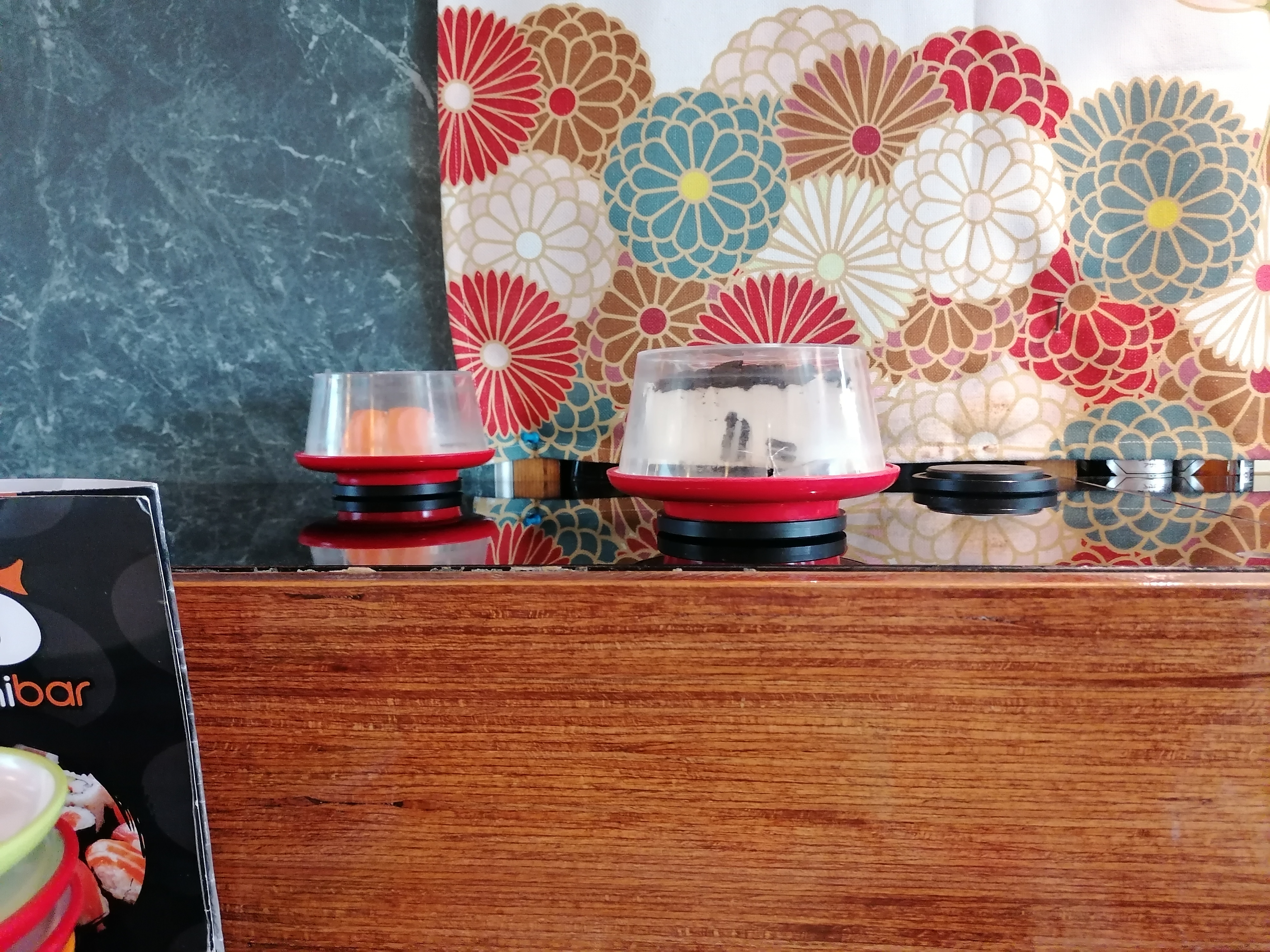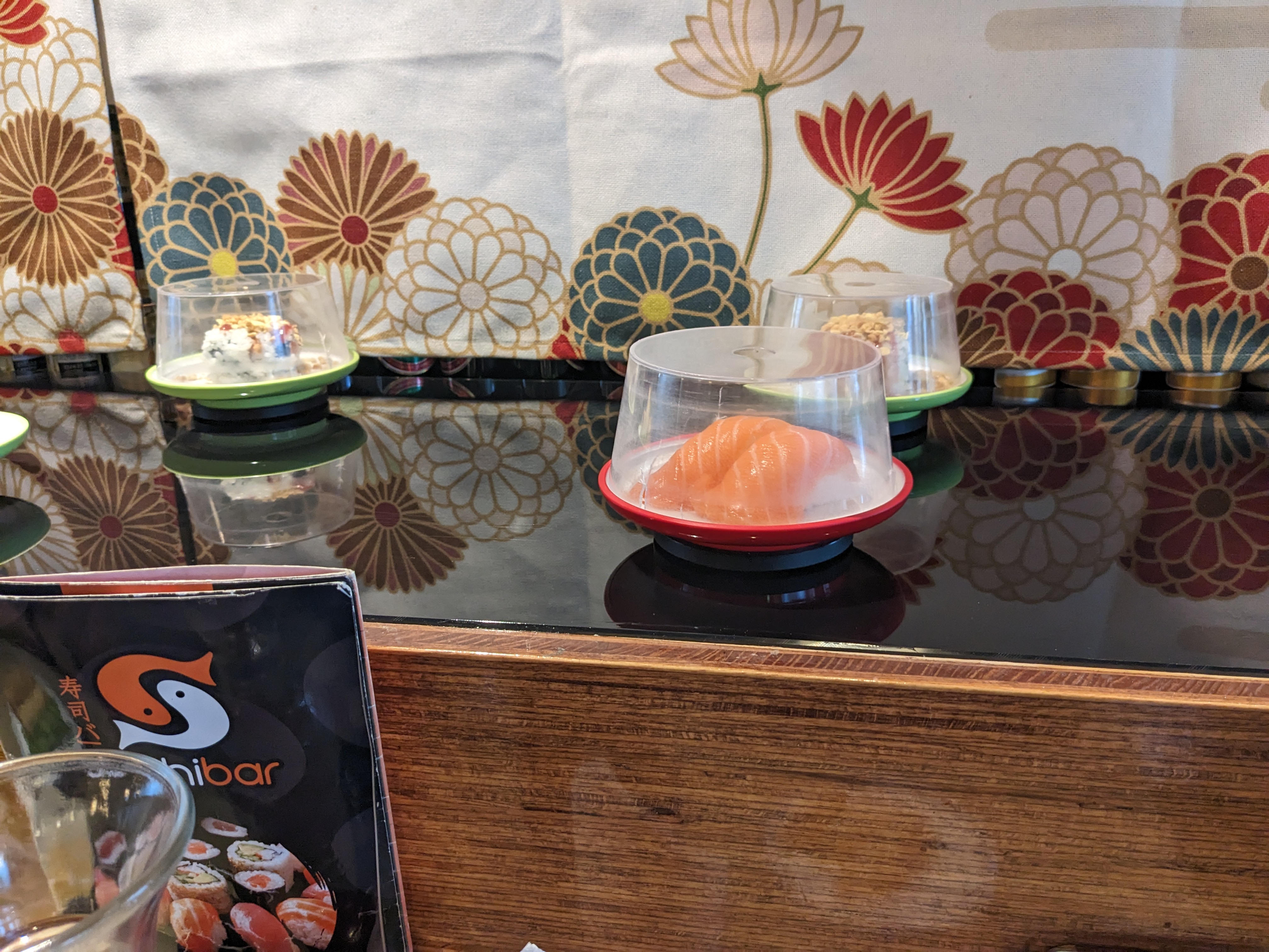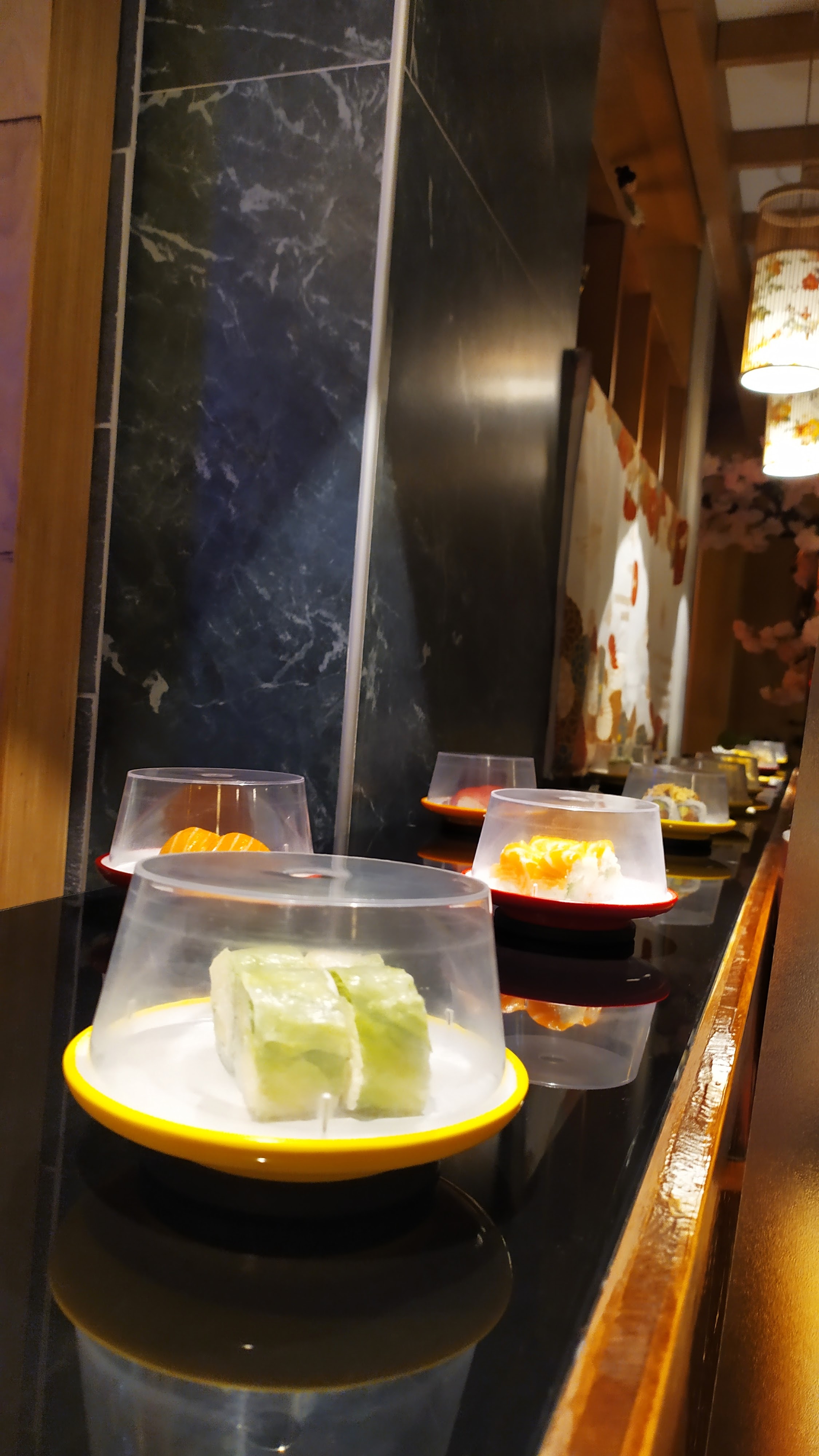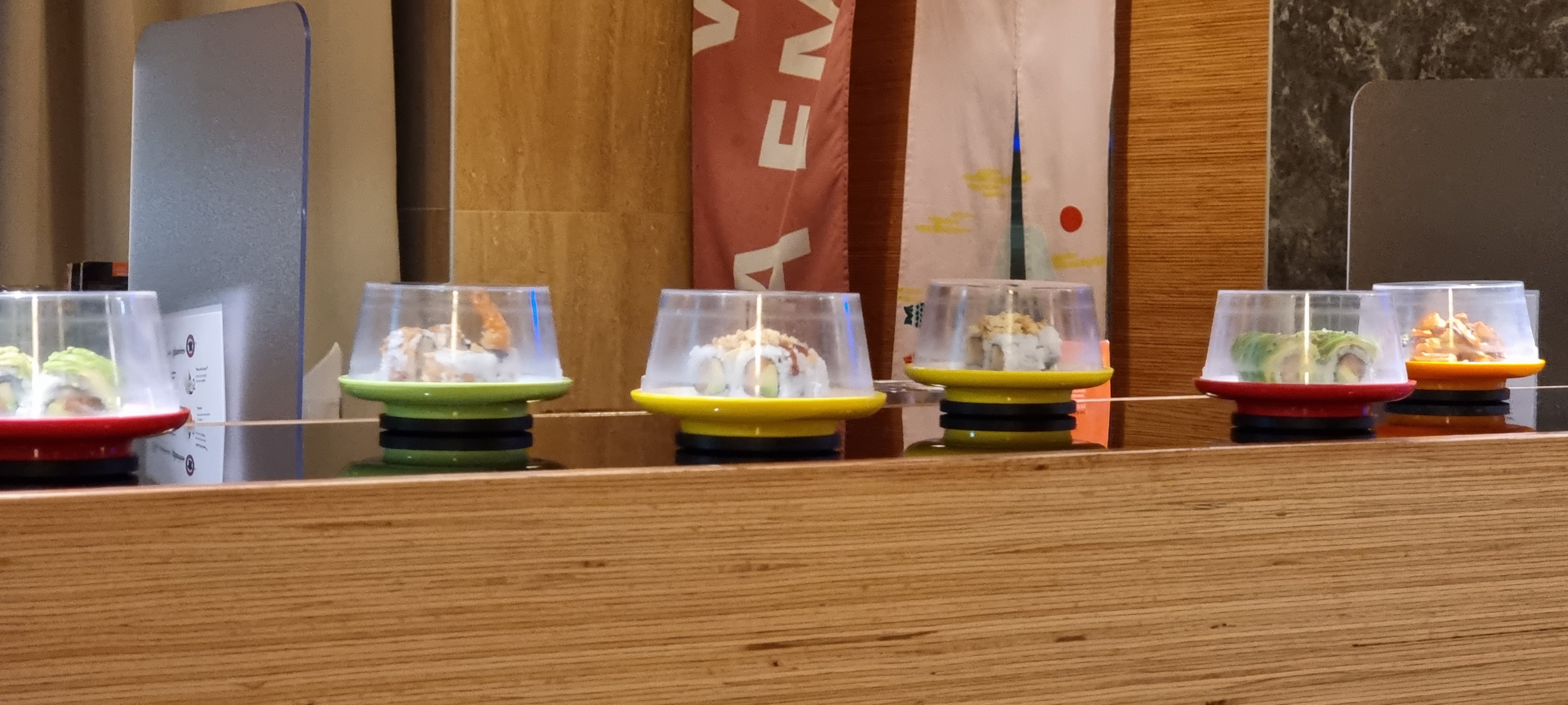 Sushi sur un tapis roulant l intérieur est sympa sans plus. La jeune femme qui débarrasse ne prête pas attention à vous. Attention a la caisse une erreur de comptage des assiettes arrive très vite. La qualité est médiocre pas mieux qu en supermarché.