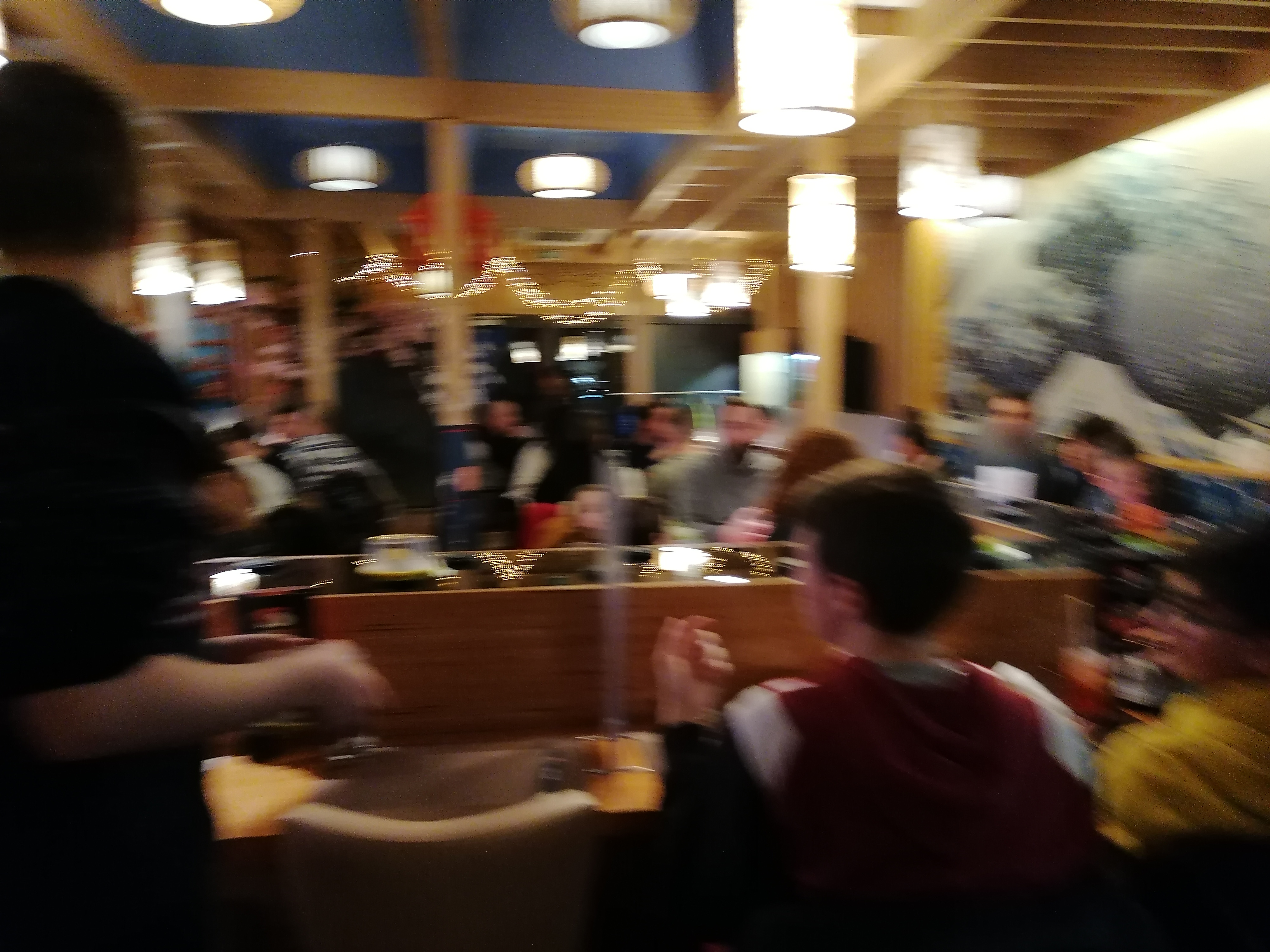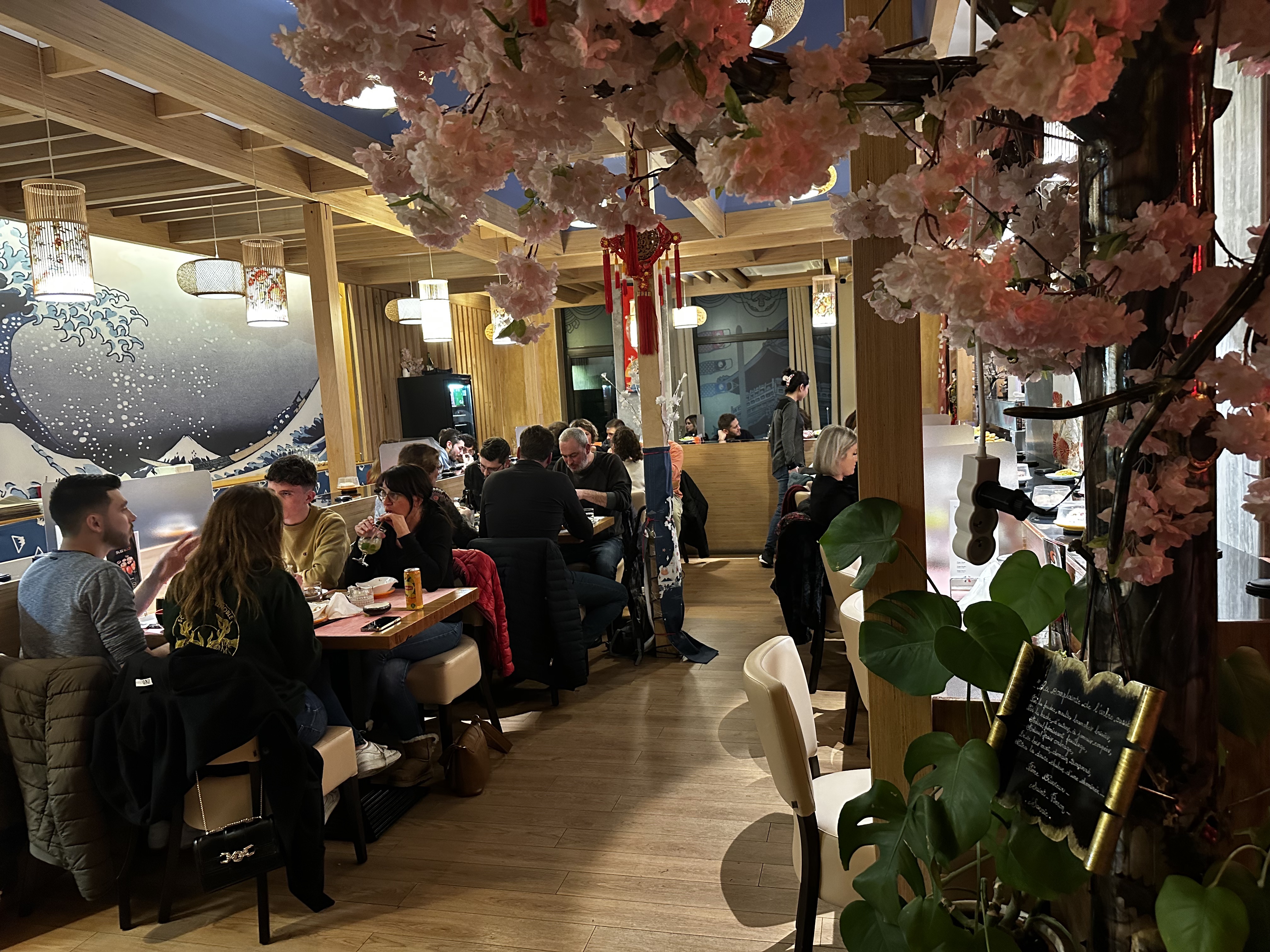 Concept très amusant, avec des sushis qui se déplace pour qu'on se serve 🙂 Les mochis en dessert sont très bon !