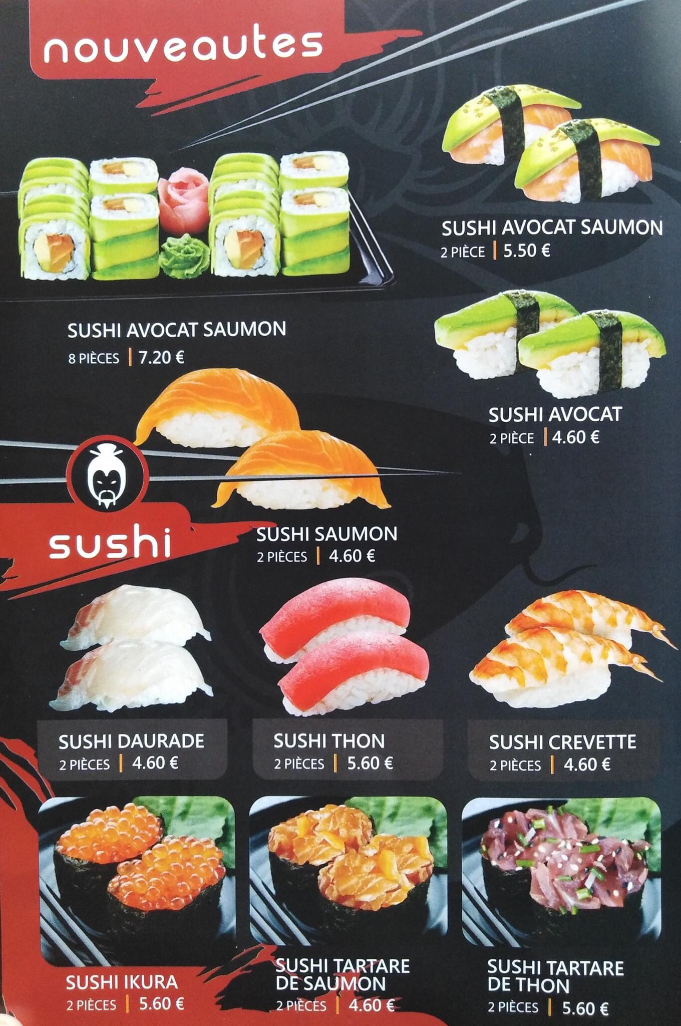 Plusieurs fois commandé des sushis à emporter: ils sont de bon calibres et très bons. Ils manquent par contre de fraicheur je veux dire quils ne sont pas frais en bouche, du coup je les remets un peu au frigo pour quils soient plus frais avant dégustation.