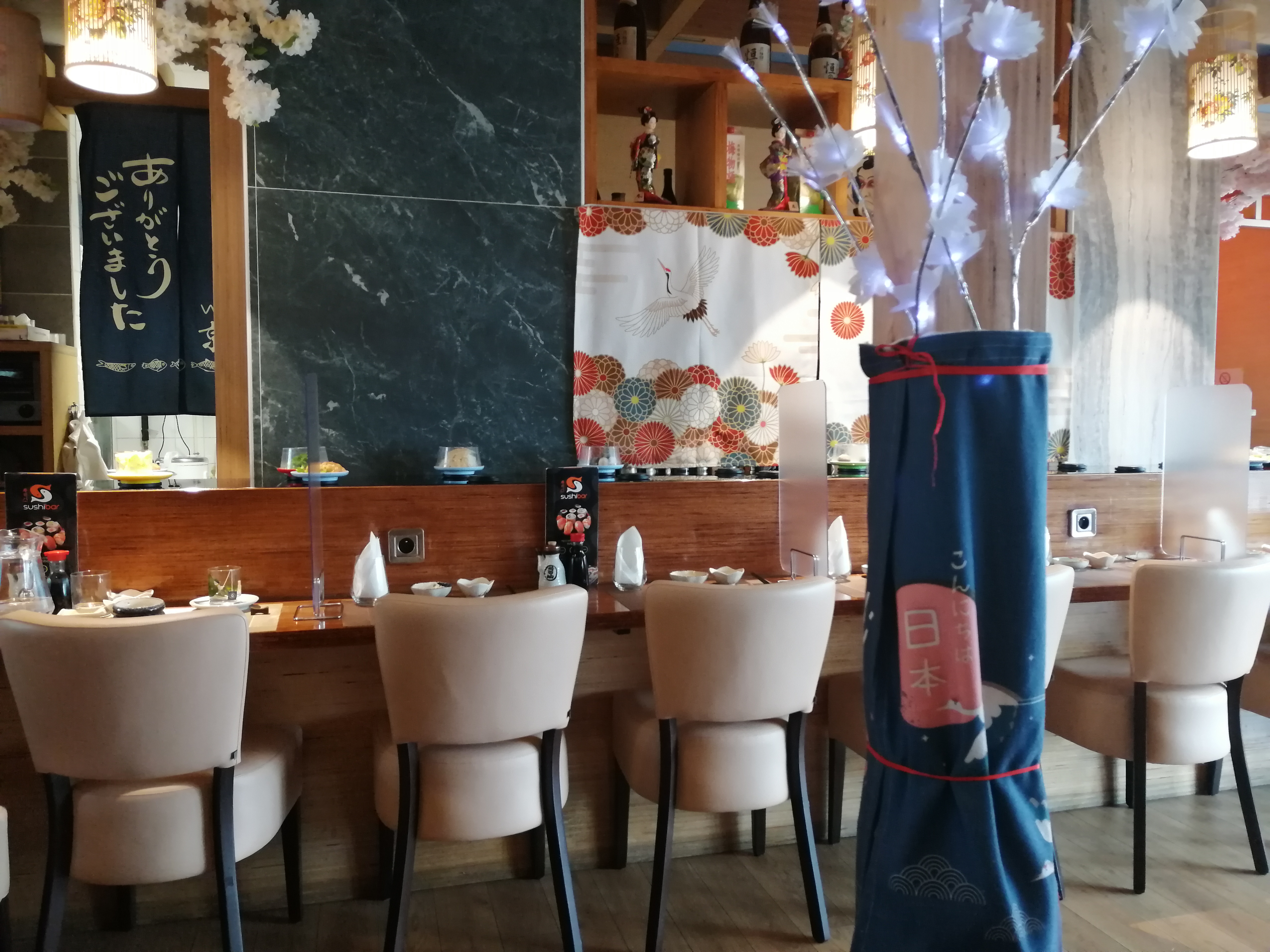 pas de gestes barrières.. une simple protection a 20 centimètres du voisin. a revoir très vite Mais les sushi sont toujours aussi bon