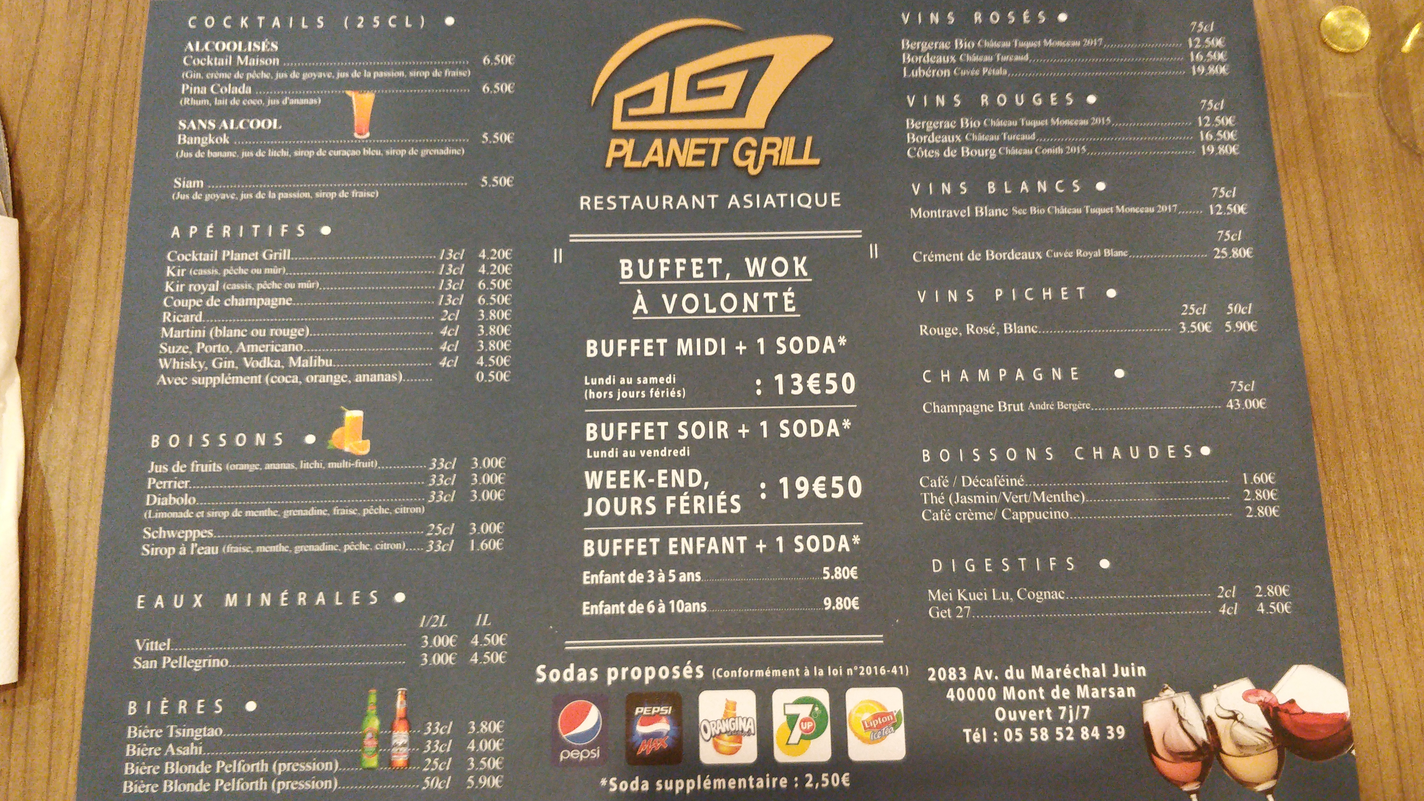 Posté le 05/10/2019 à 19:38"L'ancien Buffalo Grill a été repris courant 2019. Planet Grill propose une formule de repas à volonté pour à peine moins de 20 euros, avec un soda offert et eau gratuite. Les autres boissons sont en plus. L'accueil est souriant et correct. Le restaurant est propre ainsi que les toilettes. Une fois installés, on va se servir parmi les plats proposés. Une gamme d'aliments crus est présente afin de les faire cuire au wok par le chef (j'avoue avoir été bien impressionné par sa prestation). Parmi les plats, on trouve de tout, il n'y a donc pas que de l'asiatique, mais aussi des choses simples (voir mes photos). Concernant la partie desserts, il y a beaucoup de choix (j'avoue avoir été étonné de trouver des cannelés...! Pas très bons à mon goût.) J'ai bien aimé les nougats durs. Pour boire nous avions commandé deux bouteilles de vin. Il y a eu une erreur au service. Une bouteille plus chère nous a été ouverte. Mais nous l'avons payé au prix de notre commande (donc moins cher). Globalement on y mange bien. Mais il est recommandé d'y venir tôt (vers 19h00) afin de ne pas se bousculer pour aller chercher les plats et surtout pour avoir assez de choix ! Car en effet, une fois certains plats terminés, il n'y a pas de réassort. Je n'ai pas aimé l'ambiance bruyante (installer des petits paravents permettrait de couper le bruit), je n'ai pas trop aimé le fait de voir certains clients vider carrément certains rayonnages de desserts et partir avec des assiettes qui débordent à leur table. Nous avions eu la chance de ne pas être loin du buffet... mais je n'ose pas imaginer la marche pour ceux situés à l'autre bout du restaurant ! Finalement, nous préférons les ambiances plus intimistes et nous ne reviendrons donc pas dans ce restaurant."