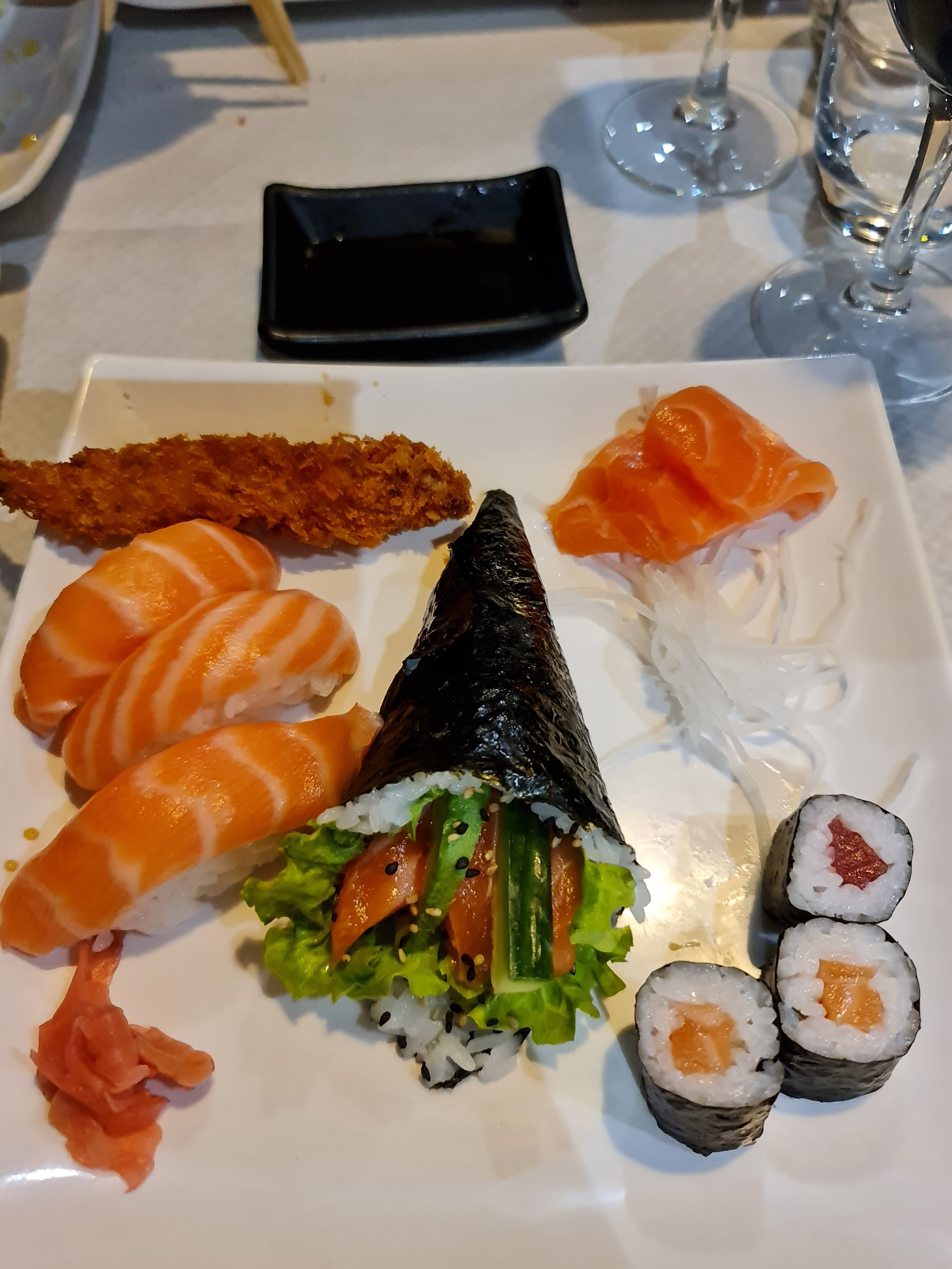 Classique, pareil que partout : il manque 1 ou 2 spécialités qui pourraient nous faire souvenir de ce lieu. Après je mets 3 étoiles car j aime les sushis 🙂