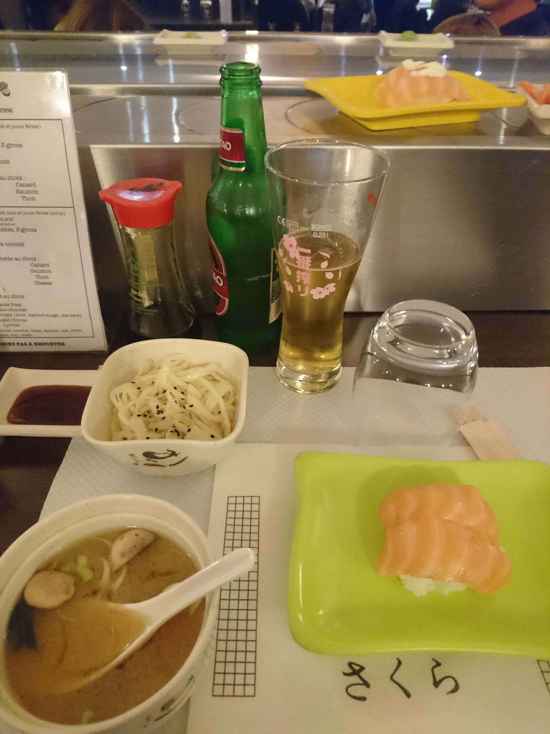 Le menu sushi a volonté est vraiment bien (avec soupe gyoza brochette et dessert). Sushi sur tapis, très sympa pour une soirée entre amis avant ou après un ciné (juste à côté !)