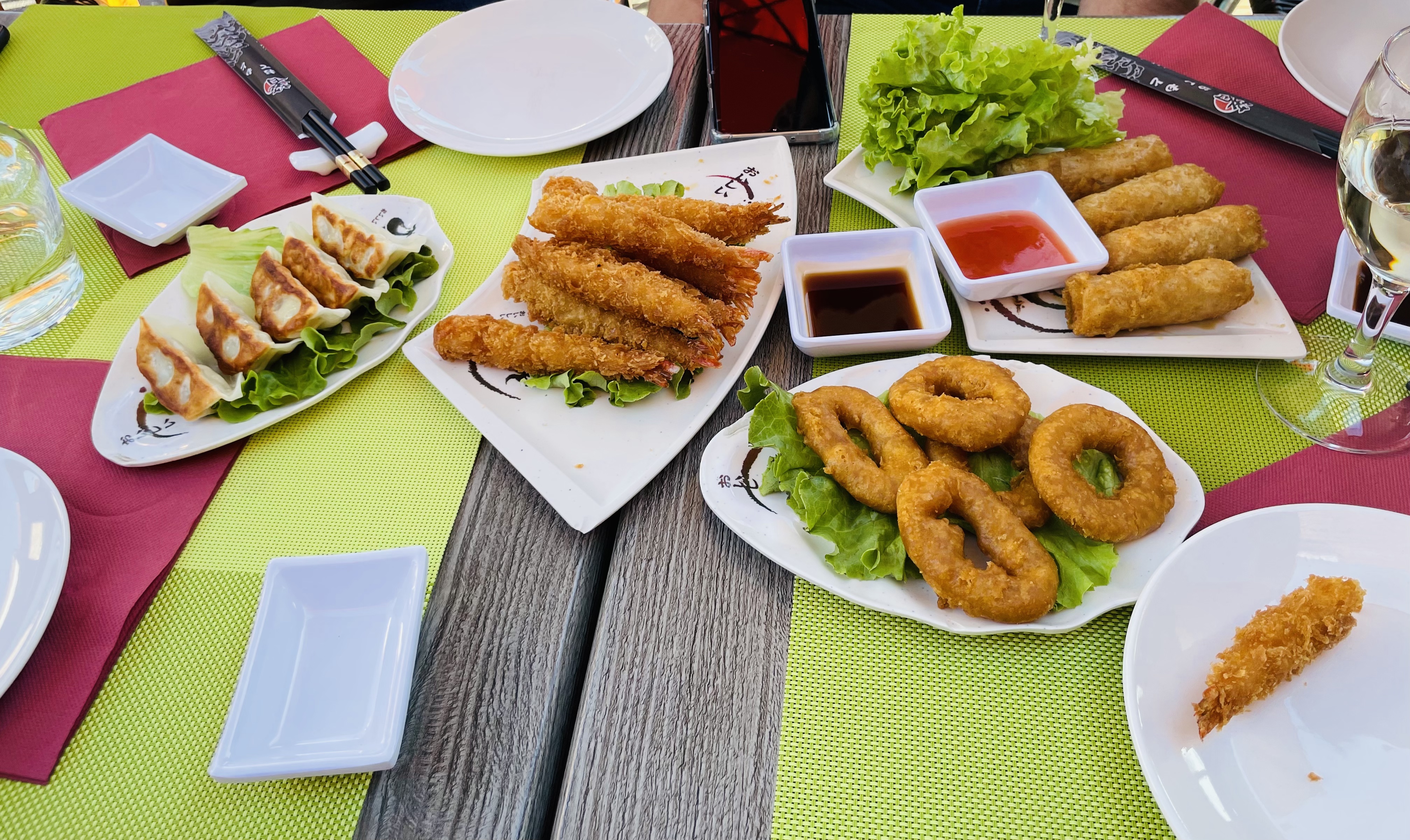 Un restaurant Japonais à volonté plutôt sympa mais mal placé car trop près de la route. Assez passante. Ce qui nuit au charme de la terrasse. Avec en plus quelques voitures pouvant se garer sur le trottoir à moins 1.5 m des tables. La nourriture est bonne et le choix est varié. Par contre si la majorité du personnel est sympathique, bien qu'il soit difficile de communiquer en raison de la barrière de la langue, il y a une serveuse ABSOLUMENT EXÉCRABLE. Tellement qu'elle nous a fait regretter notre choix. (45/50 ans queue de cheval) Air mauvais. Faisant tout ne pas voir et entendre nos appels. Nous laissant attendre. Parlant dans sa langue en manifestant son mécontentement. Et ayant oublié une partie des commandes. C'est incroyable qu'une seule personne puisse nuire autant à l'ambiance. Difficile d'envisager d'y retourner au risque de tomber de nouveau dessus.