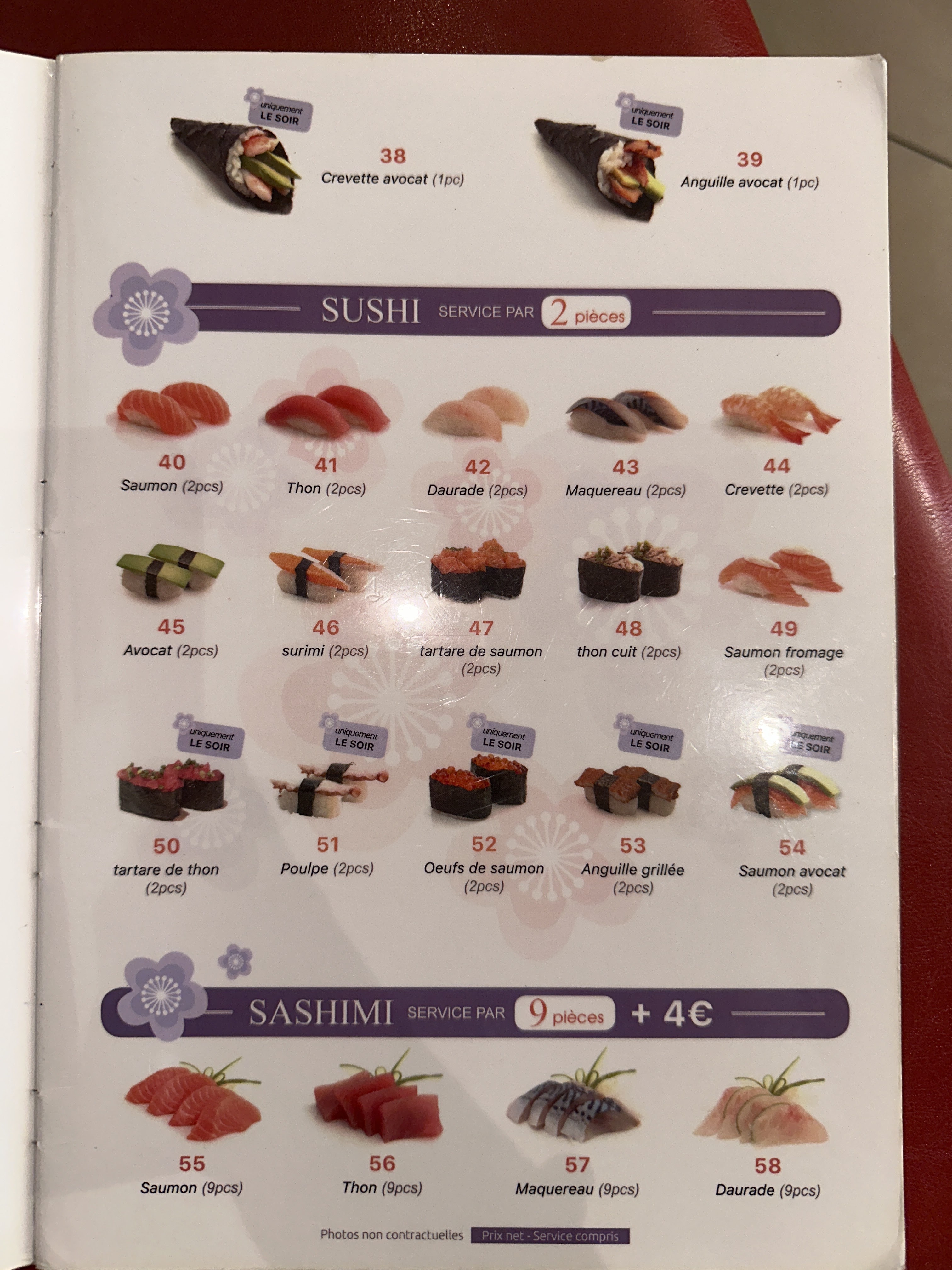 Une partie du personnel est sympathique et agréable, et une autre partie beaucoup moins (ni sourire, ni de de rien lorsqu'on les remercie, ils ne nous répondent même pas). Les menus à volonté le soir sont déjà à presque 21€, les plats sont bons dans l'ensemble, le service à table est super et nous avons été servi rapidement . Les entrées soupe miso et salade de choux : très bon. Seul bémol : il vous faudra allonger la note de 4€ pour avoir des sashimi (x9) dont les morceaux ne sont vraiment pas gros... Je vous conseille également de ne pas prendre trop de sushi / maki / neige à la première commande car beaucoup de riz.... Aucun dessert à la carte, ni même de saké offert à la fin du repas...