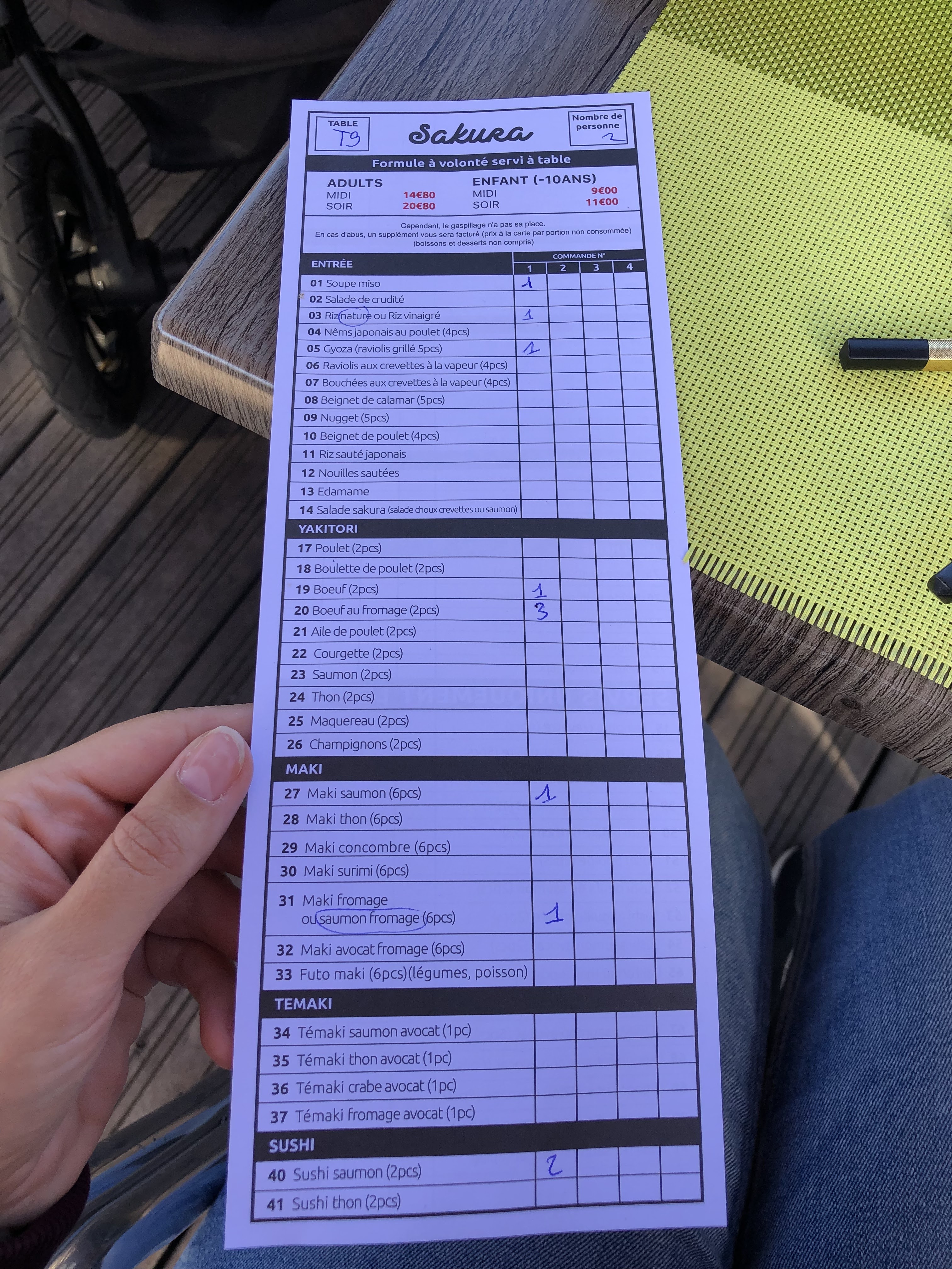 Un dimanche midi pour un menu à volonté… et là, surprise, le midi il n’y a aucun plat frit (crevette tempura etc). C’est seulement le soir.. pourquoi? Je ne sais pas. Décevant. Concernant les maki, l’algue était un peu sèche ce qui est désagréable. Il ne s’agit pas d’un buffet à volonté, vous devez commander en remplissant une petite grille que vous remettez au serveur et qui vous apporte vos plats. La technique est donc de nous faire patienter un temps fou entre les plats, de sorte que notre faim passe. Rentable pour le restau, mais pas pour nous. En soit ce n’était pas mauvais dans l’ensemble mais pour les raisons évoquées ci dessus, je n’y retournerai pas. La terrasse et le personnel restent le plus de ce restaurant.