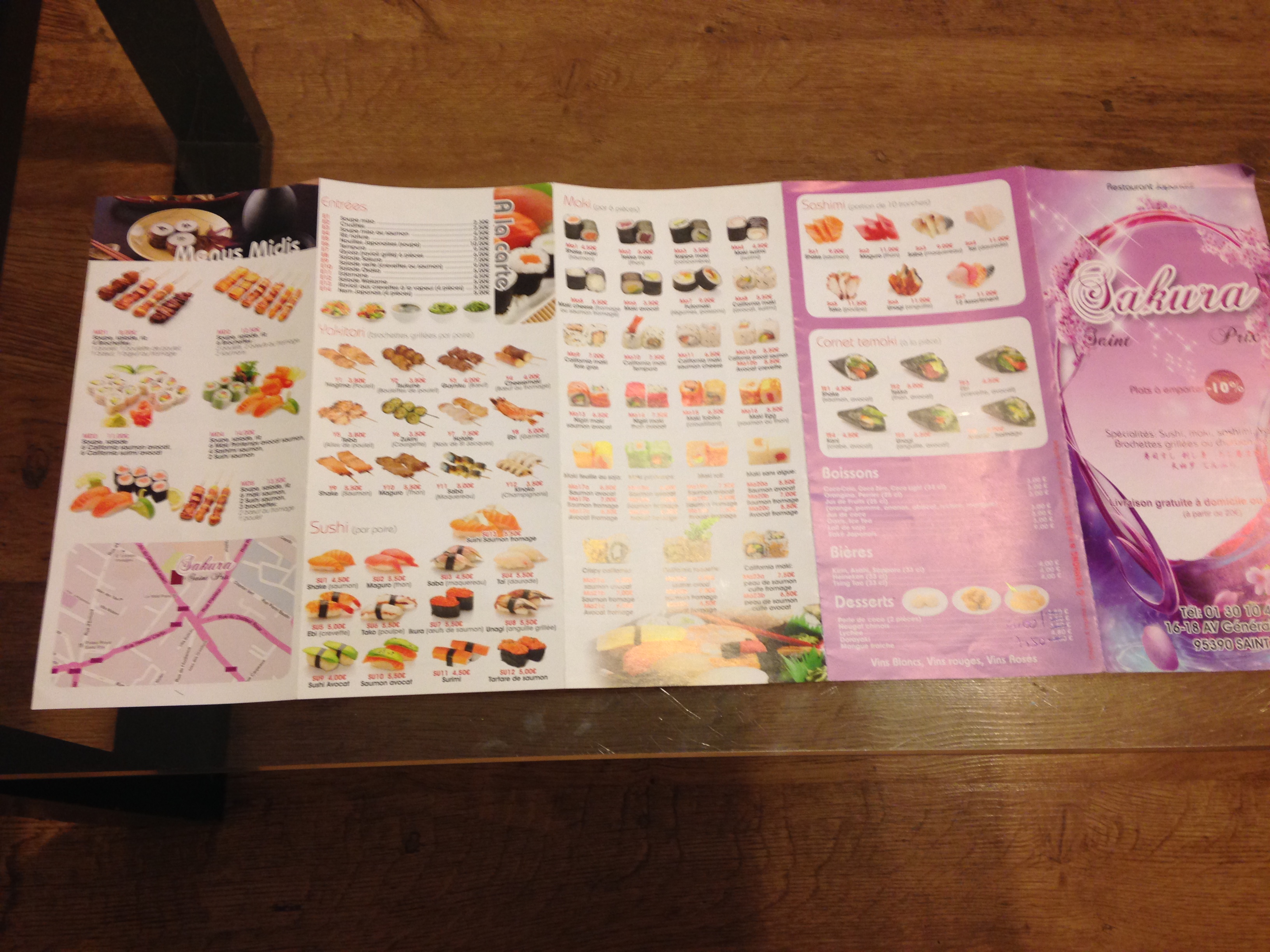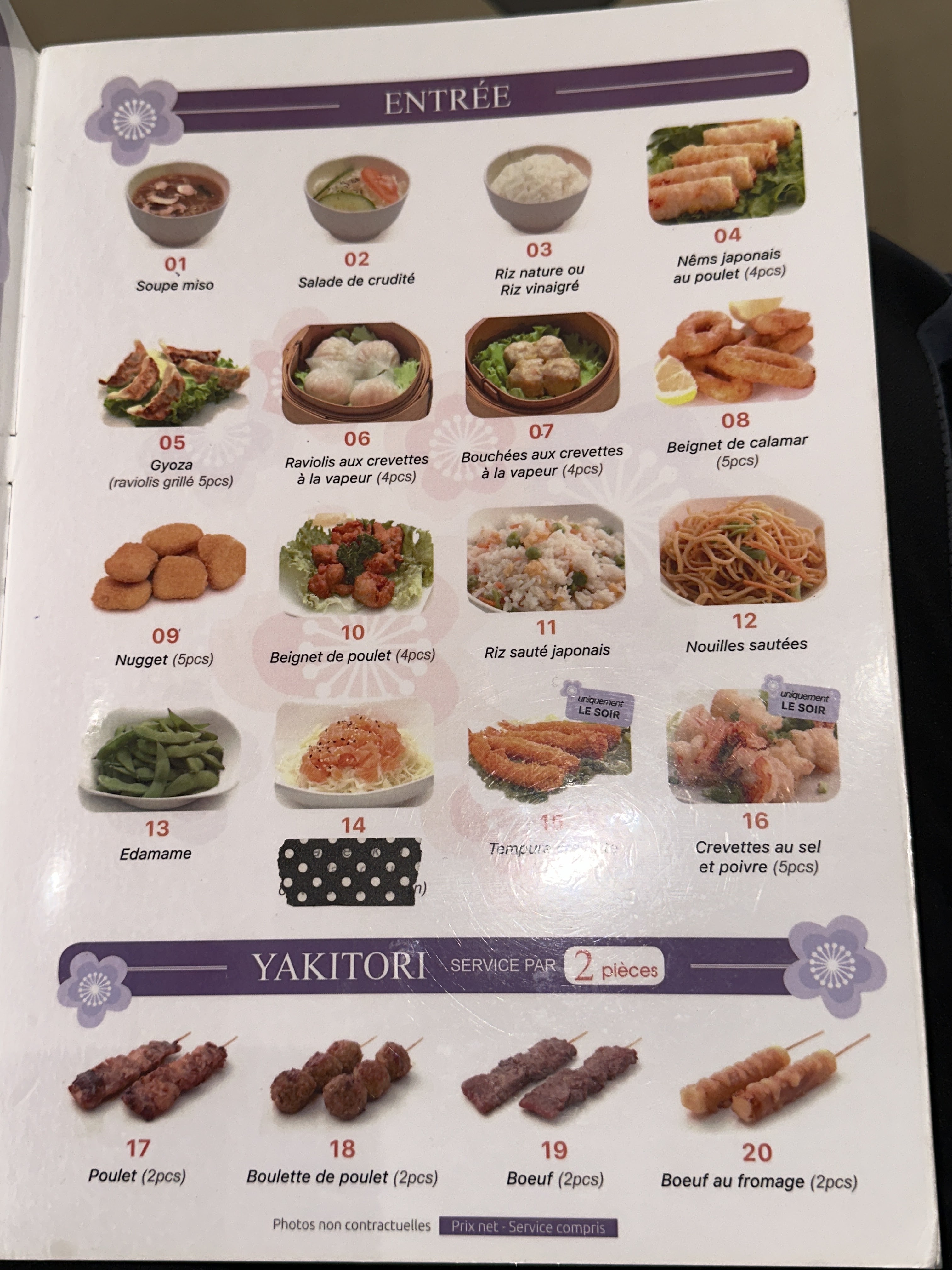 1ere expérience chez Sakura Formule a Volonté 3 passages Soupe, salade, Sushis et Maki très bien ! Nems et tempuras et nouilles sautées franchement très moyen au niveau qualité. Brochettes Bœuf au fromage comme partout ça va ! Vaisselle d’Epoque ….et semble fatiguée ! Accueil et aimabilité Très moyen. Ambiance Froide. Pas vu le Chat ! C’est loin d’être aussi bien que le Restaurant Japonais où nous allons habituellement mais qui est fermé actuellement pour travaux. Disons que ça dépanne si nous avons envie de manger Japonais sans aller trop loin. Rien de plus …