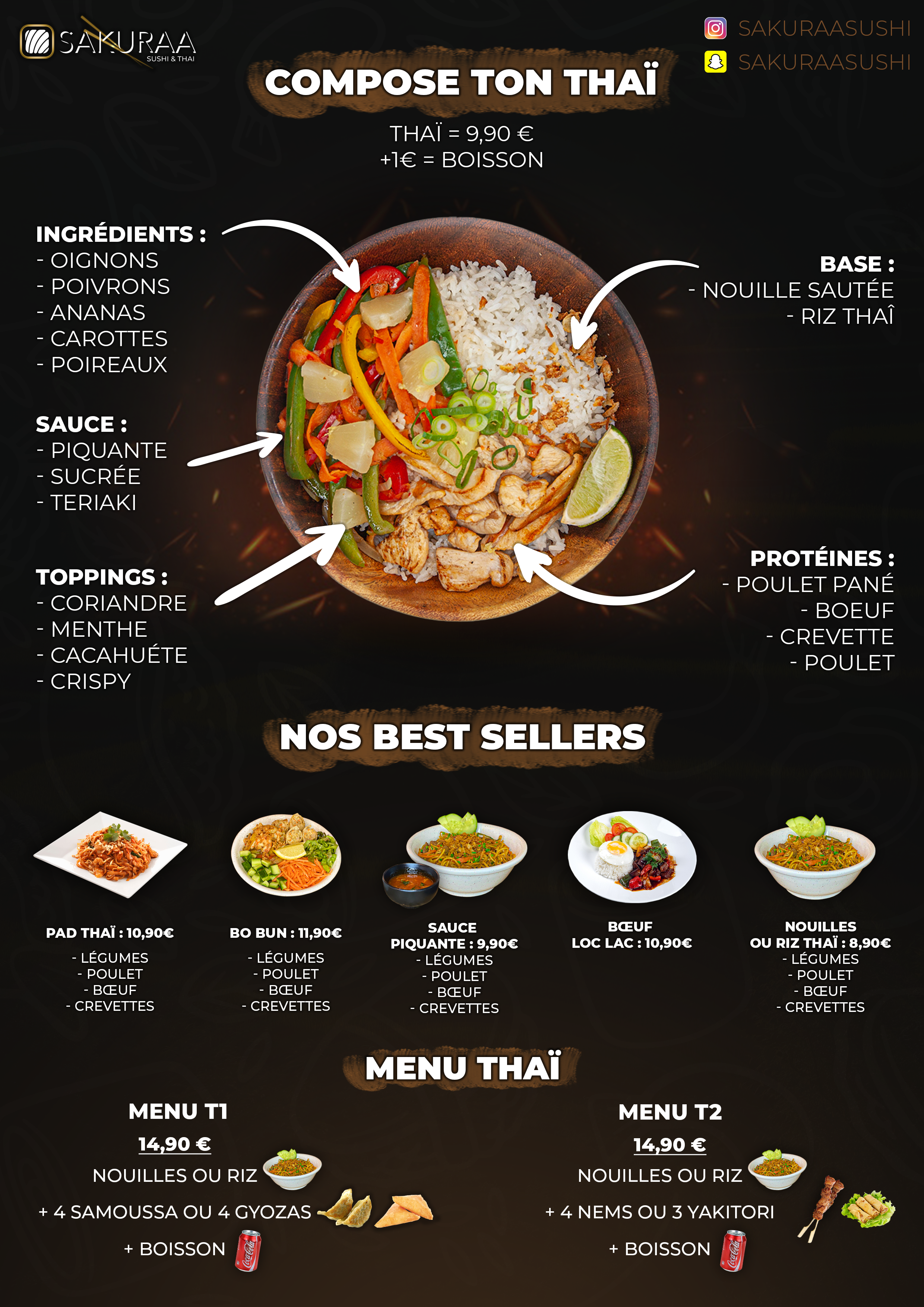DELICIEUX Pour un repas du jeudi soir entre potes quoi de mieux que d'aller au Sakuraa Sushi&Thaï. Les plats sont délicieux, des sushis au dessert sans oublier les nouilles sautées et le riz accompagnés de viandes et de légumes tout aussi bon. L'ambiance est sympathique et chaleureuse. Le rapport qualité prix est juste parfait.