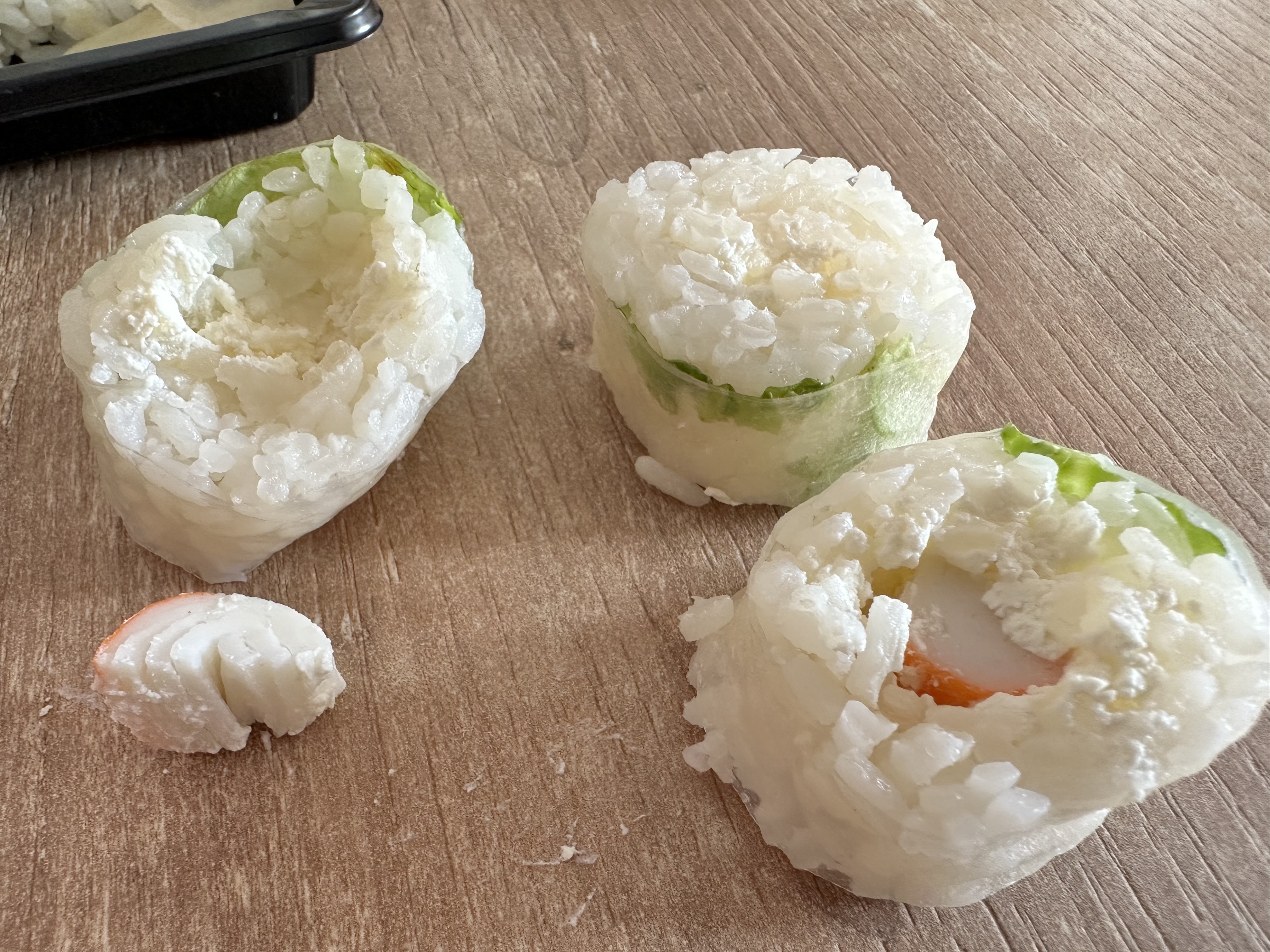 Posté le 16/09/2023 à 22:00"Première fois que je commande et aussi la dernière. Les makis se desintegrent quand on veut les manger. Certains ne sont composés quasiment que de riz. D'ailleurs le riz est lourd et bourrarif. Le plat chaud, du riz sauté, est tiède et avec une odeur qui ne donne pas confiance. J'avais confiance vu les avis positifs mais je pense que c'est très exagéré. Je ne recommande pas."