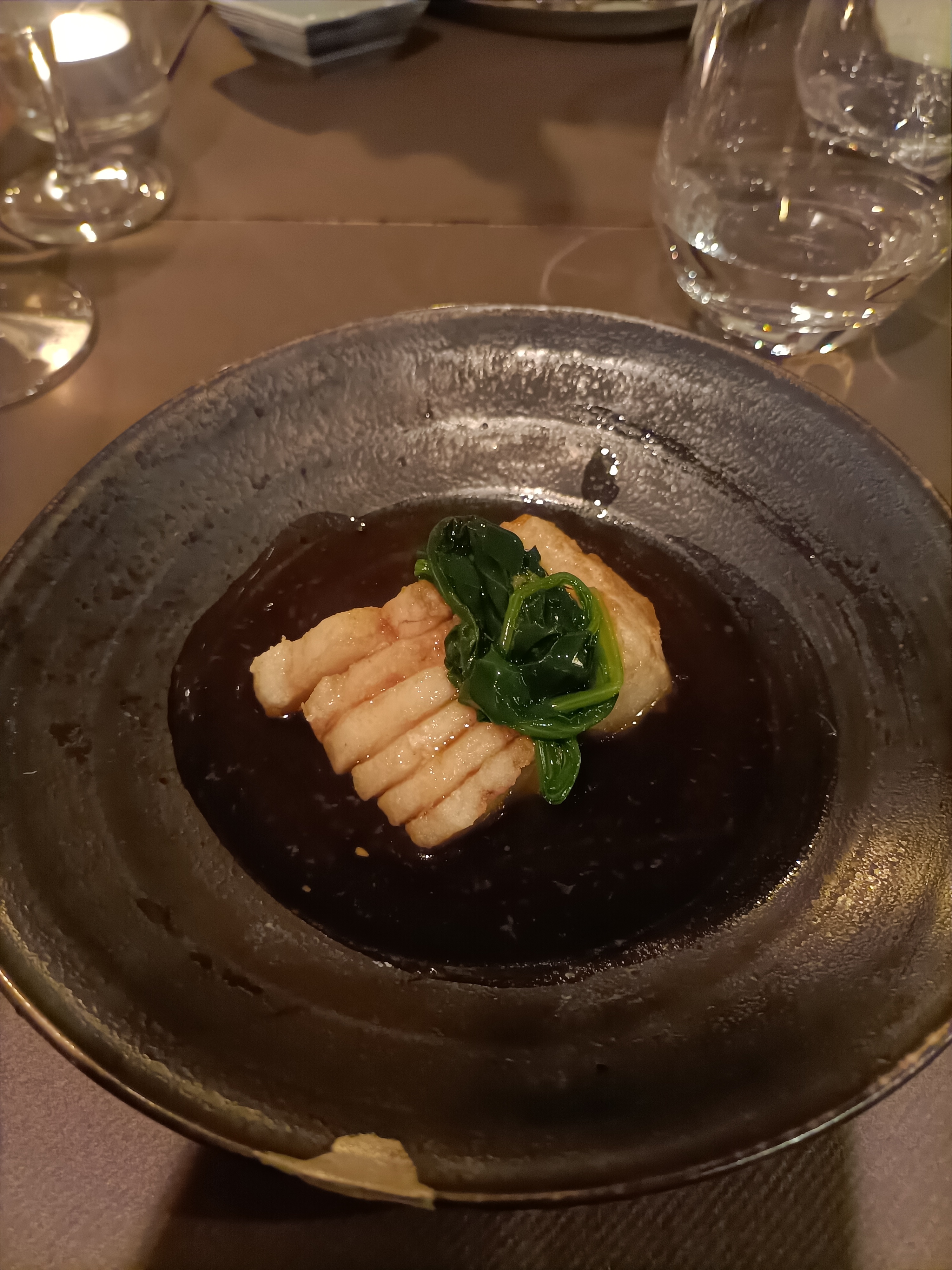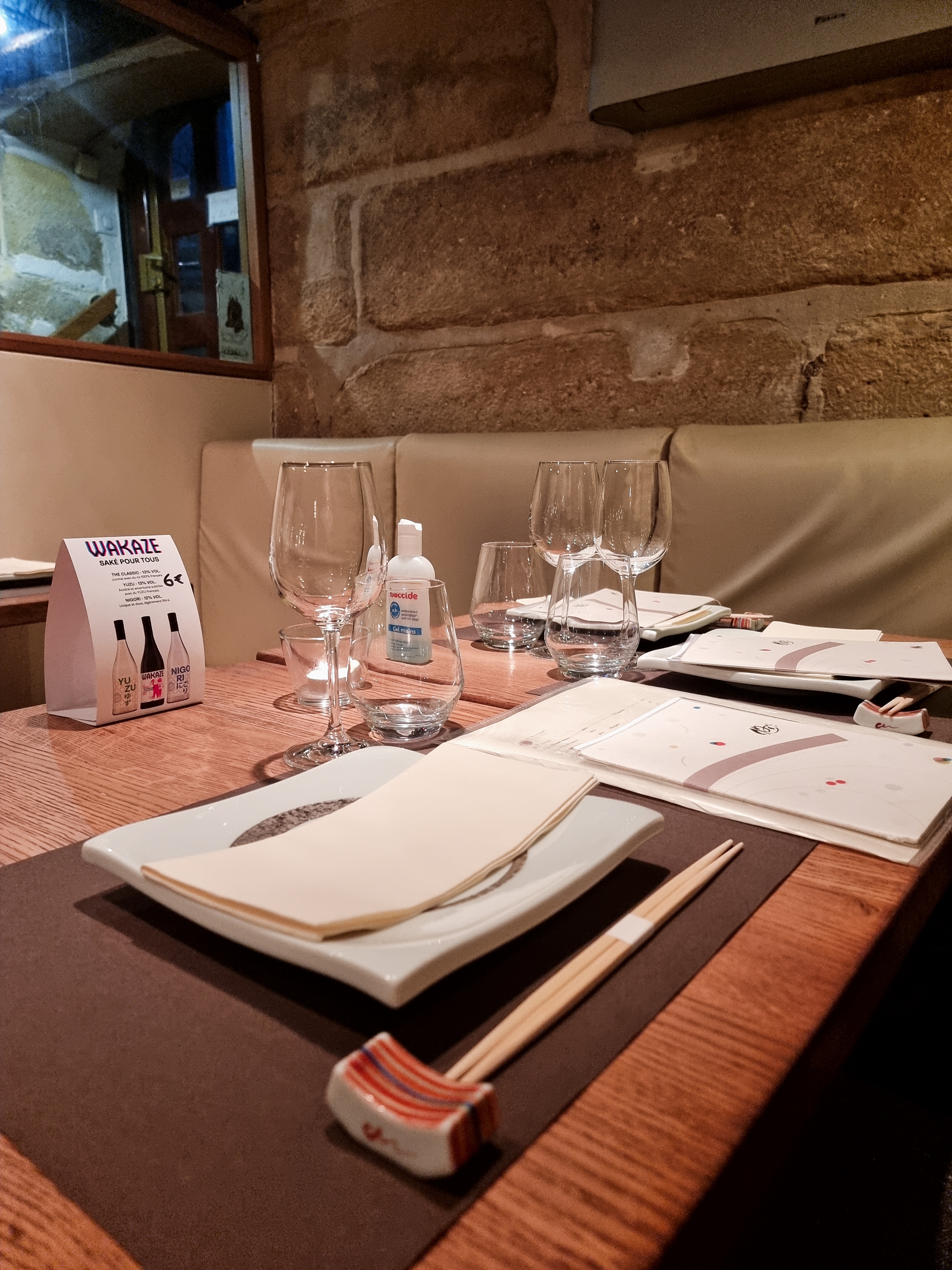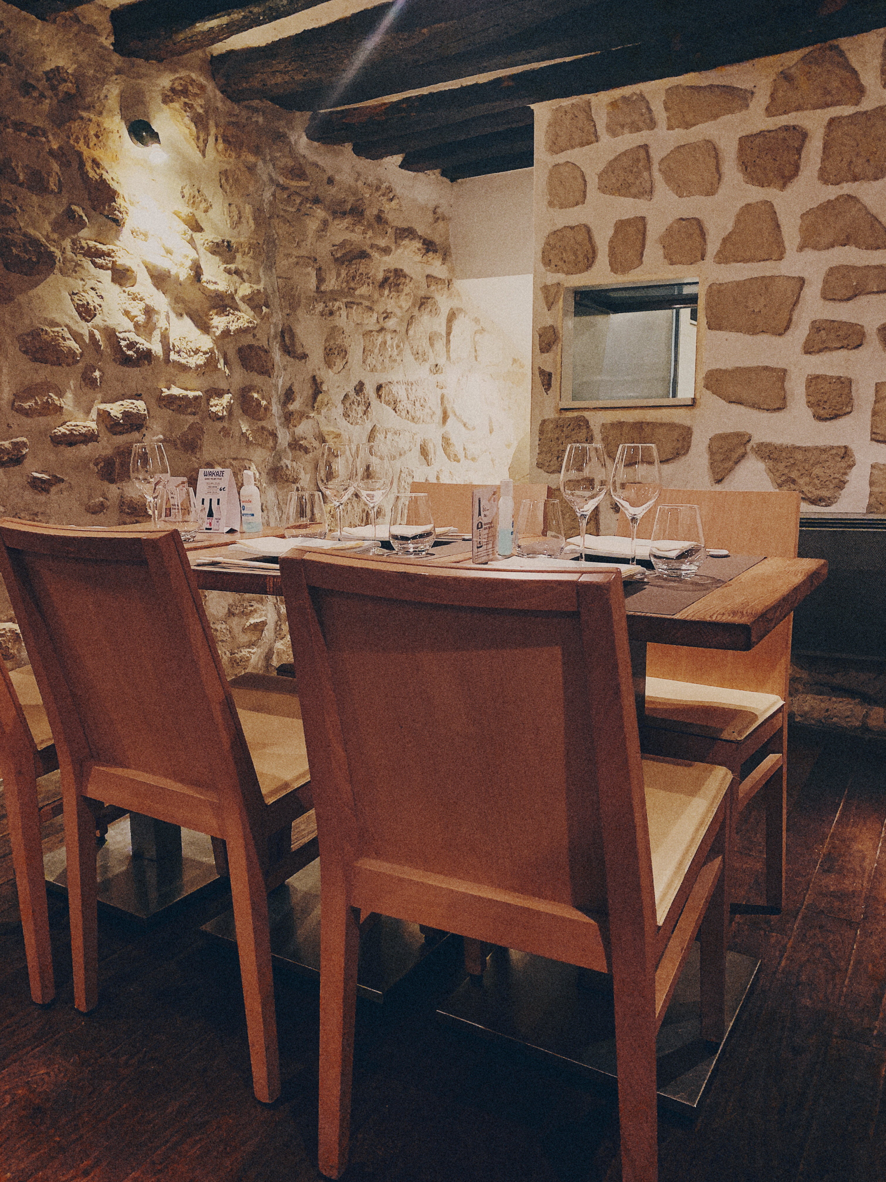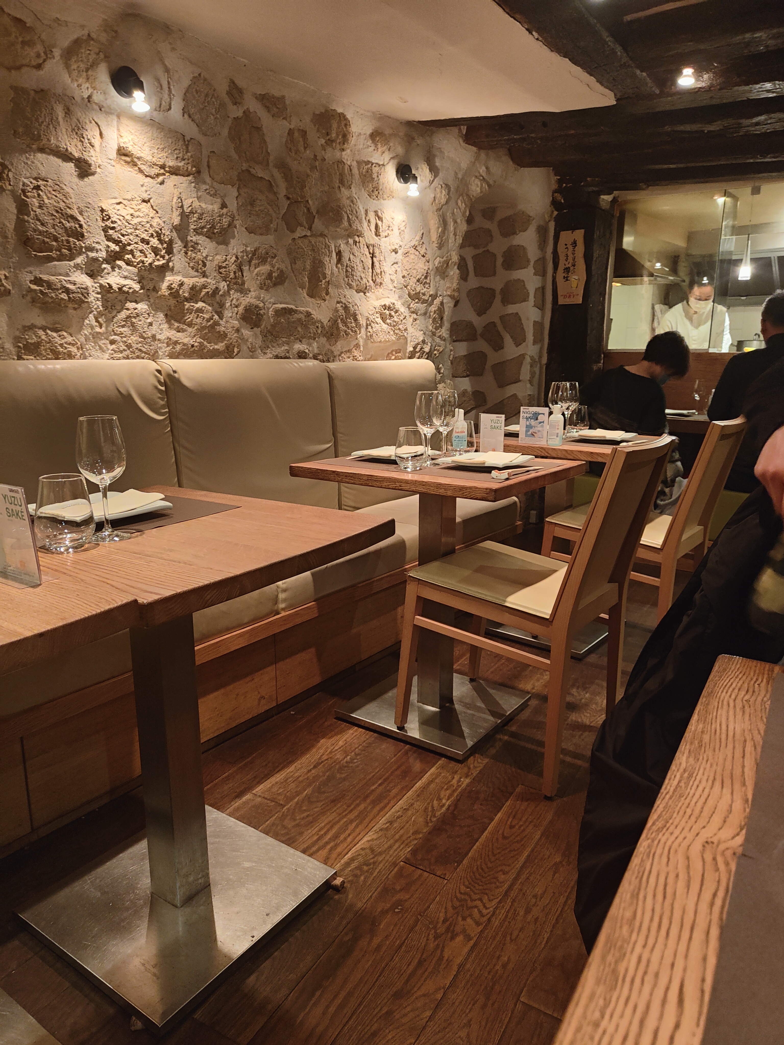 Très bel endroit dans une ancienne cave du 17eme siècle. Le service est aux petits soins, rapide, discret et efficace; avec un personnel accueillant et souriant. Les mets sont aussi délicieux les uns que les autres. Deux petits bémols pour notre part : un peu trop de fritures à notre goût et pas de possibilité d’accord mets et vins/saké. Ambiance feutrée.