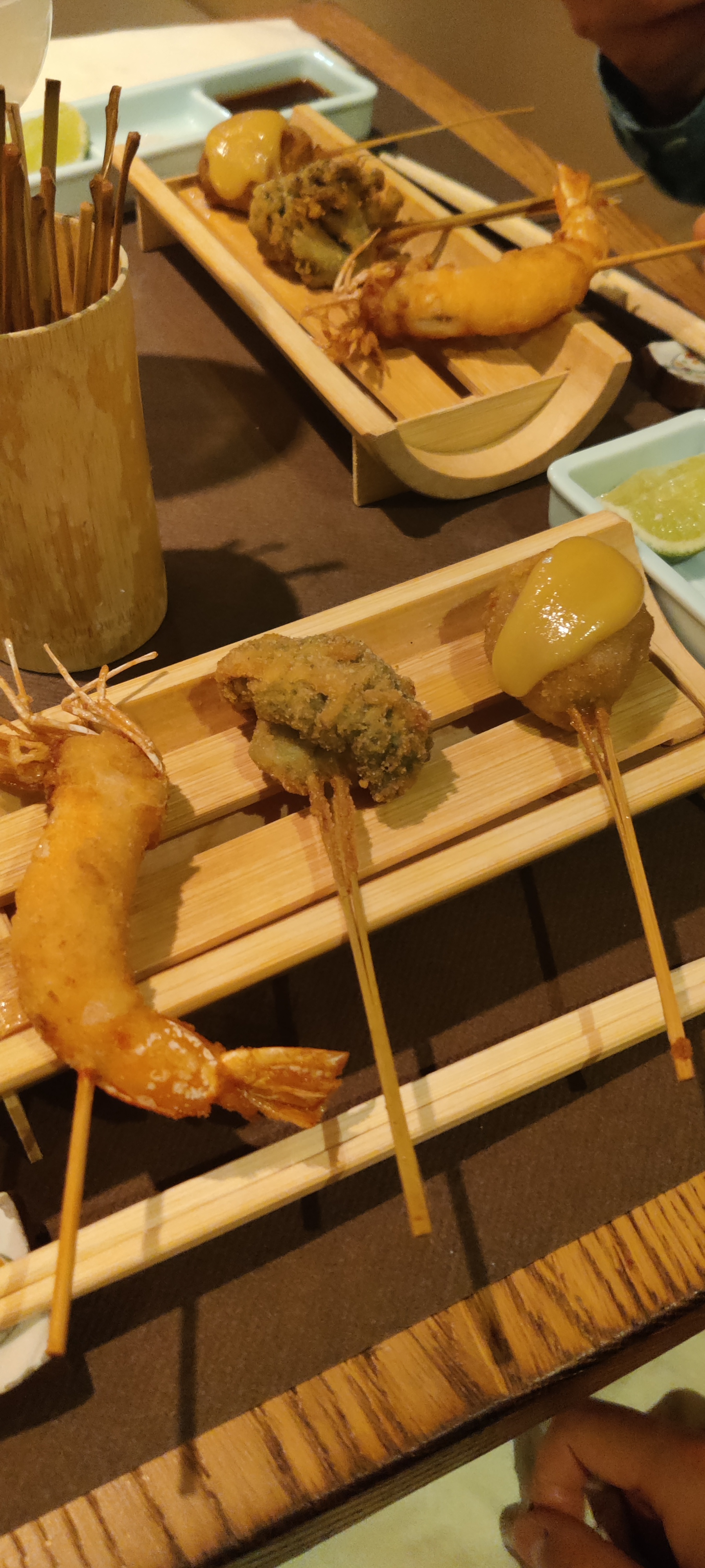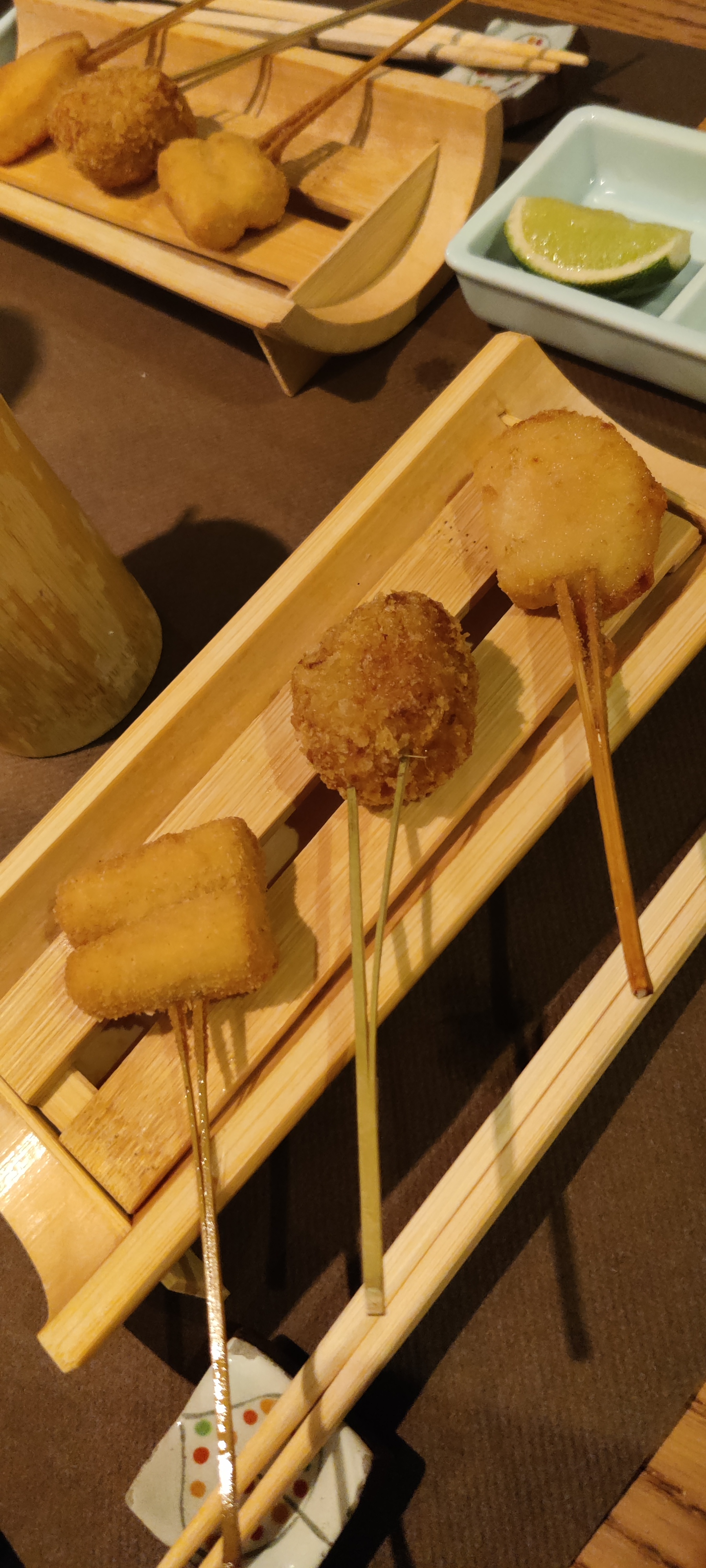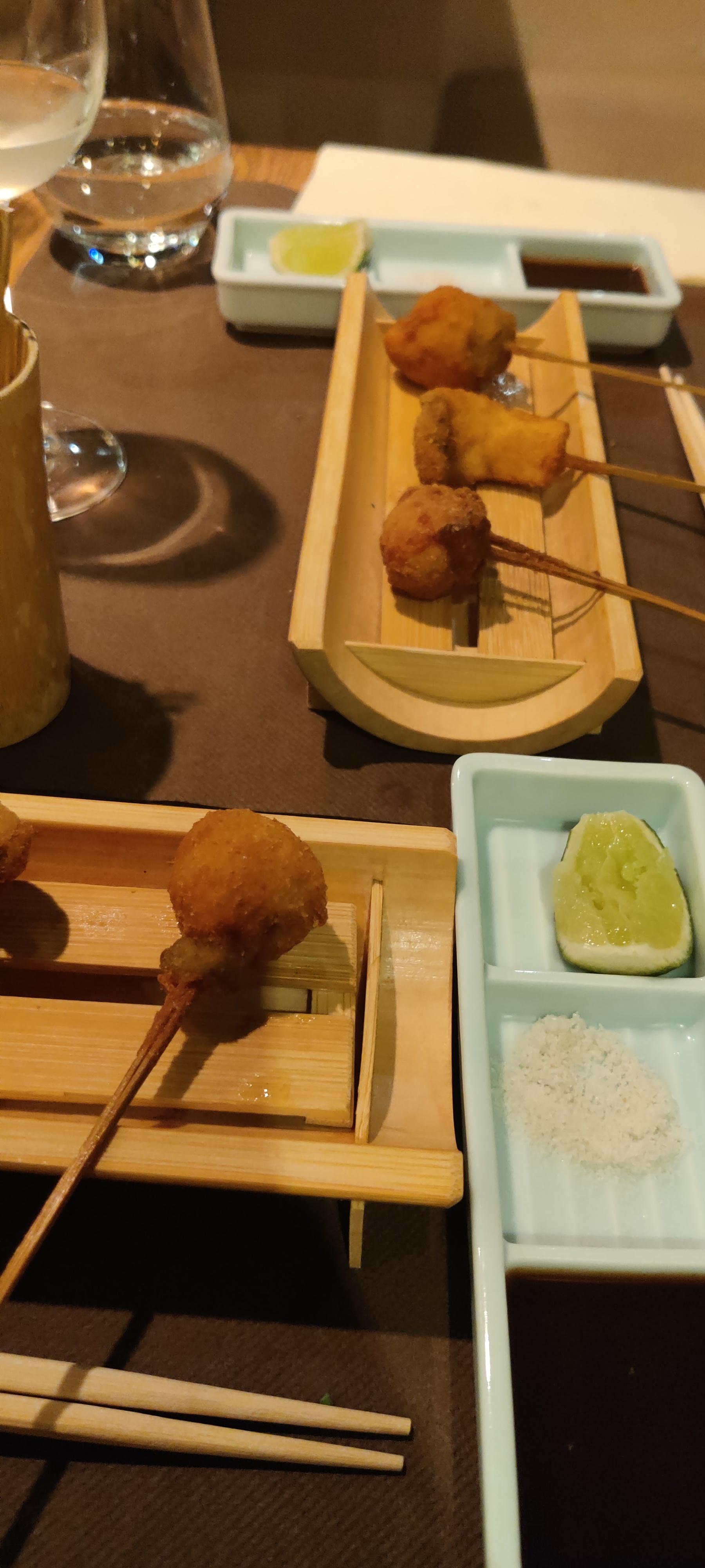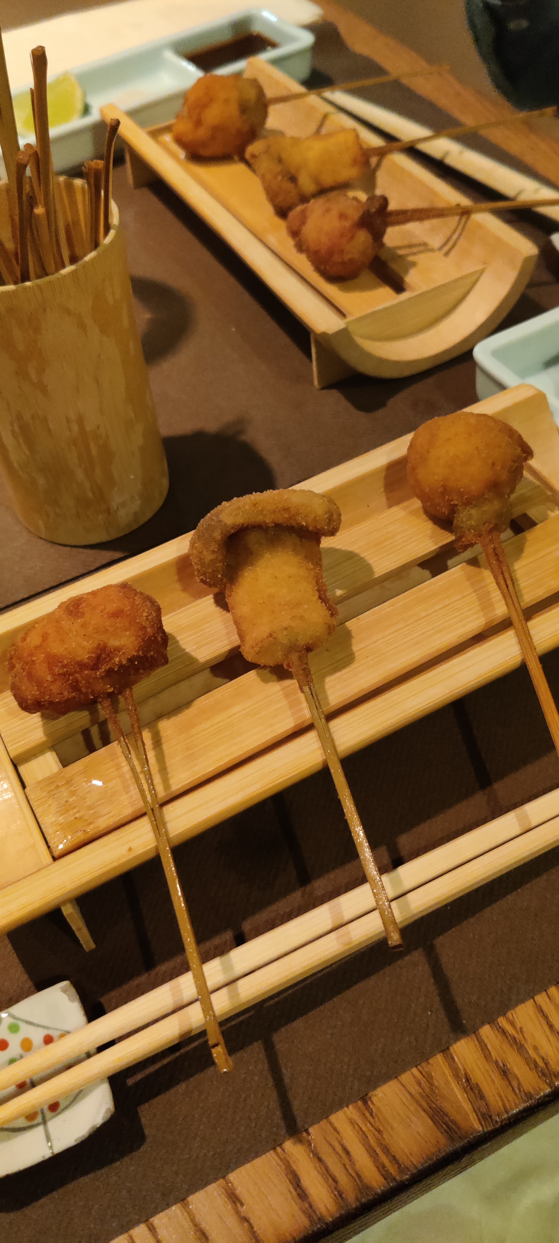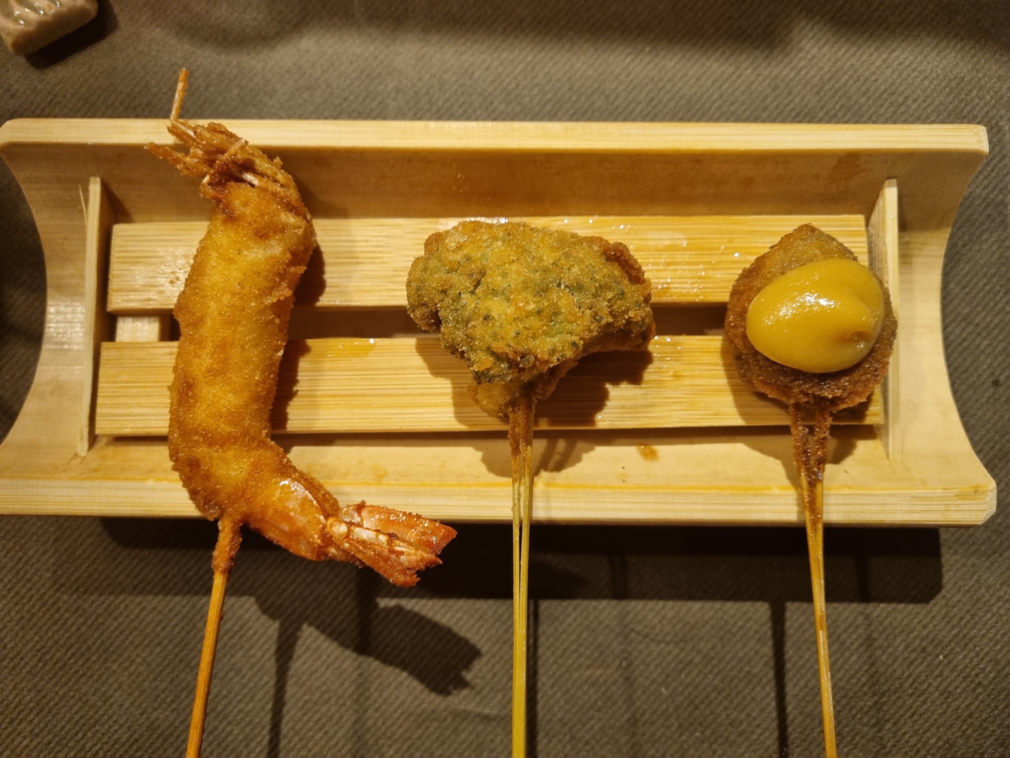 Lieu atypique, merveilleux et raffiné. Les kushiage sont des petits bouchés japonais frits et panés (pas gras du tout et ultra frais). Une spécialité de ce restaurant donc normal qu'il y a en quantité dans leur menu.
