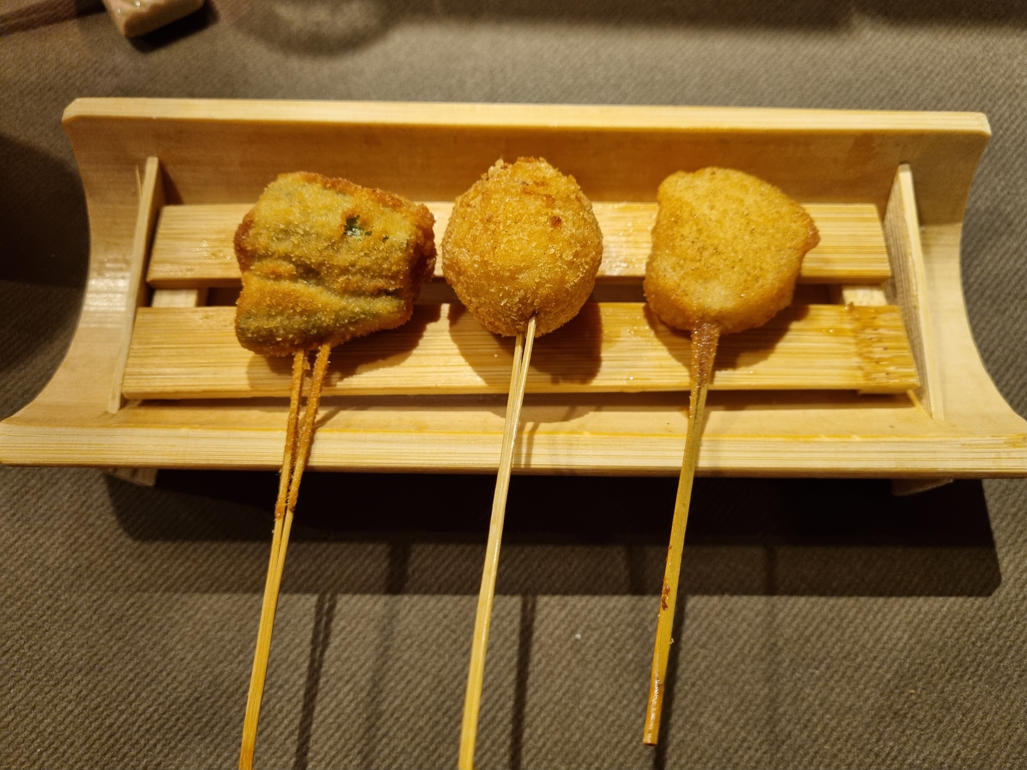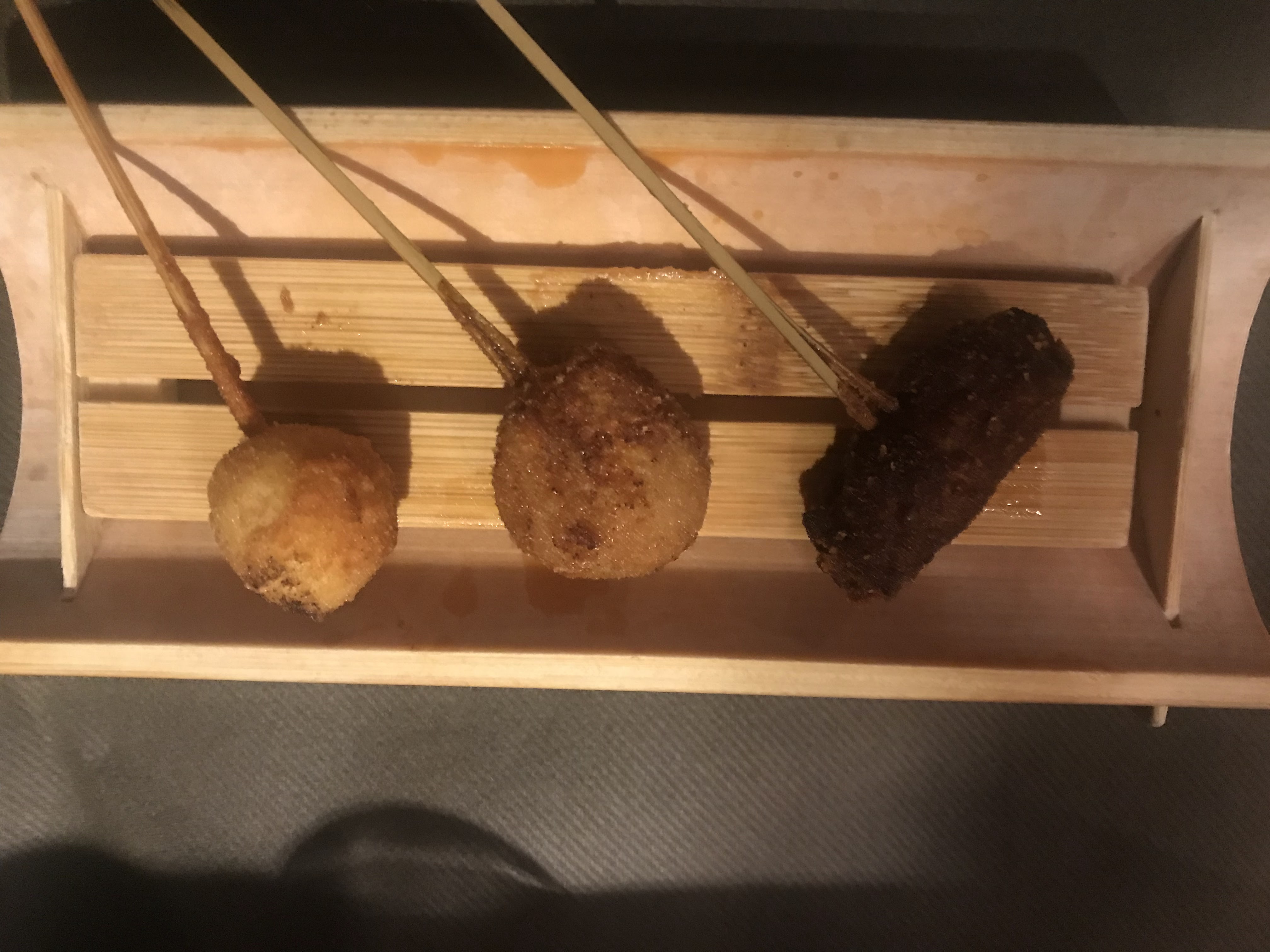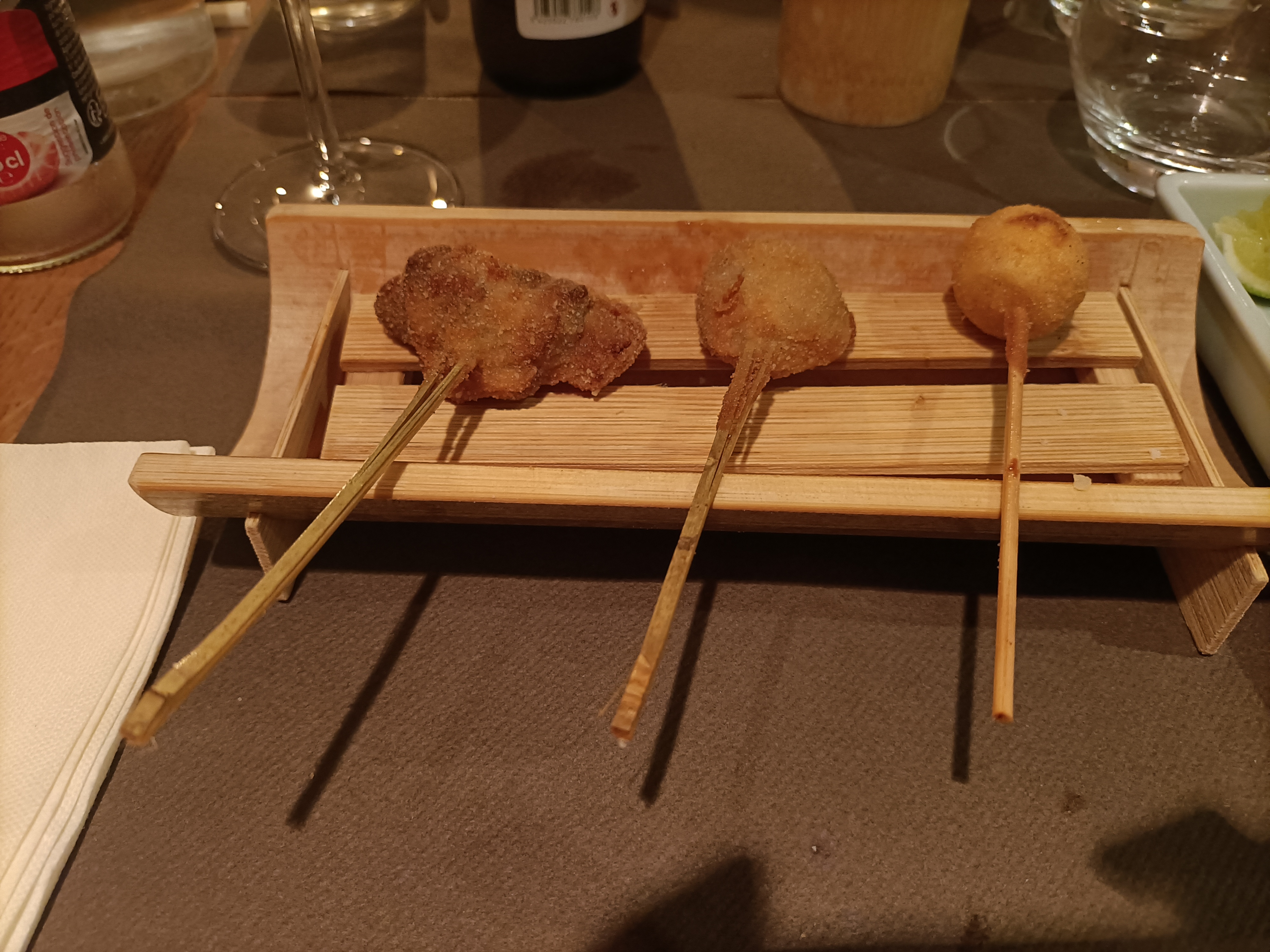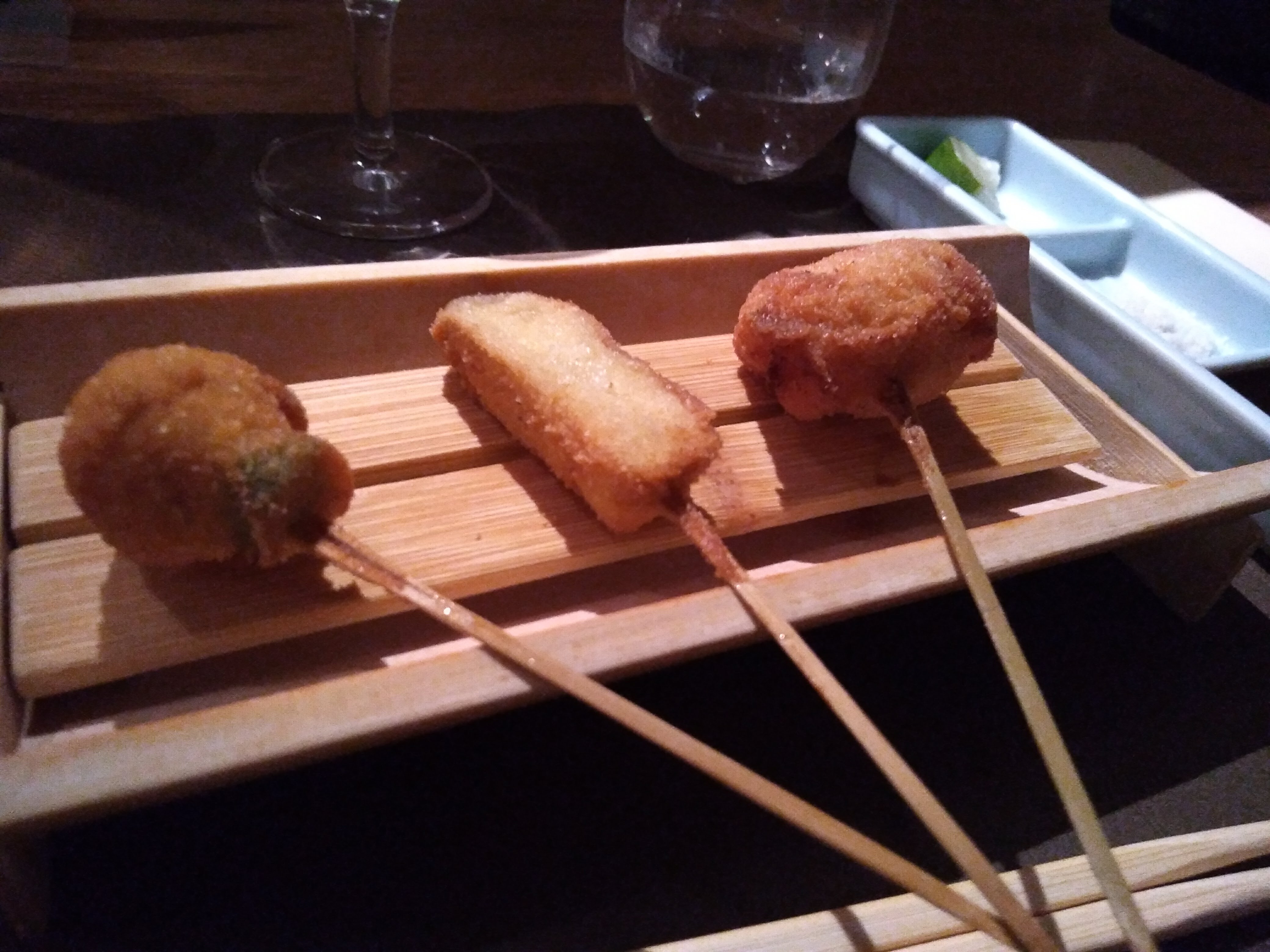 Lieu atypique, merveilleux et raffiné. Les kushiage sont des petits bouchés japonais frits et panés (pas gras du tout et ultra frais). Une spécialité de ce restaurant donc normal qu'il y a en quantité dans leur menu.