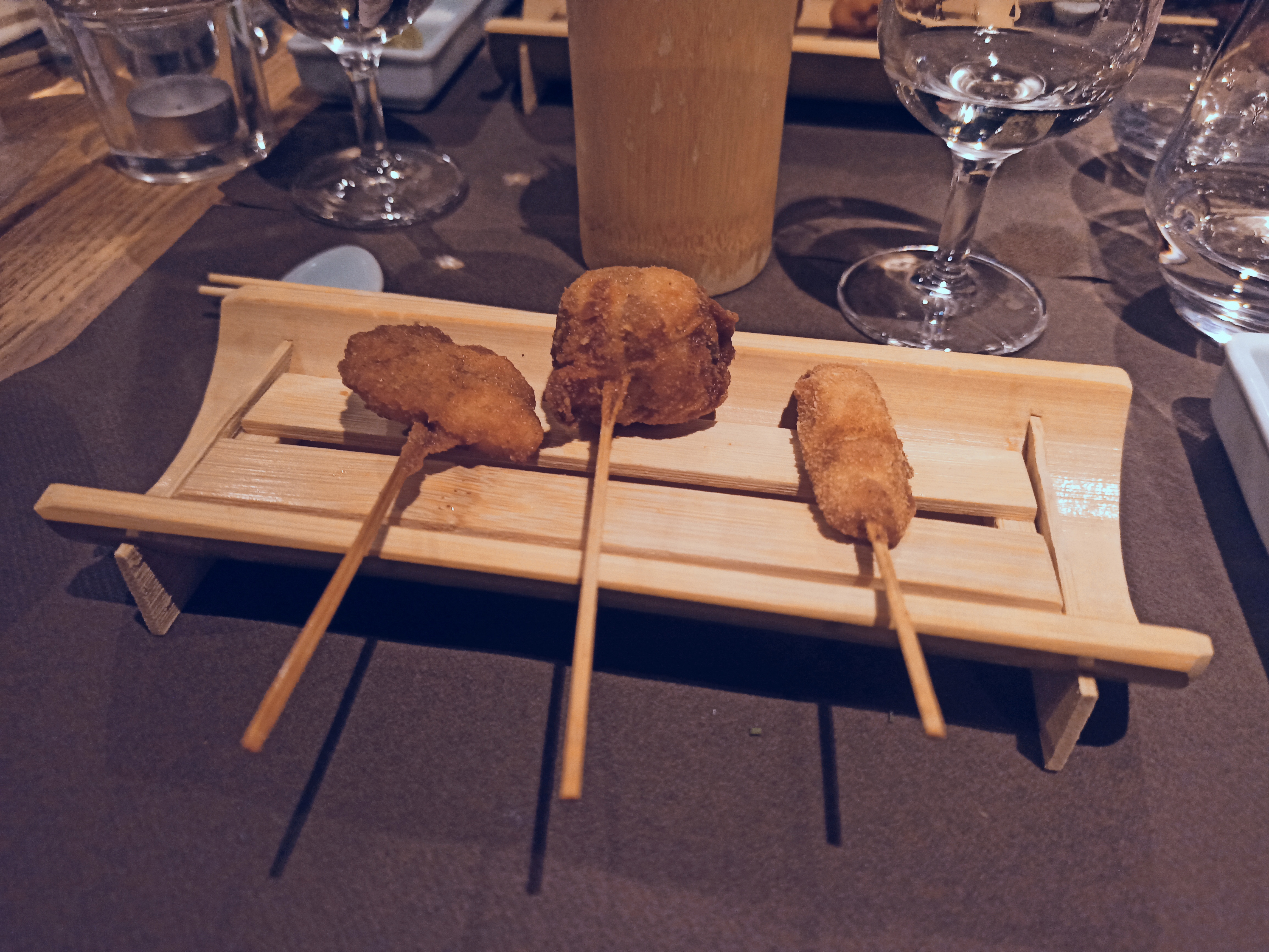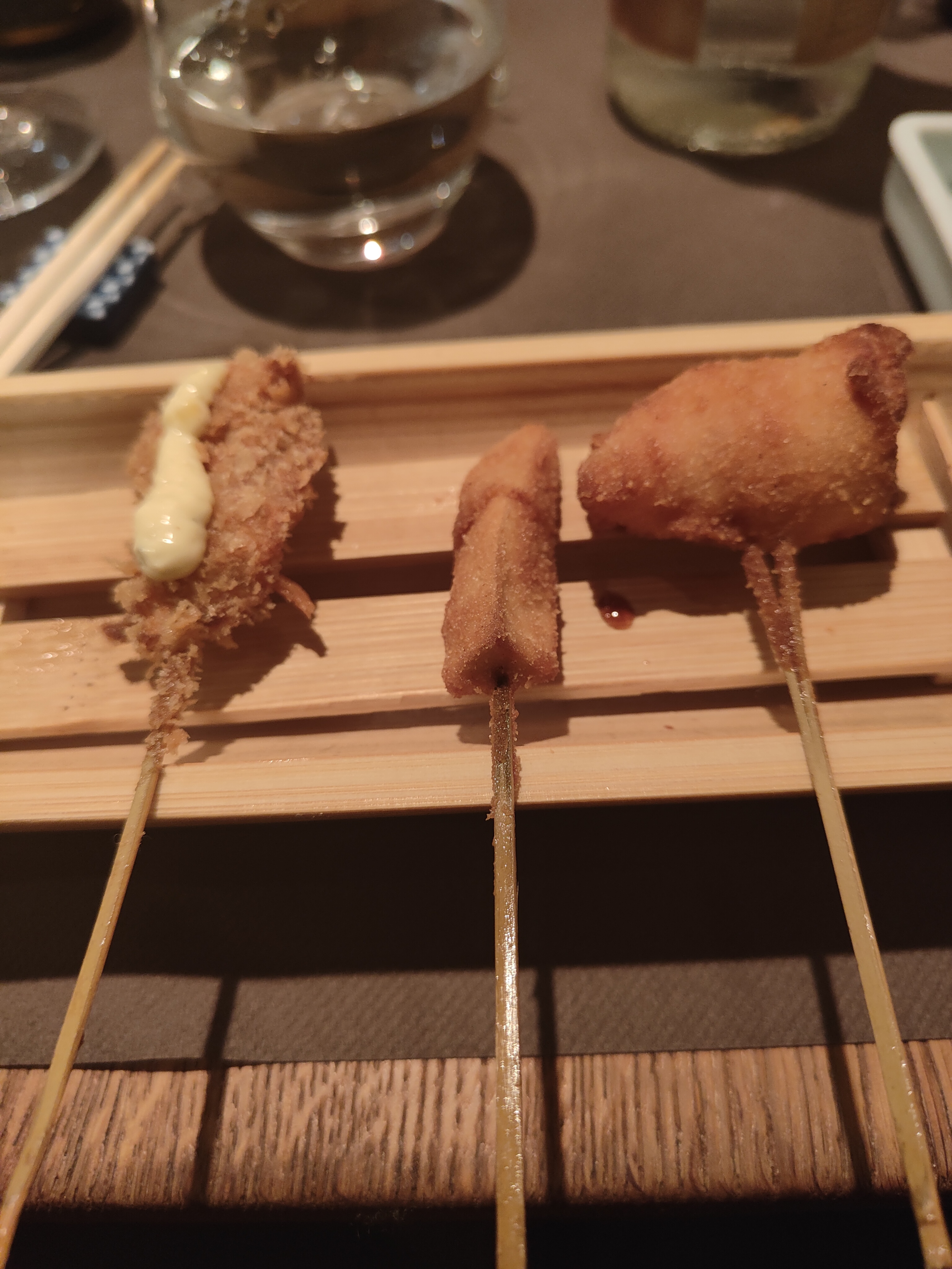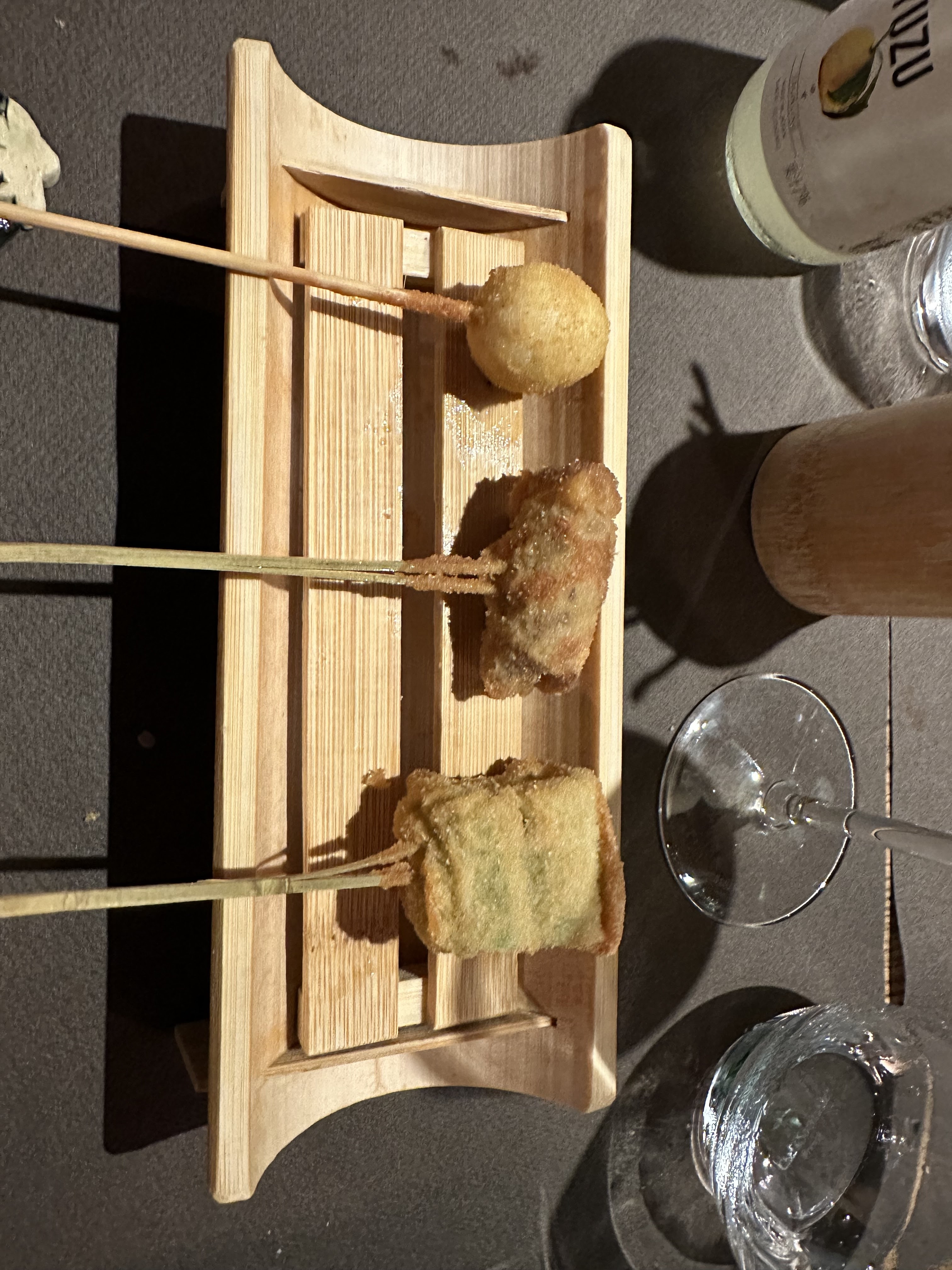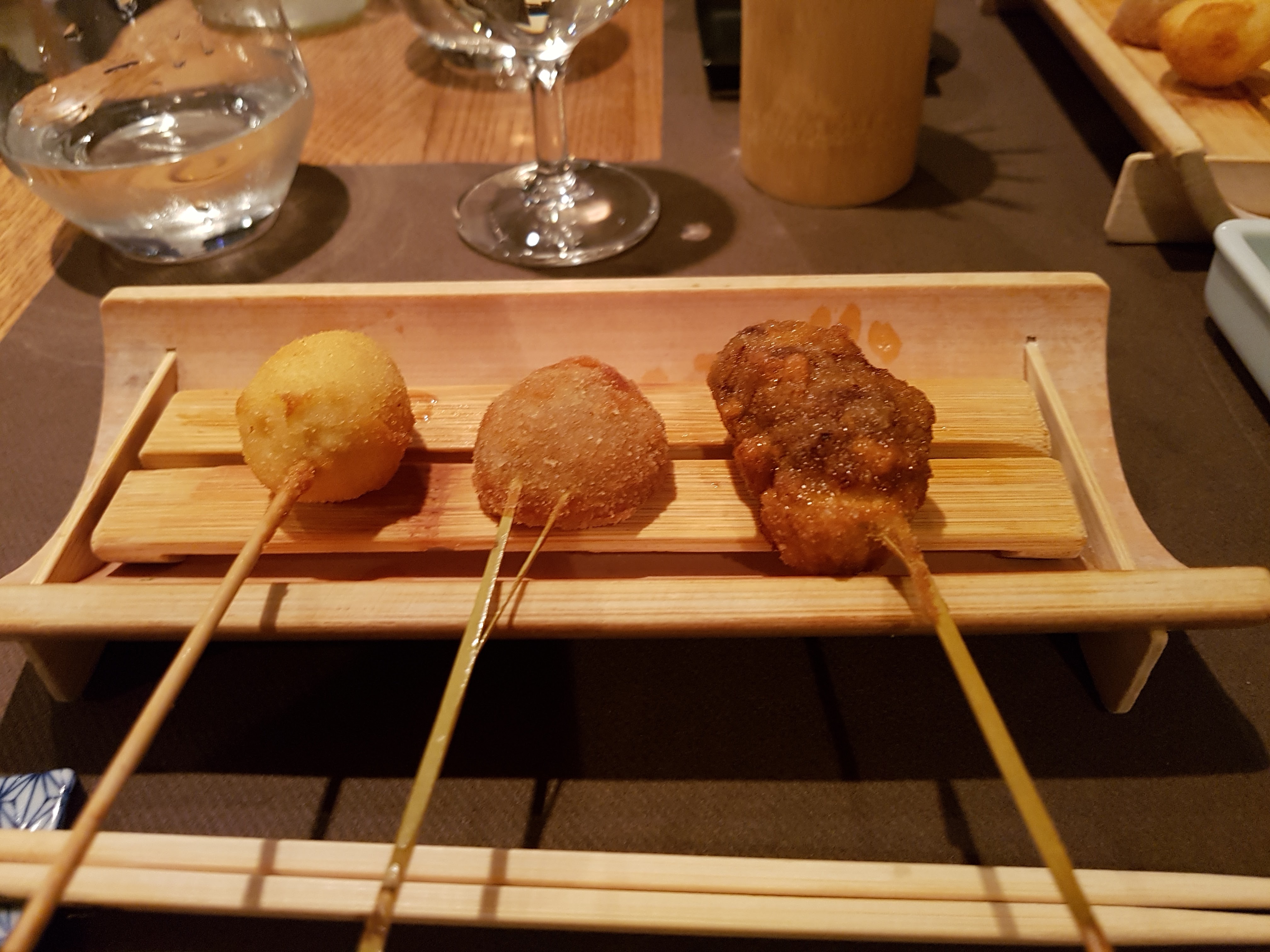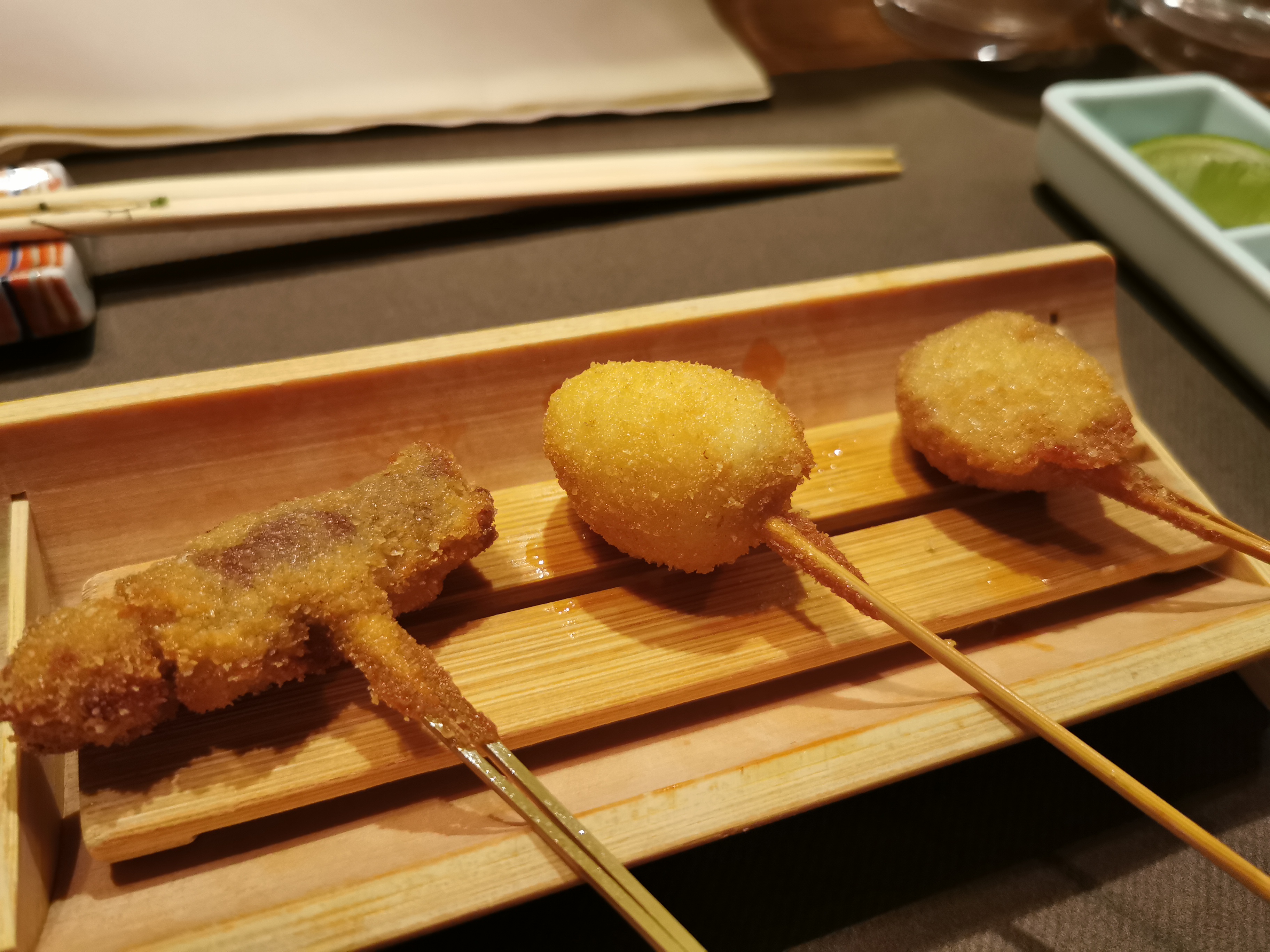 Lieu atypique, merveilleux et raffiné. Les kushiage sont des petits bouchés japonais frits et panés (pas gras du tout et ultra frais). Une spécialité de ce restaurant donc normal qu'il y a en quantité dans leur menu.