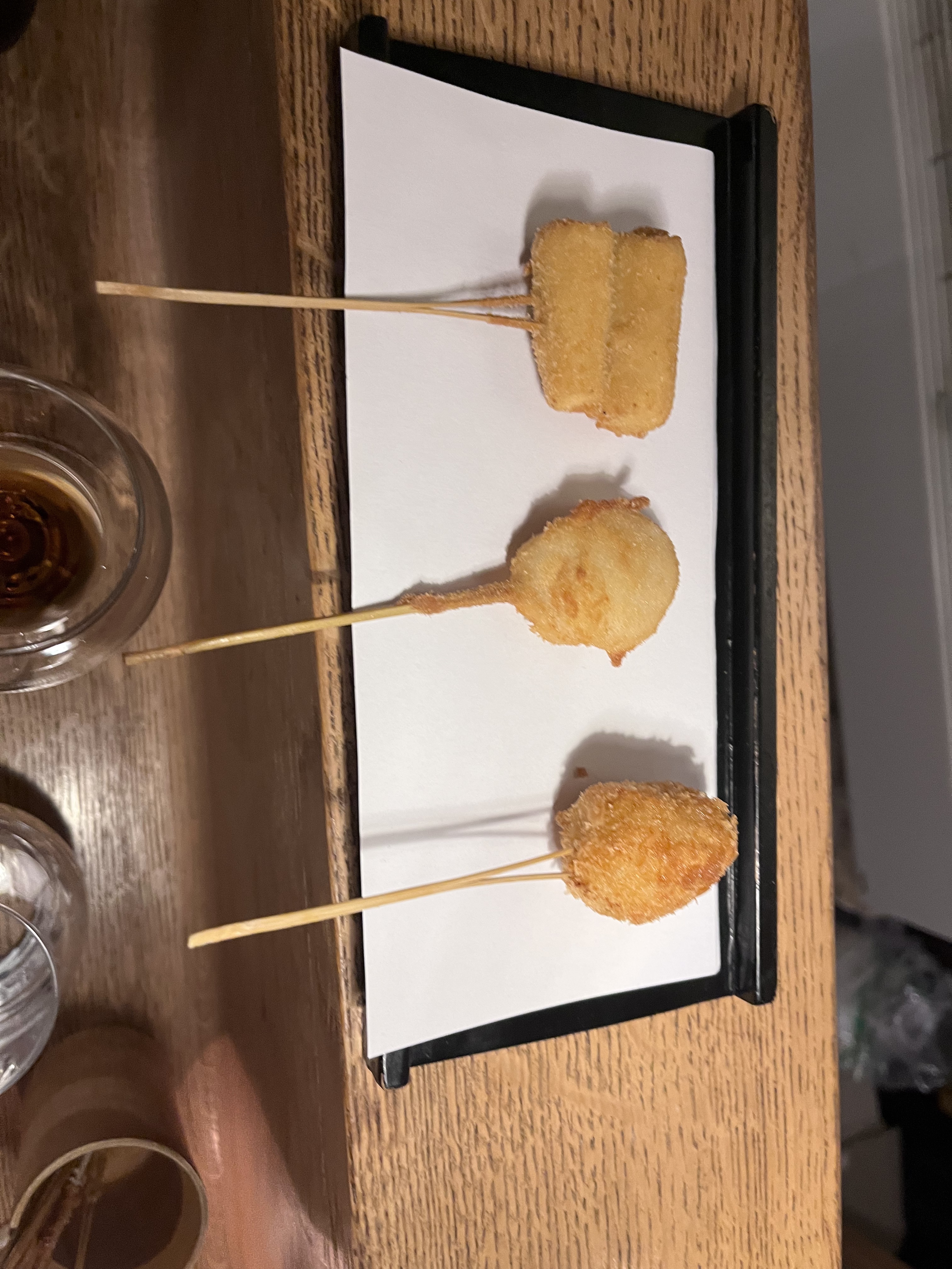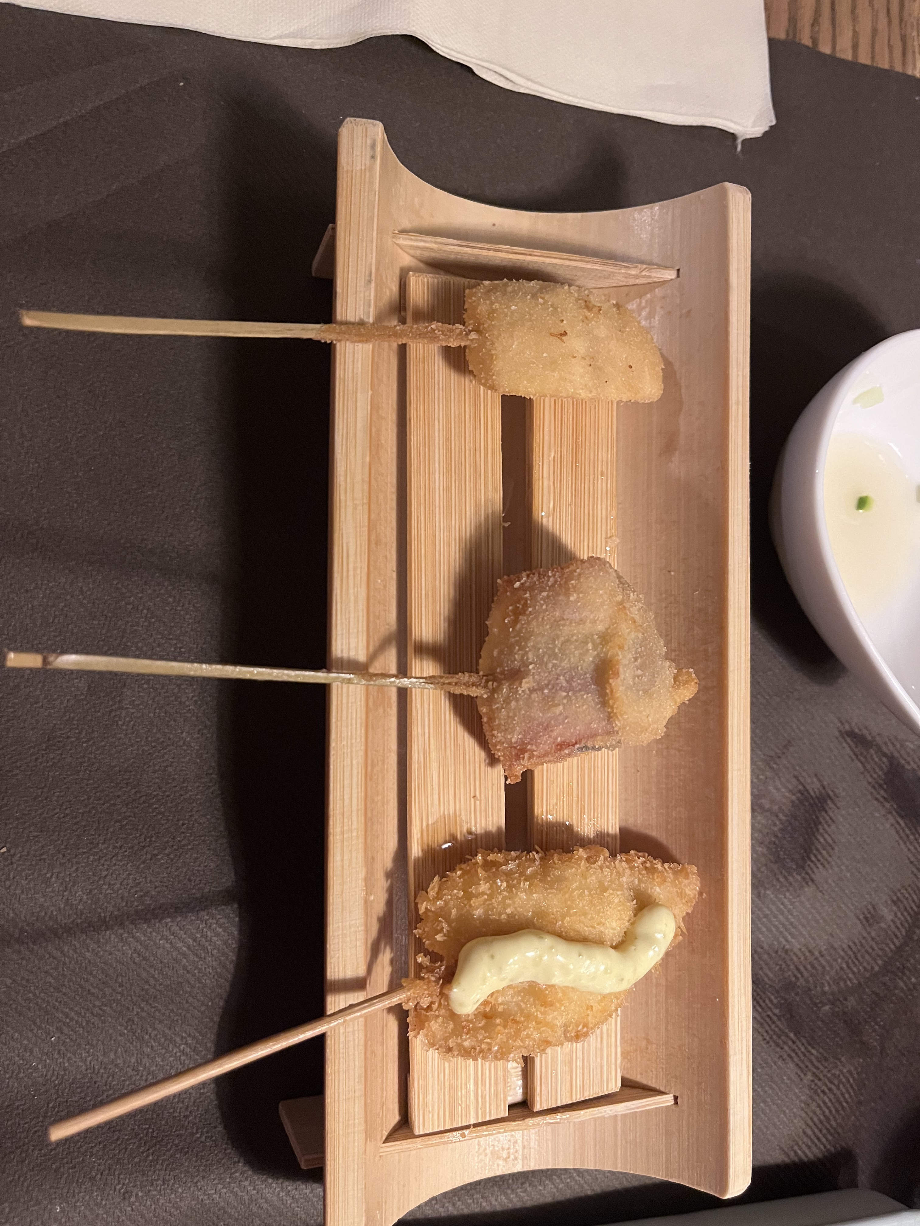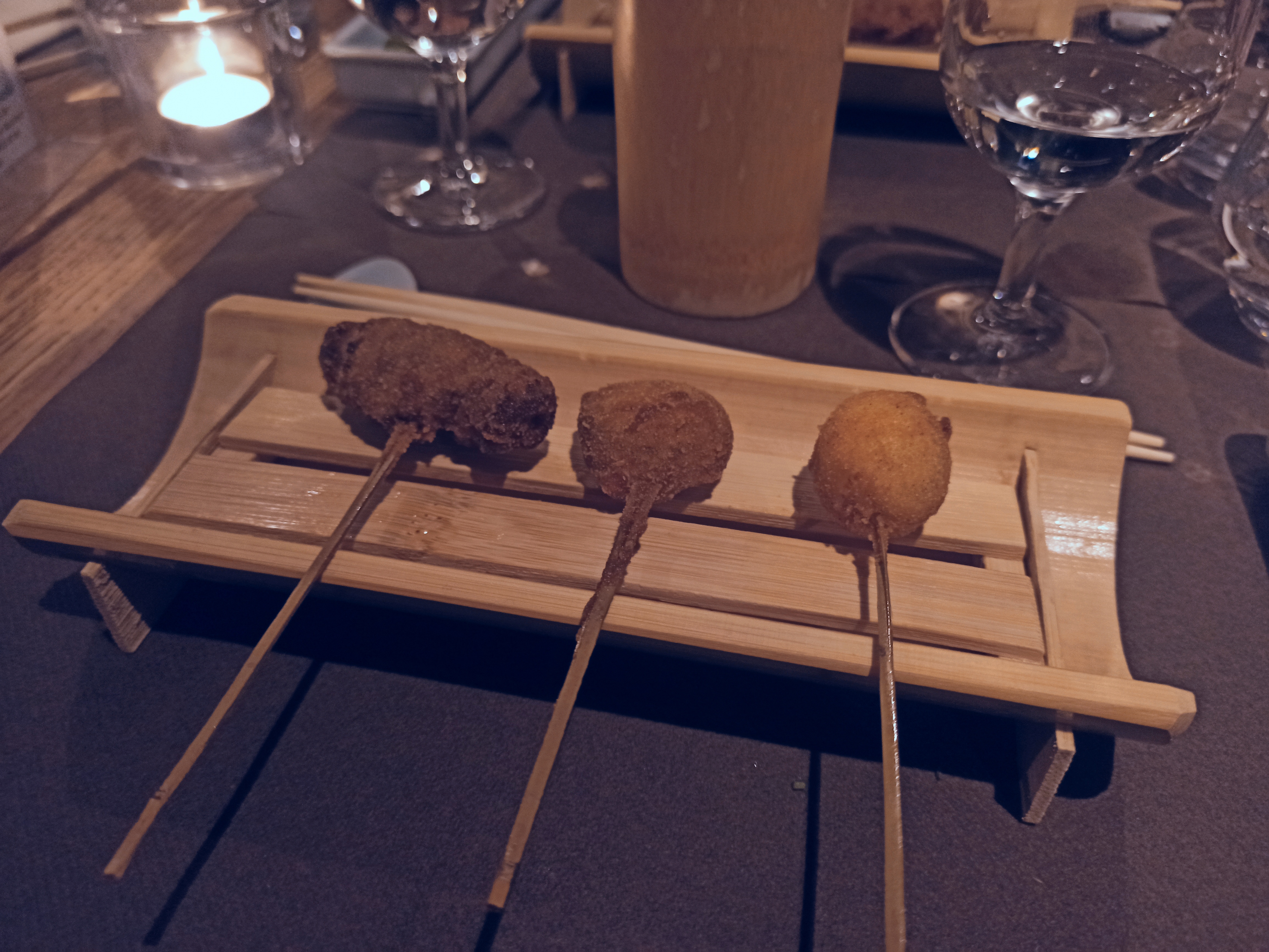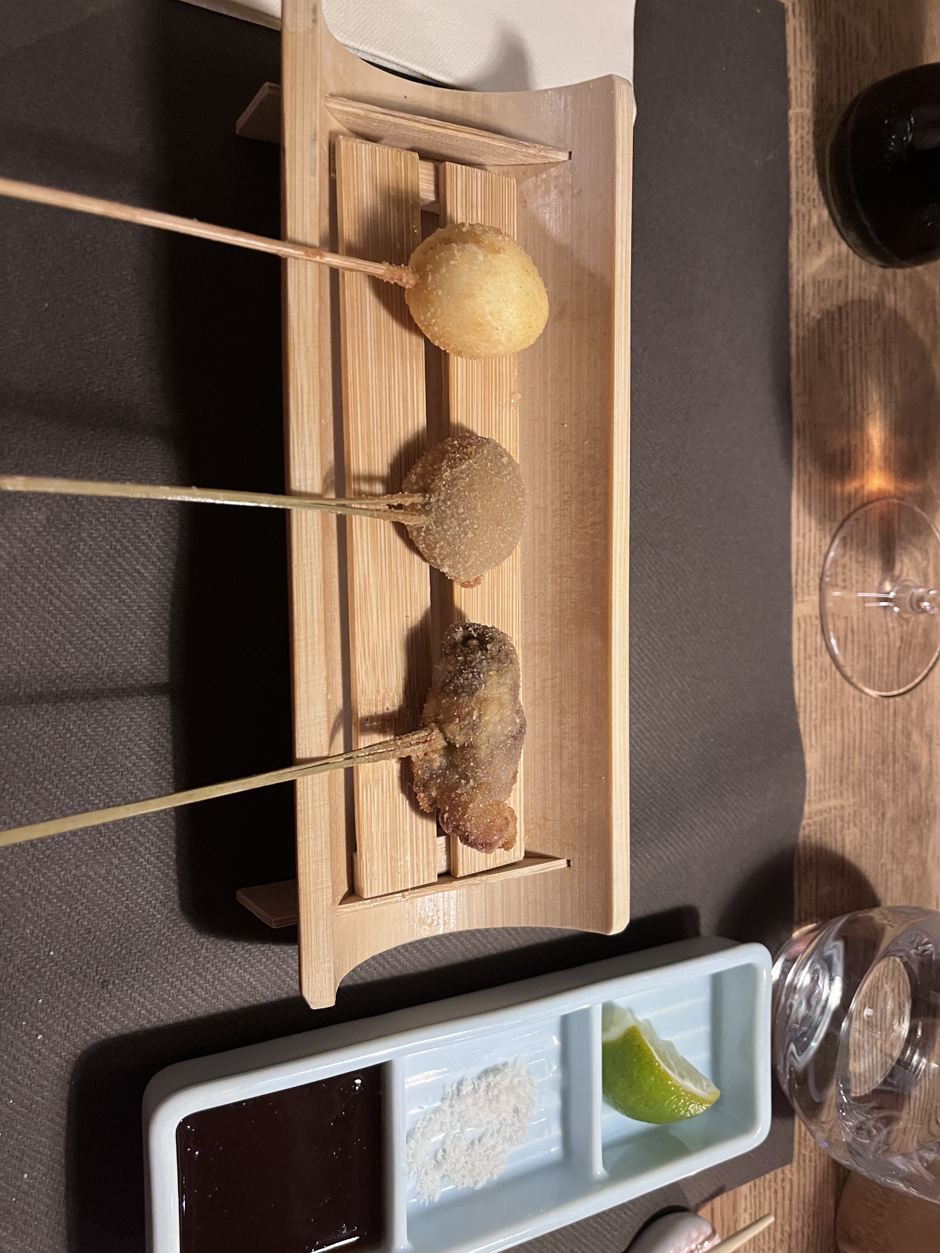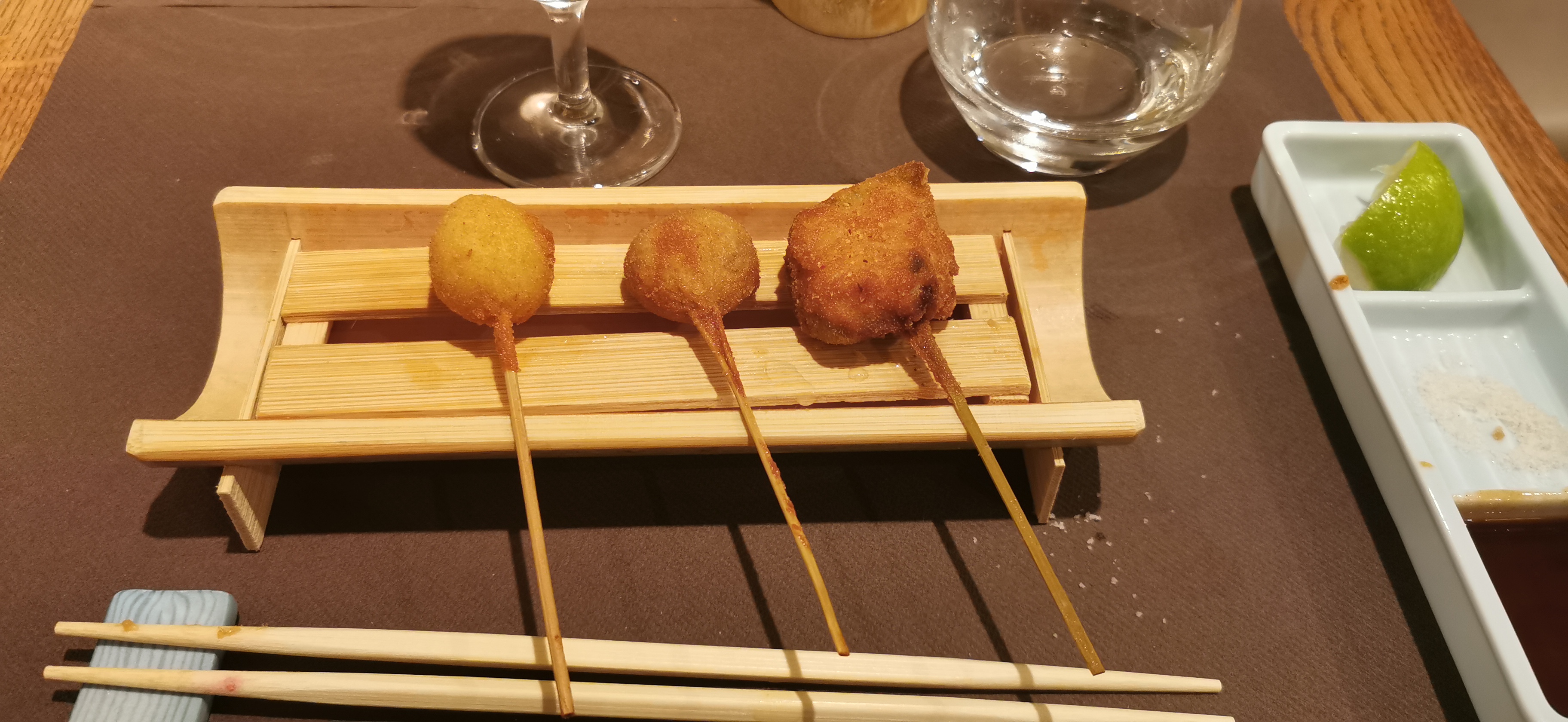 Lieu atypique, merveilleux et raffiné. Les kushiage sont des petits bouchés japonais frits et panés (pas gras du tout et ultra frais). Une spécialité de ce restaurant donc normal qu'il y a en quantité dans leur menu.