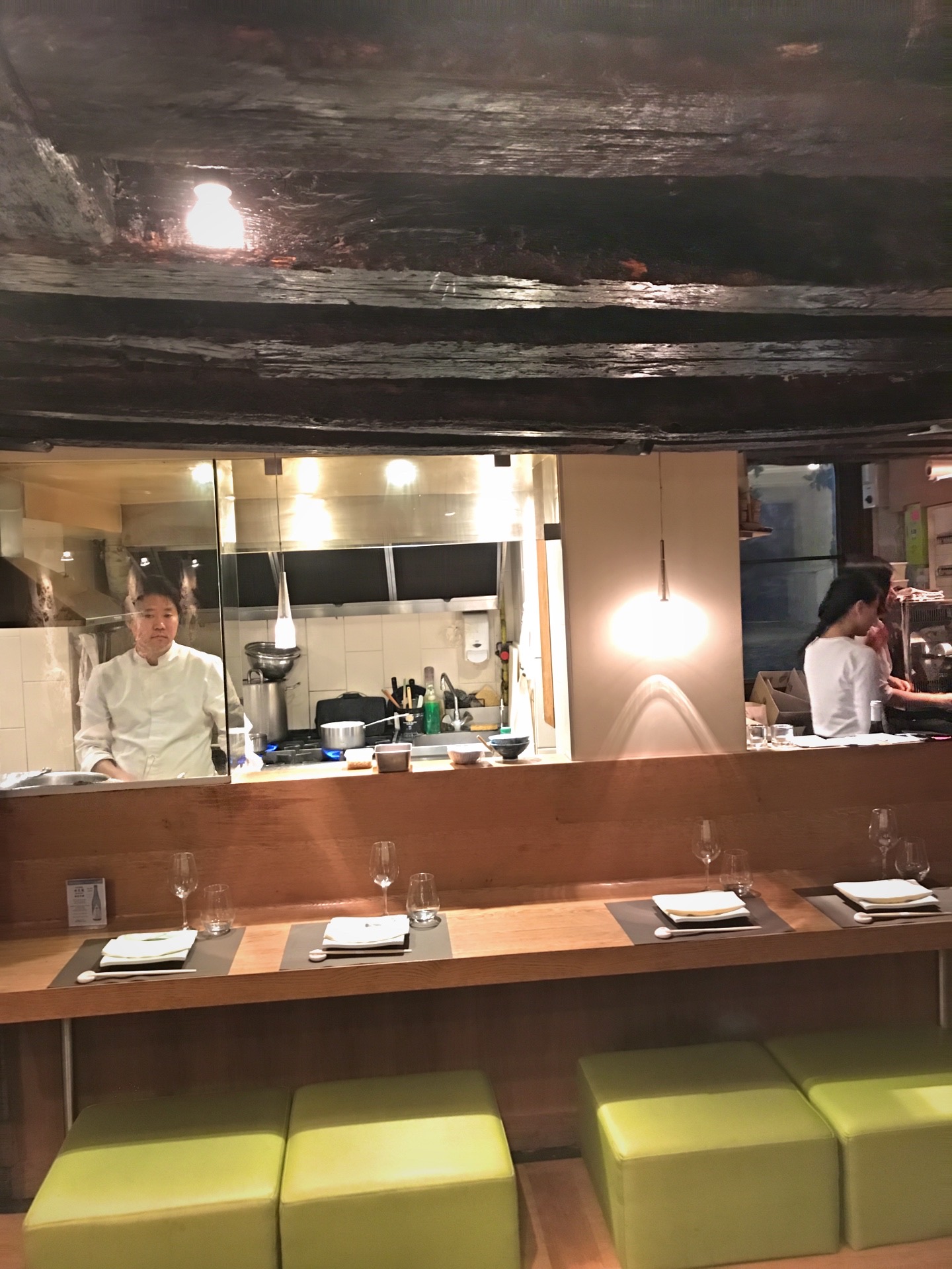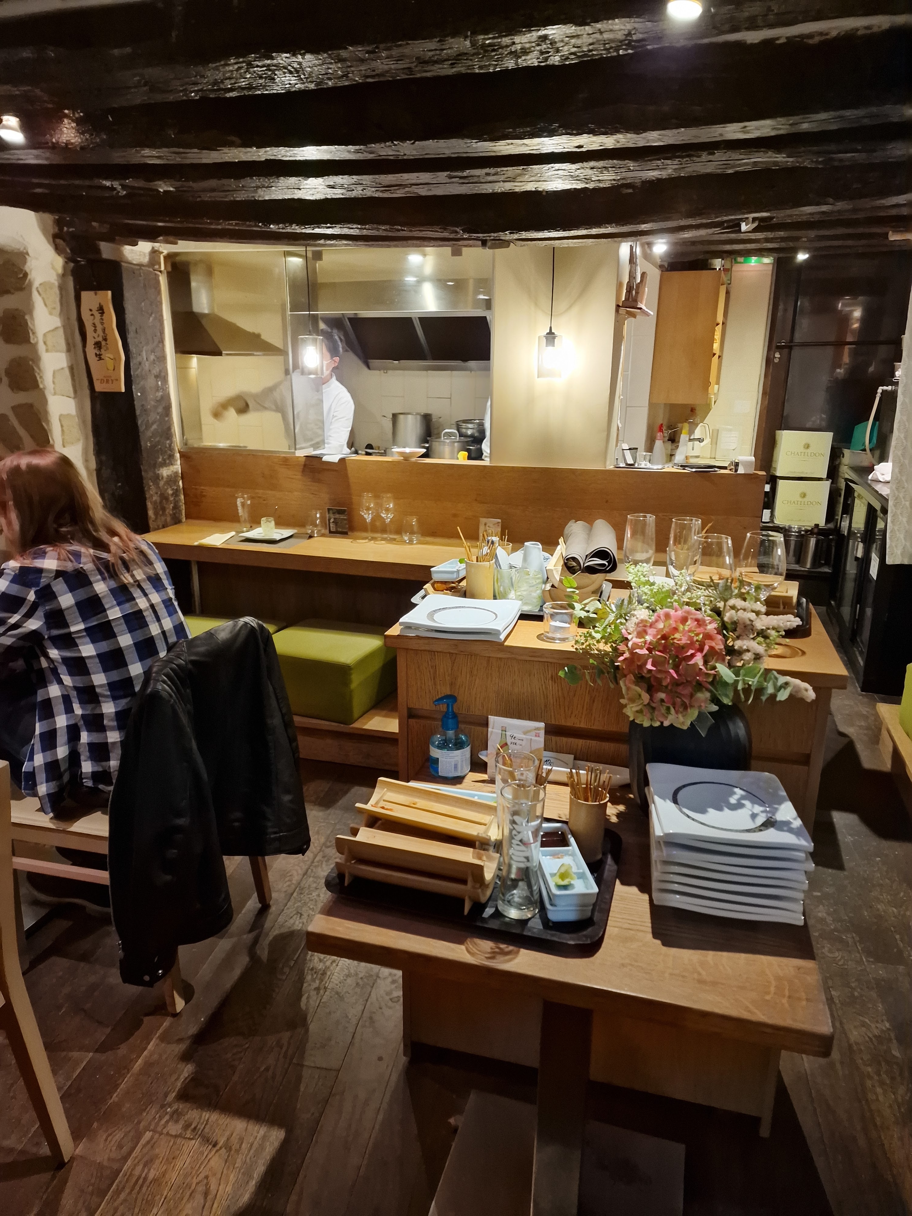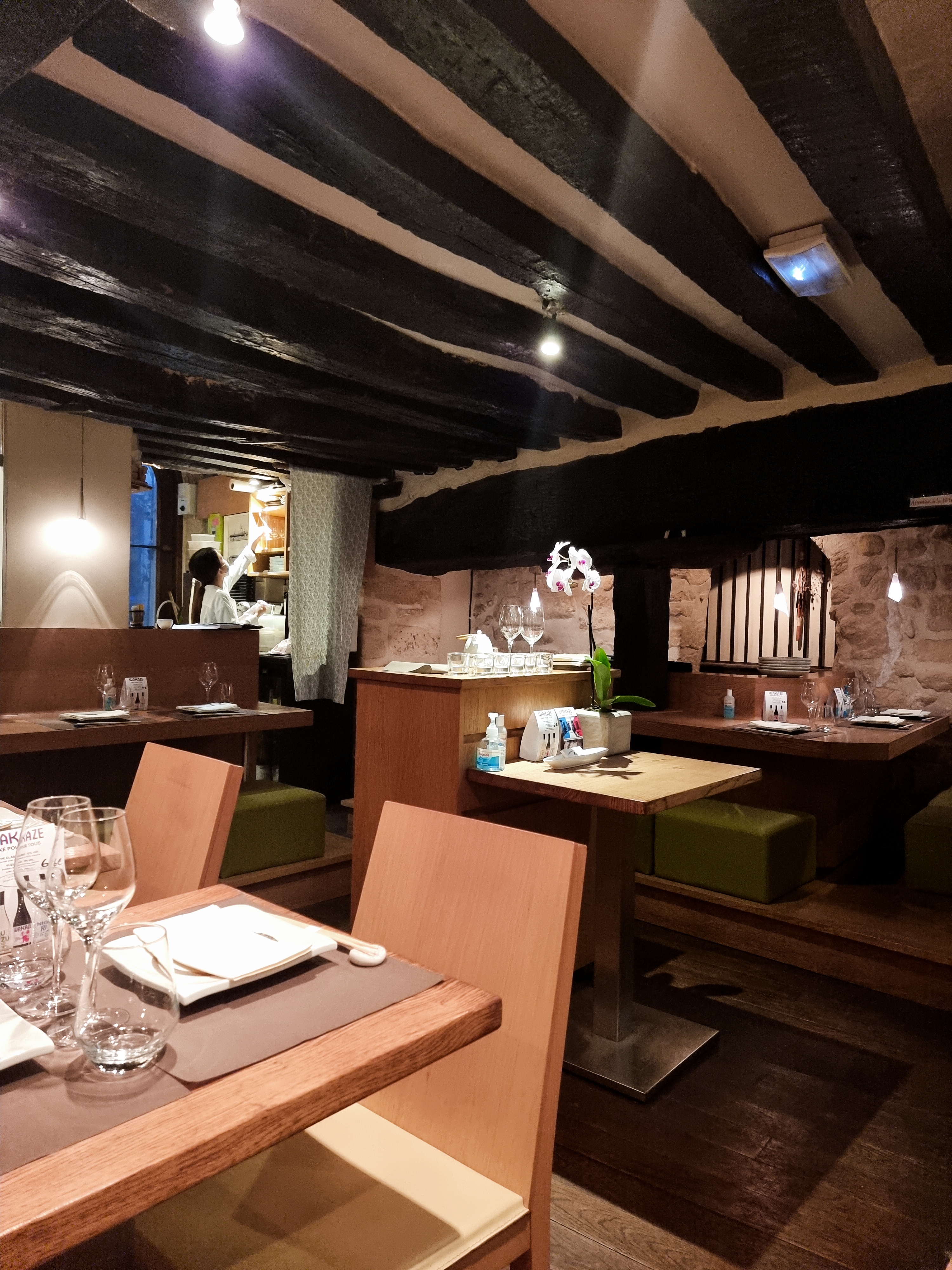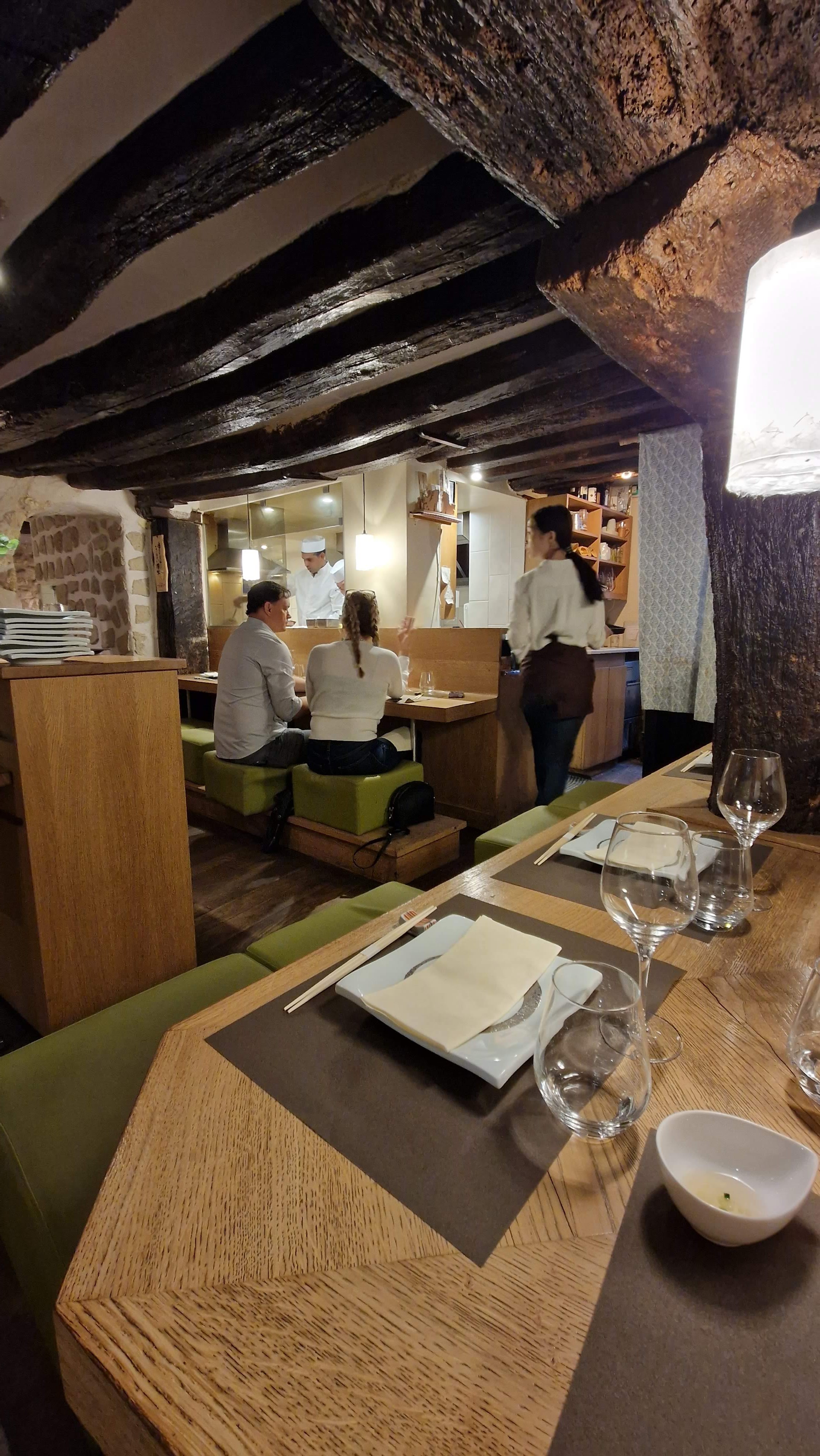 Un lieu surprenant et atypique, caché dans une ruelle. Le style mobilier japonais s'allie aux vielles poutres et pierres du bâtiment parisien. Les plats sont délicats et fins, en petites portions mais nombreuses et s'enchaînent avec justesse.