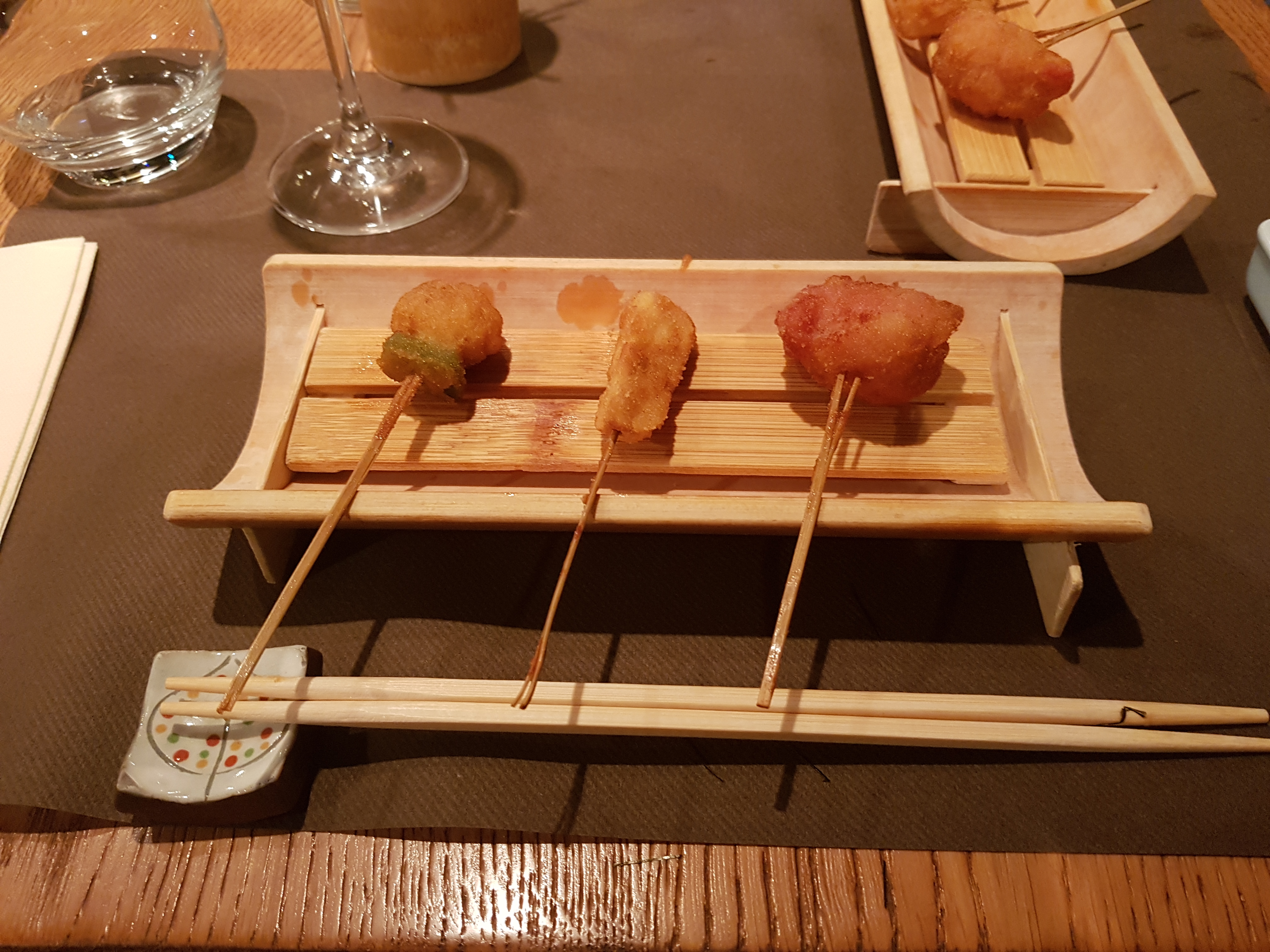 Le Shu est une expérience en soi des l'entrée du restaurant si atypique. A l'intérieur, une décoration sobre et un menu simple: des assortiments de kushiage! Les kushiage sont des brochettes japonaises récouverte d'une fine panure. N'allez pas penser un instant au yakitori que l'on trouve dans la plupart des restaurants de sushi! Les kushiage sont raffinés et se composent de petites bouchées composés de légumes, viandes, poissons ou fruits de mer et parfois même de choses plus étonnantes (risotto). Un vrai délice qui nous fait voyager le temps d'un repas et surprend les invités à coup sûr!