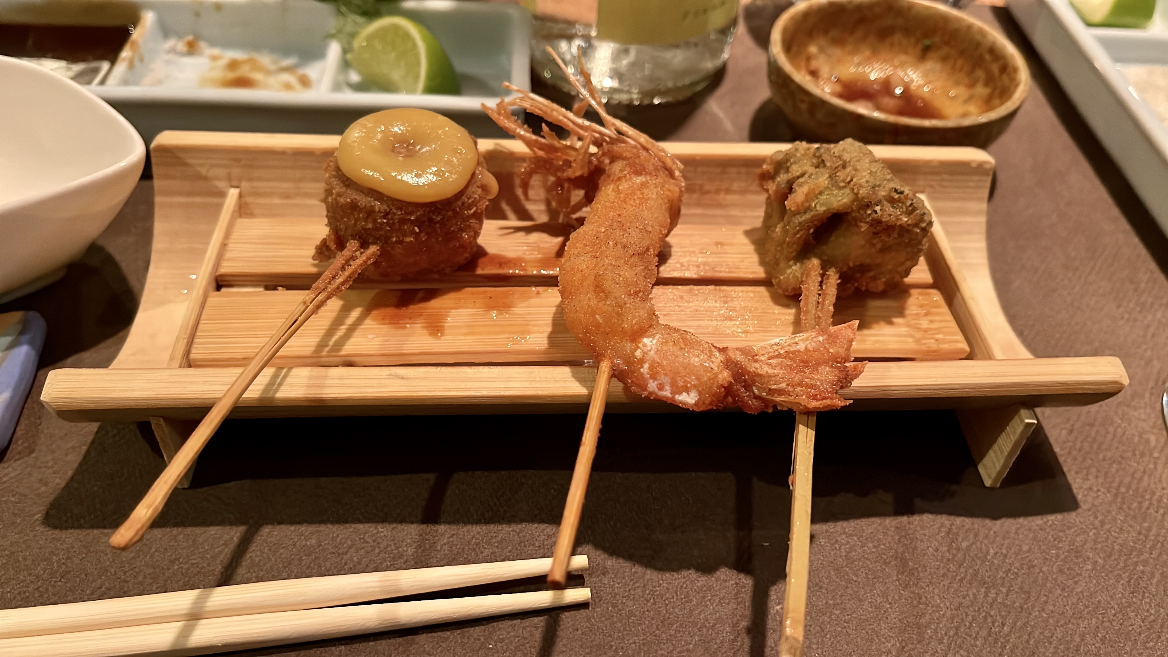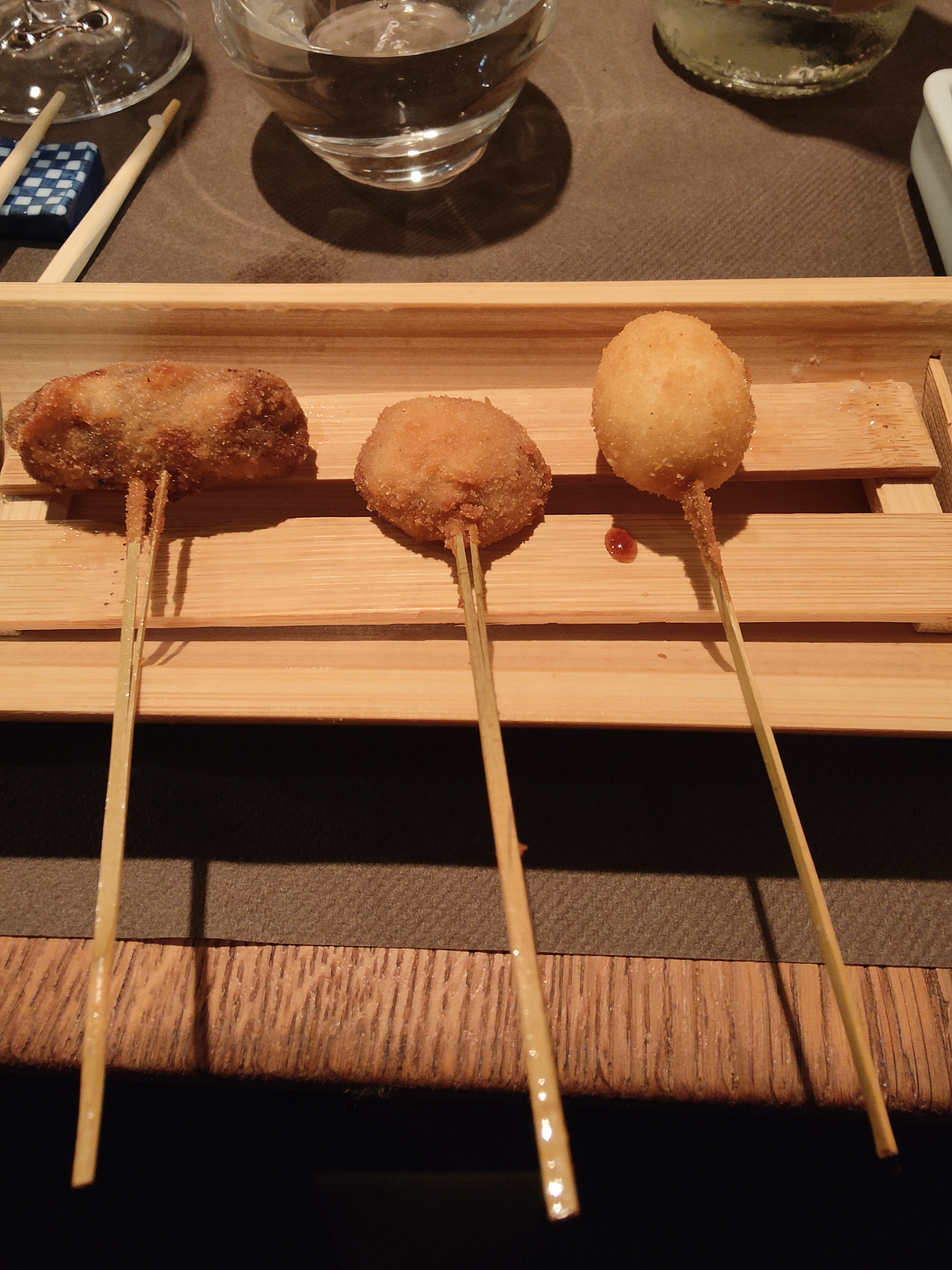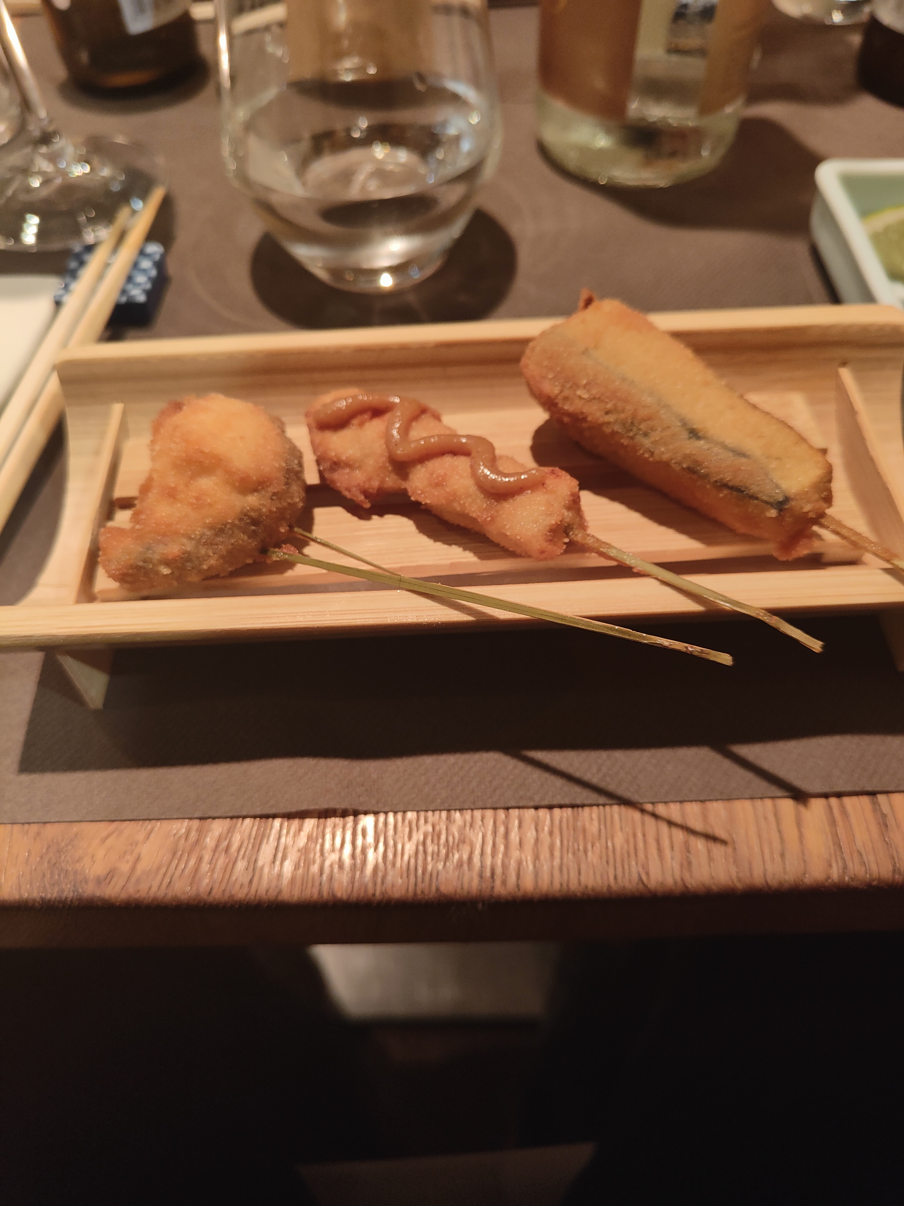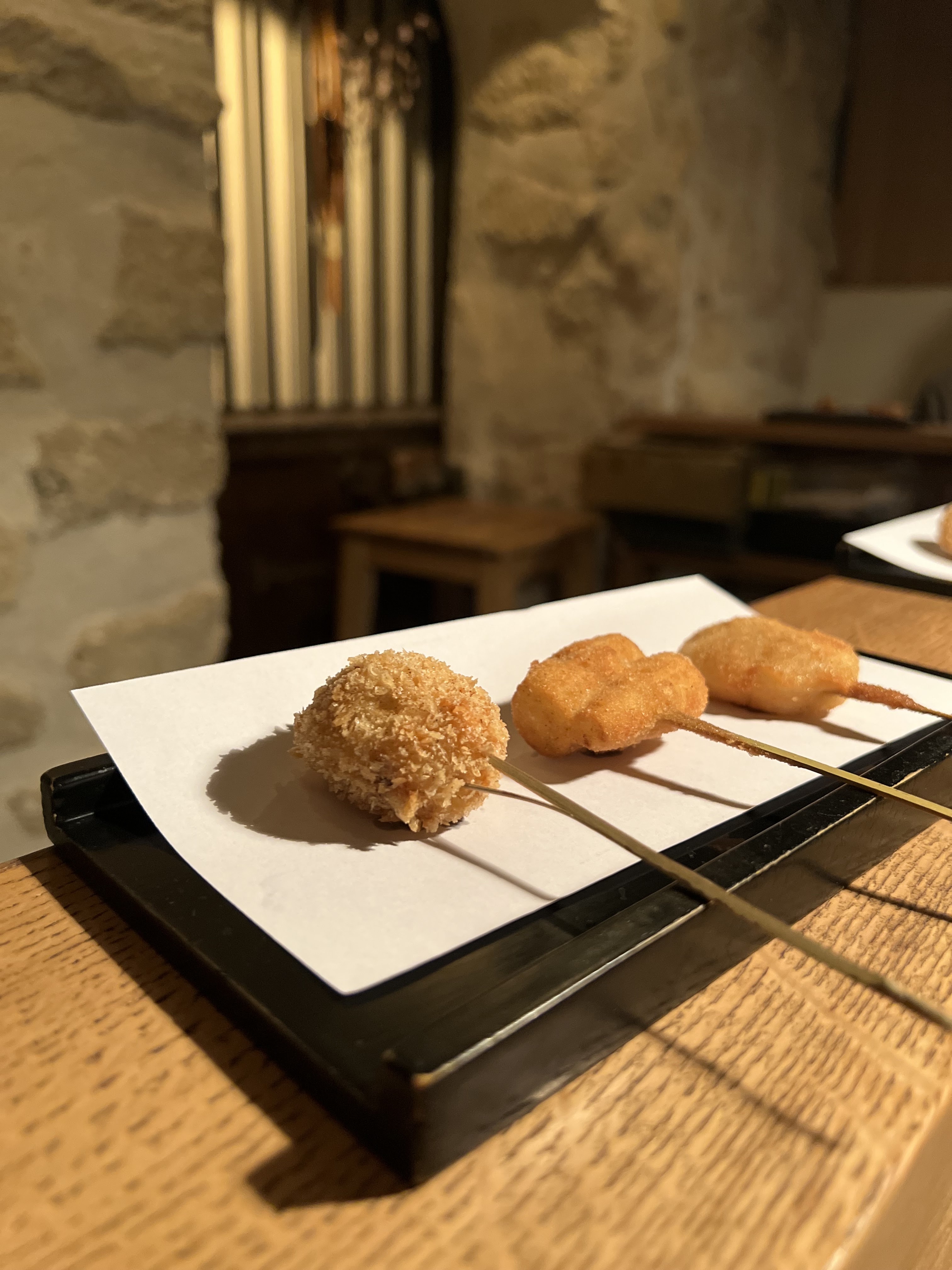 Spécialité japonaise kushiage -- petites brochettes frites. Menu composé de plusieurs amuse-bouches, 15 brochettes différentes, un udon froid ou un ochatsuke(riz au thé assaisonné), et un dessert. Tous les plats sont préparés soigneusement et sont très bon. L'intérieur est un peu petit et atypique avec une hauteur sous plafond réduite, mais une fois entrer, l'ambiance est chaleureuse et conviviale. À venir et revenir.