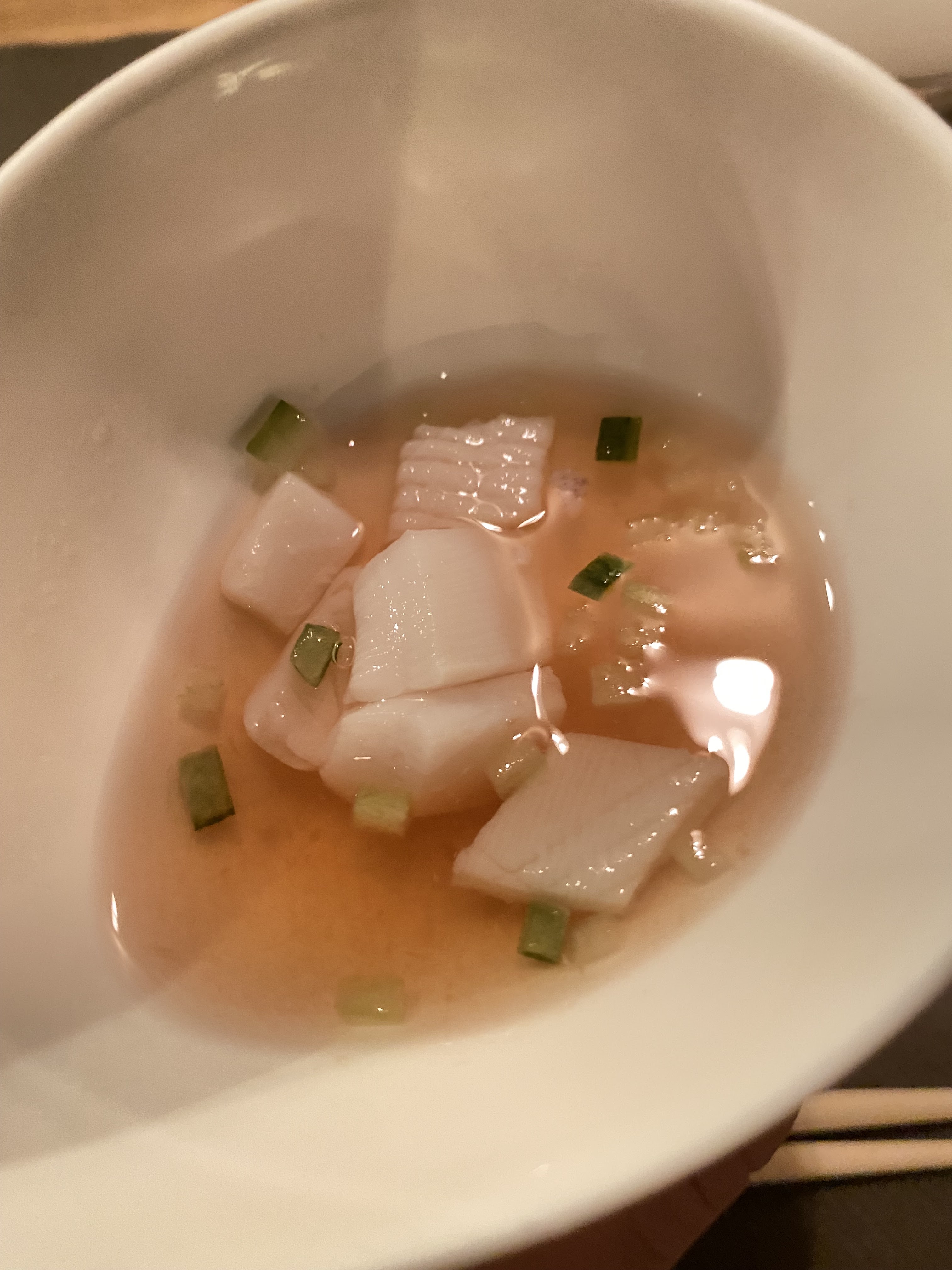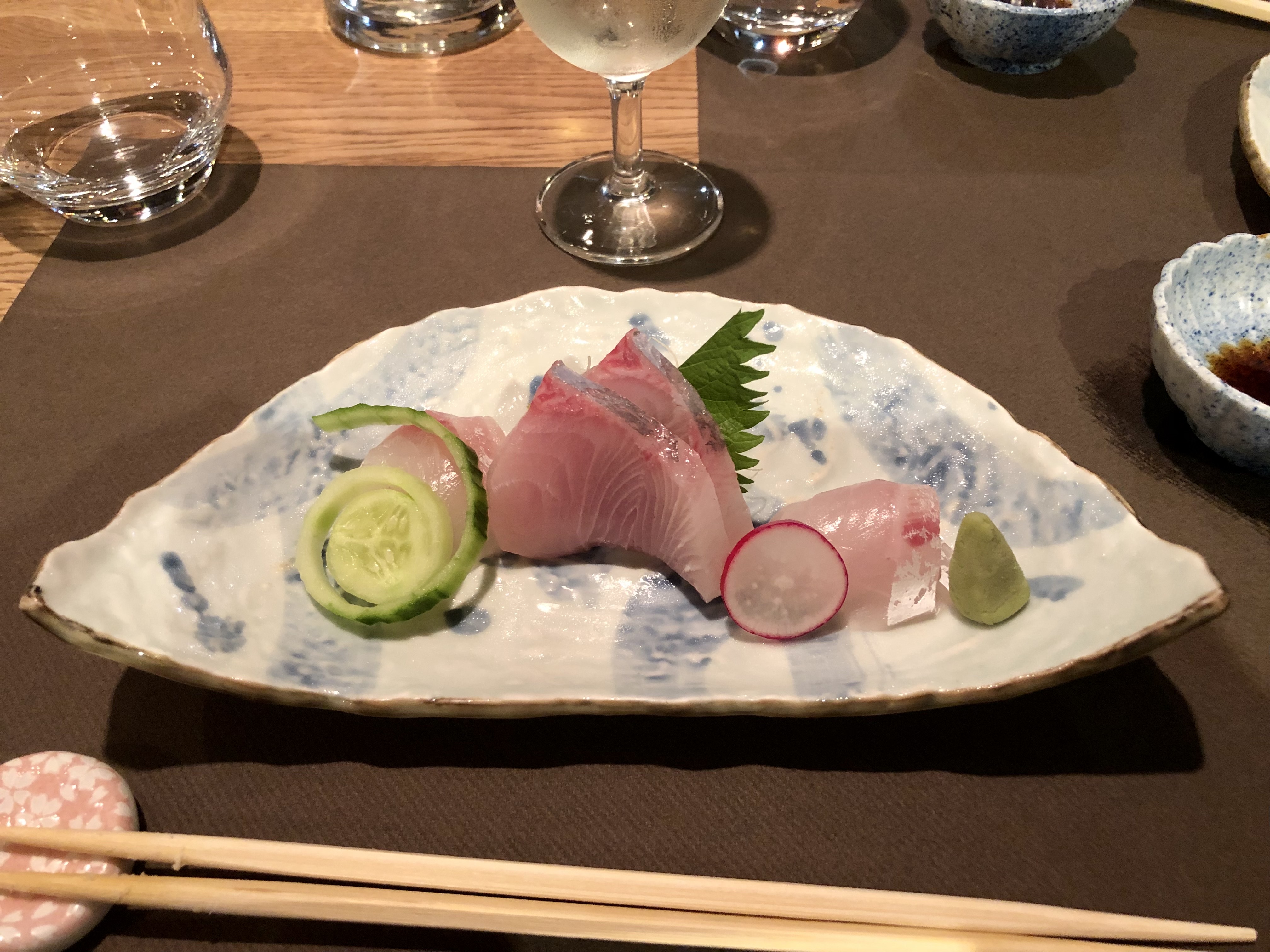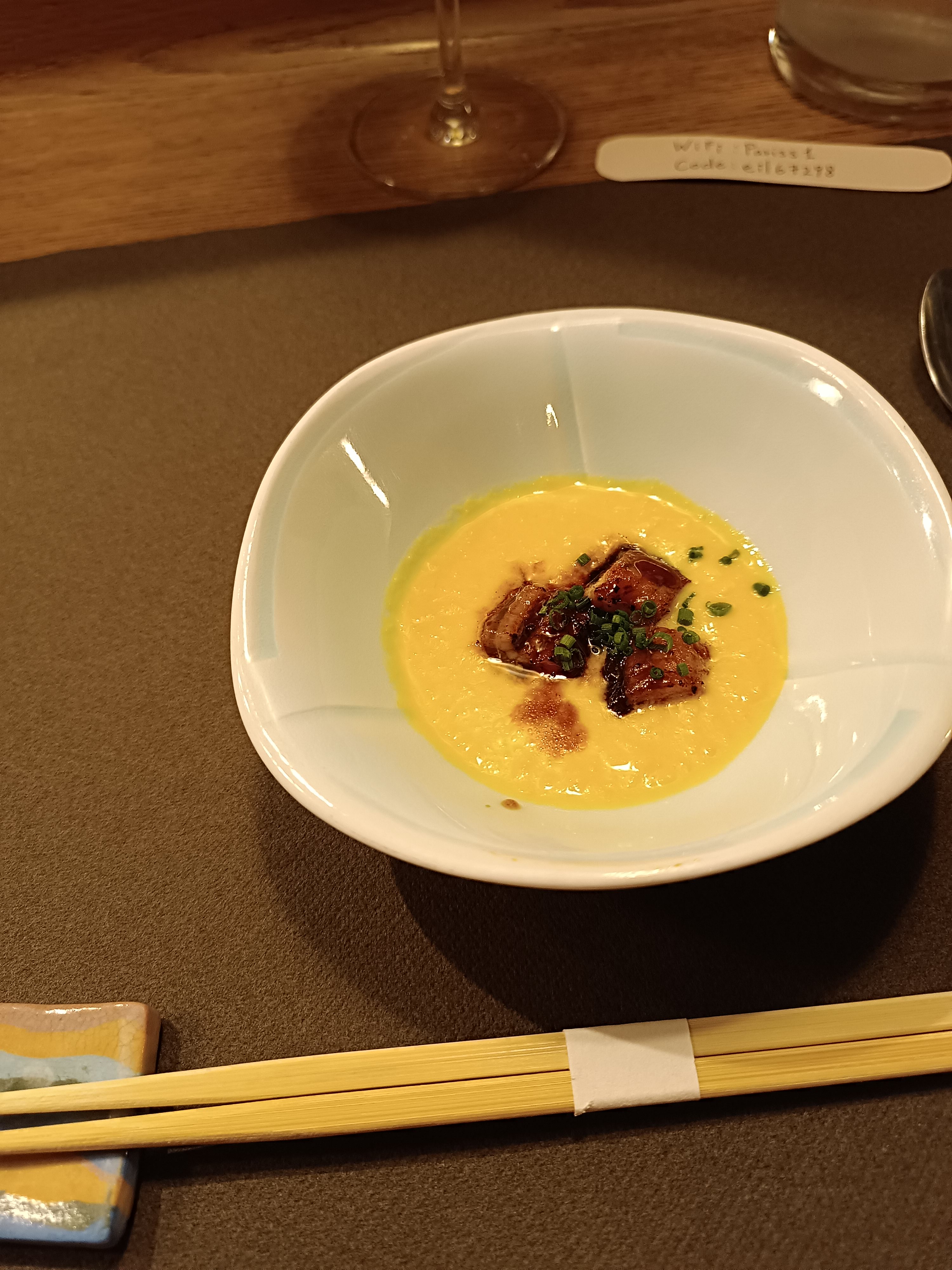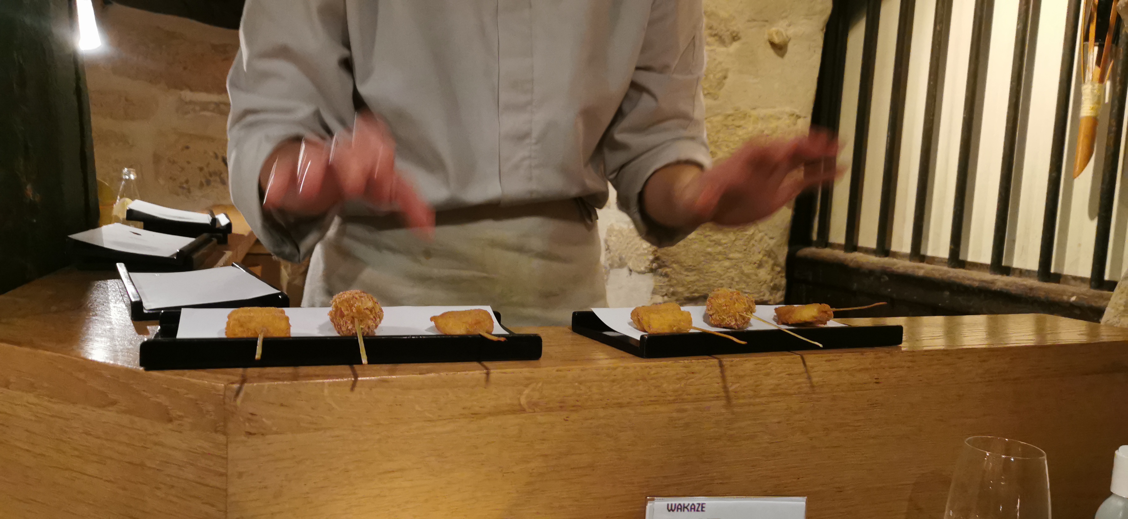 J’ai juste adoré L’ entrée est basse il faut bien se baissé sinon on se cogne la tête On entre dans une cave minimaliste Du 17 eme siècle Le décor est en bois, chêne clair D’entrée de jeu on est bien et la présentation de la table est élégante On découvre une cuisine maîtrisée 15 brochettes style Osaka Le style est toutefois moins maîtrisé que chez Bon, et les choix des brochettes , kushiagué, plus européen Les sashimis d’ouverture du menu à 52€ sont une tuerie ! Fraîcheur exceptionnelle Le liche , le poisson japonais est un vrai délice Frit je le trouve moins goûteux Enfin soupe de riz, ochakuzé, chaude, bien assaisonnée ou des nouilles fines d’Inaniwa, les pâtes ont ma préférence, froides et très agréables en ce temps de forte chaleur 🥵 Les toilettes sont propres mais sans plus La lunette des toilettes des femmes est à réparer