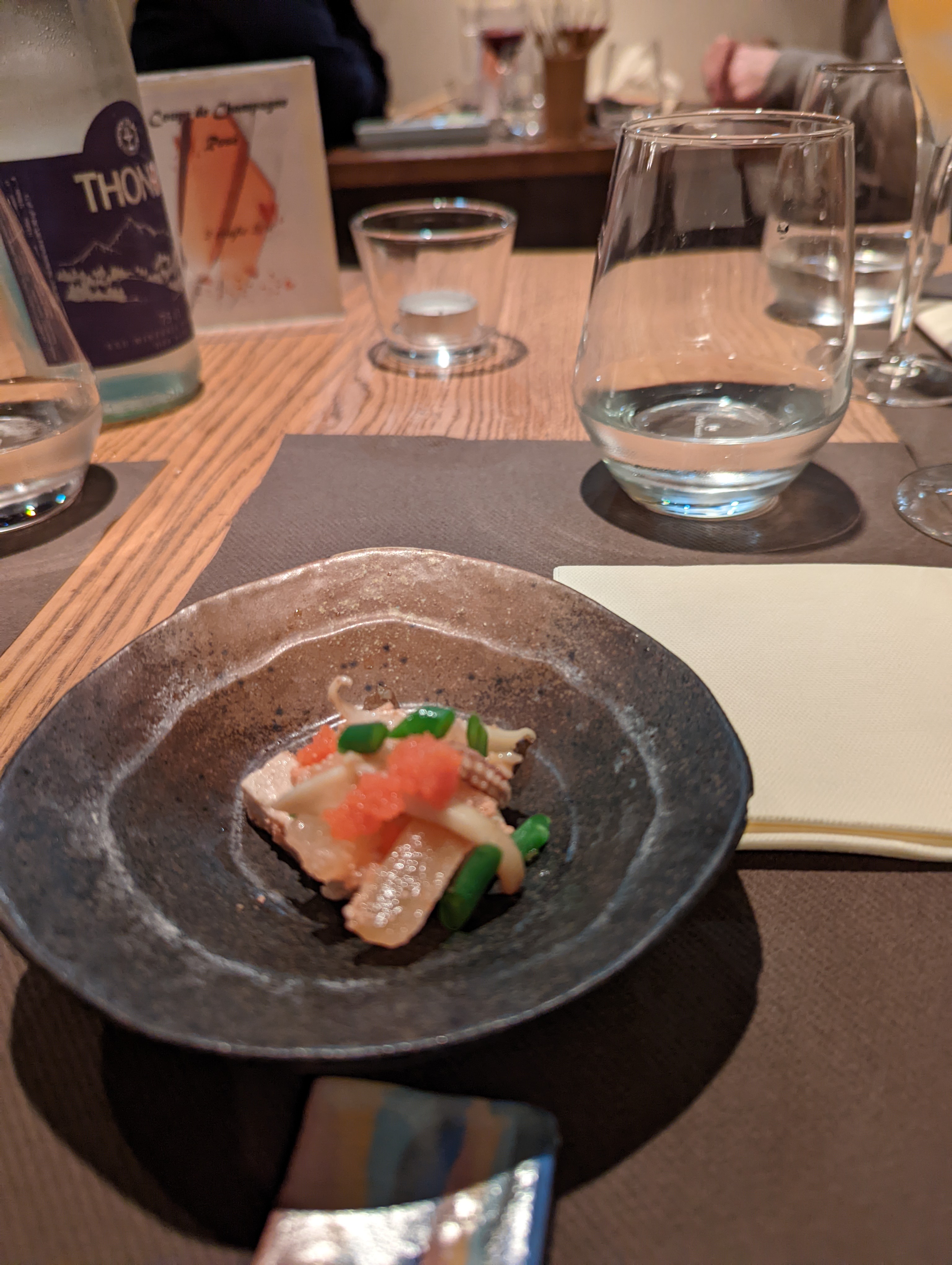 Ce restaurant nous a fait vivre une expérience très agréable. Le lieu est cozy et l'entrée au sous-sol par la petite porte surprenante. Le personnel est au petit soin et le service reste chaleureux avec un grand sens du partage. Nous avons dégusté des mets raffinés et tous aussi goûtus les uns, les autres ! On retient votre tempura de foie gras ( tout simplement la bombe de ce repas ). Le saké chaud a accompagné avec merveille notre dîner. Et nous avons terminé par de très bon dessert. J'ai eu une préférence pour le pamplemousse givré que j'ai trouvé plus léger que le non moins délicieux et original tiramisu châtaigne-matcha. This was our little moment of bliss. Merci !