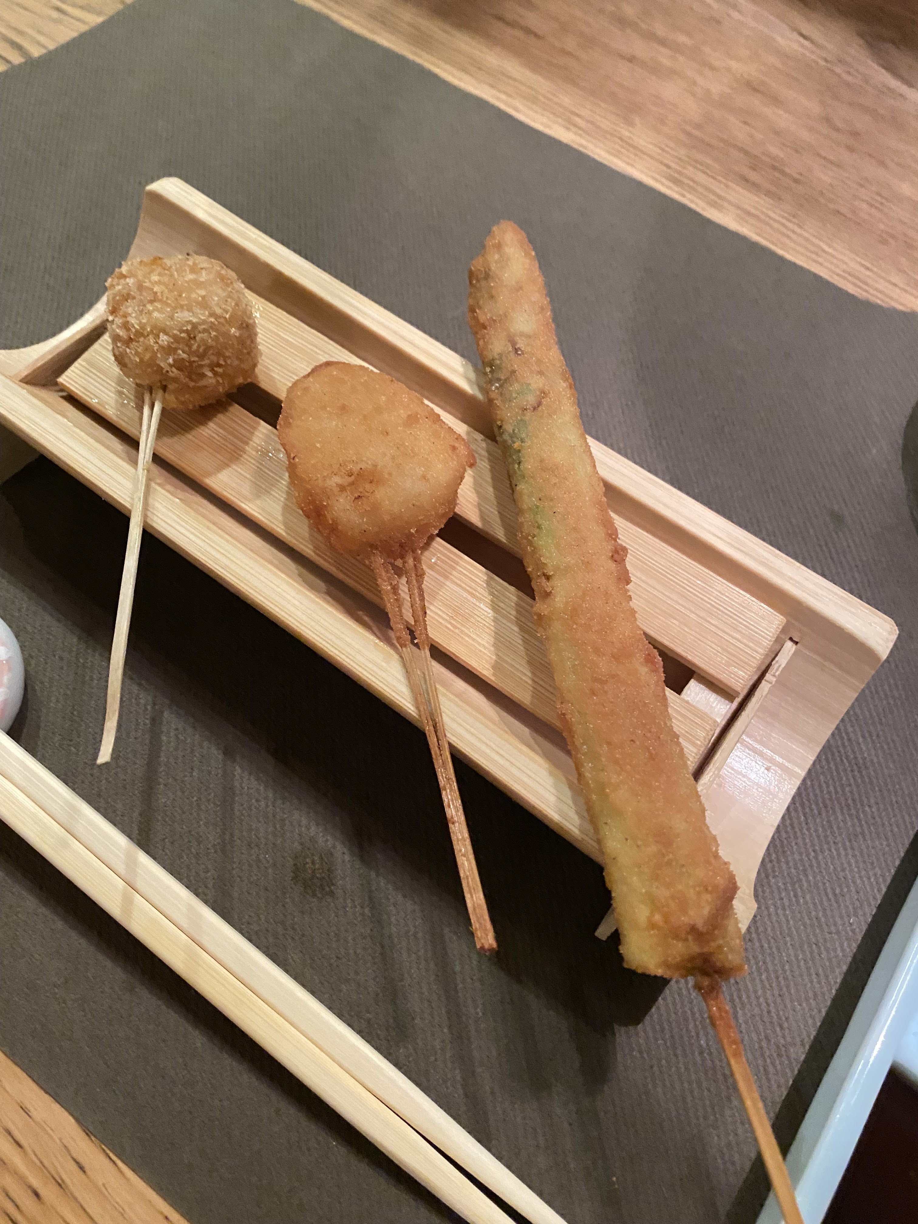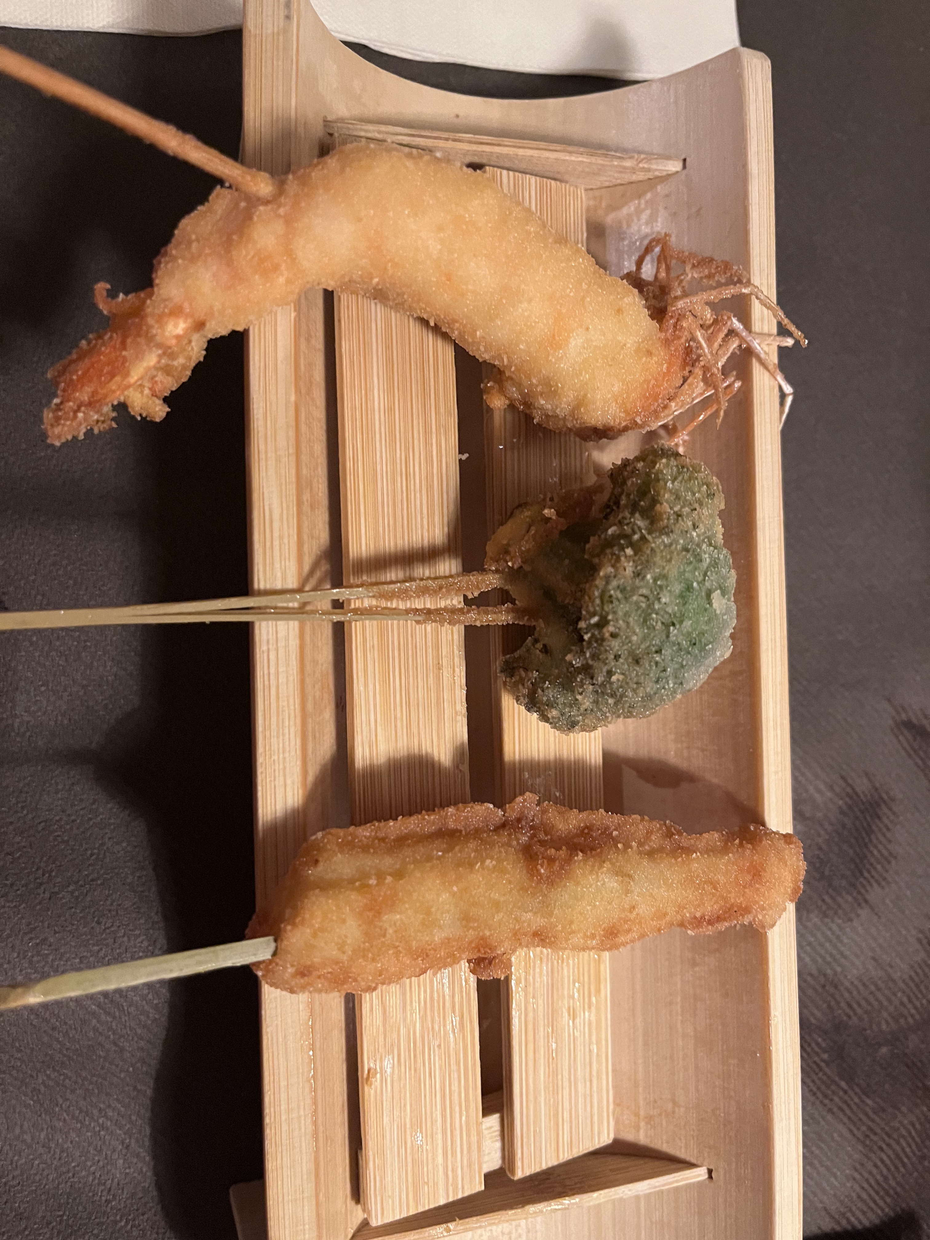 Nous avons très bien été accueilli dans ce petit restaurant à la décoration simple mais très jolie. La cuisine japonaise ne se résume pas qu'aux sushi, yakisoba, ramen, onigiri et autres. Il existe une spécialité venue d'Osaka appelé Kushikatsu. Ce sont des fritures en brochette allant du plus simple au plus sophistiquée. C'est la spécialité de ce restaurant et les 15 Kushikatsu du menu ont des saveurs et textures variées et vous raviront sûrement! Ca m'a rappelé ceux que j'ai mangé au Japon. Si jamais il y a des aliments que vous ne pouvez pas manger, ils vous le demanderont avant et s'adapteront. Je recommande!