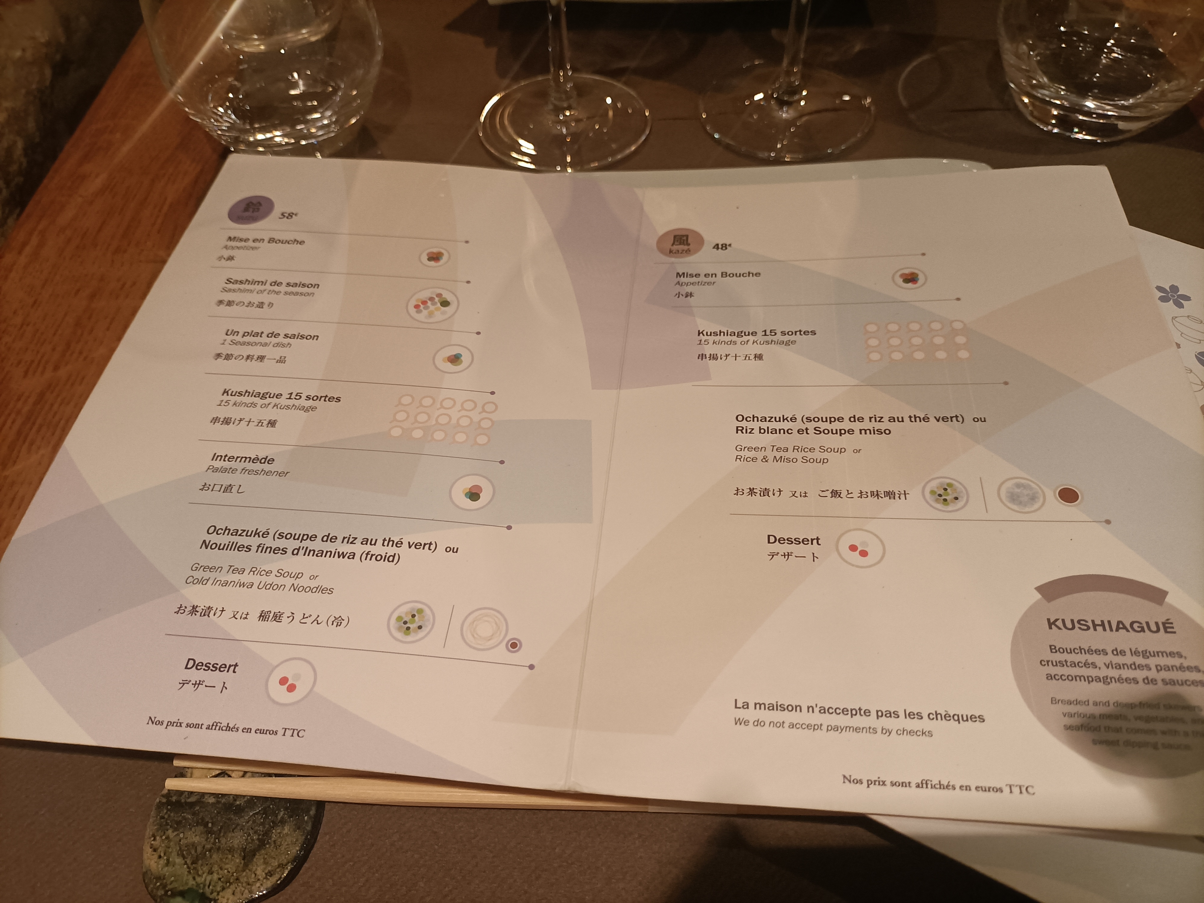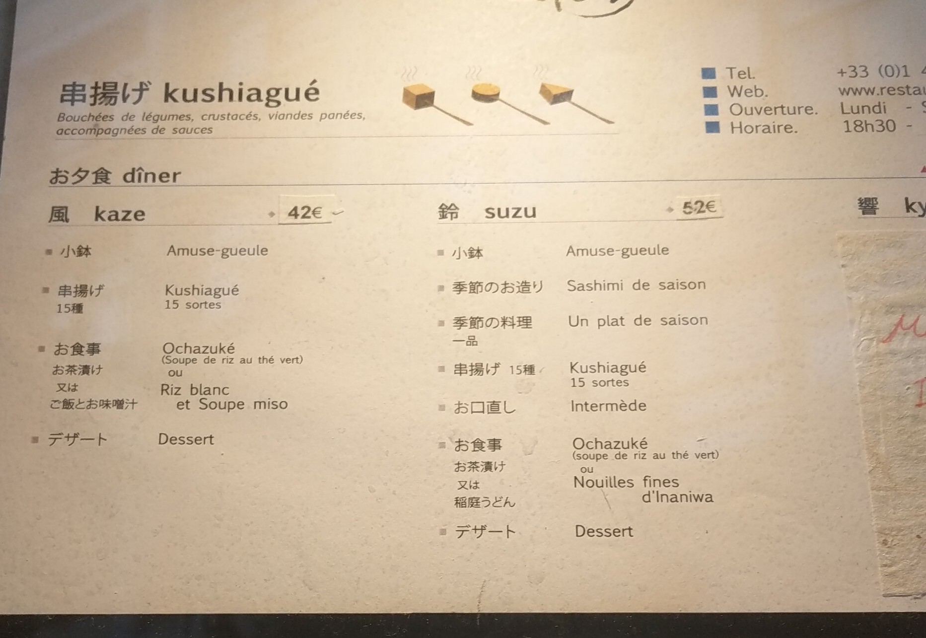 LE restaurant spécialiste du kushiage. Tout est raffiné: le cadre, l'accueil, le service et évidement la nourritures. Trois menus gastronomiques (Kyôu, Suzu et Kazé ) pour découvrir une succession de petites bouchés panées de viandes, de légumes, et de crustacés .