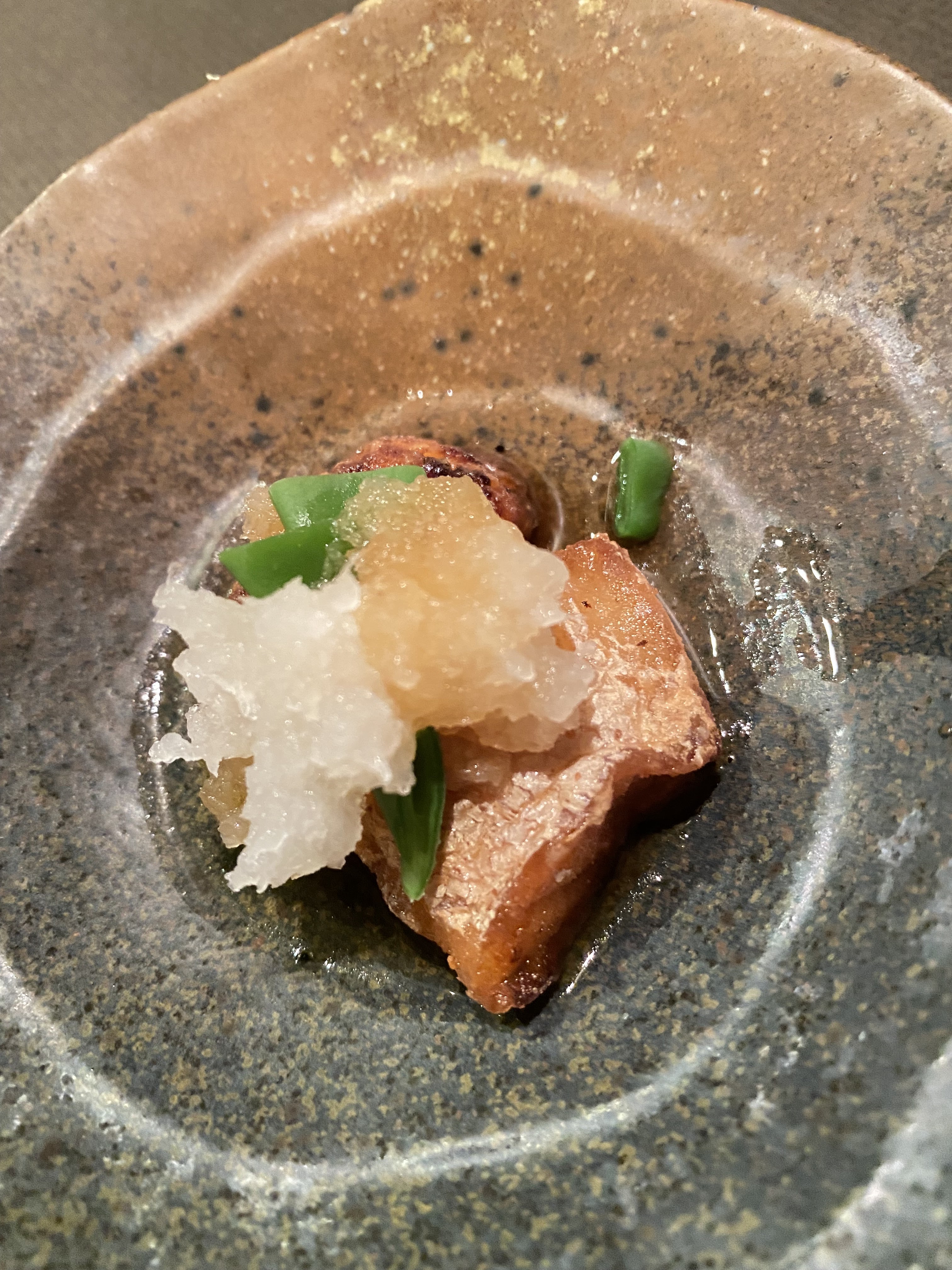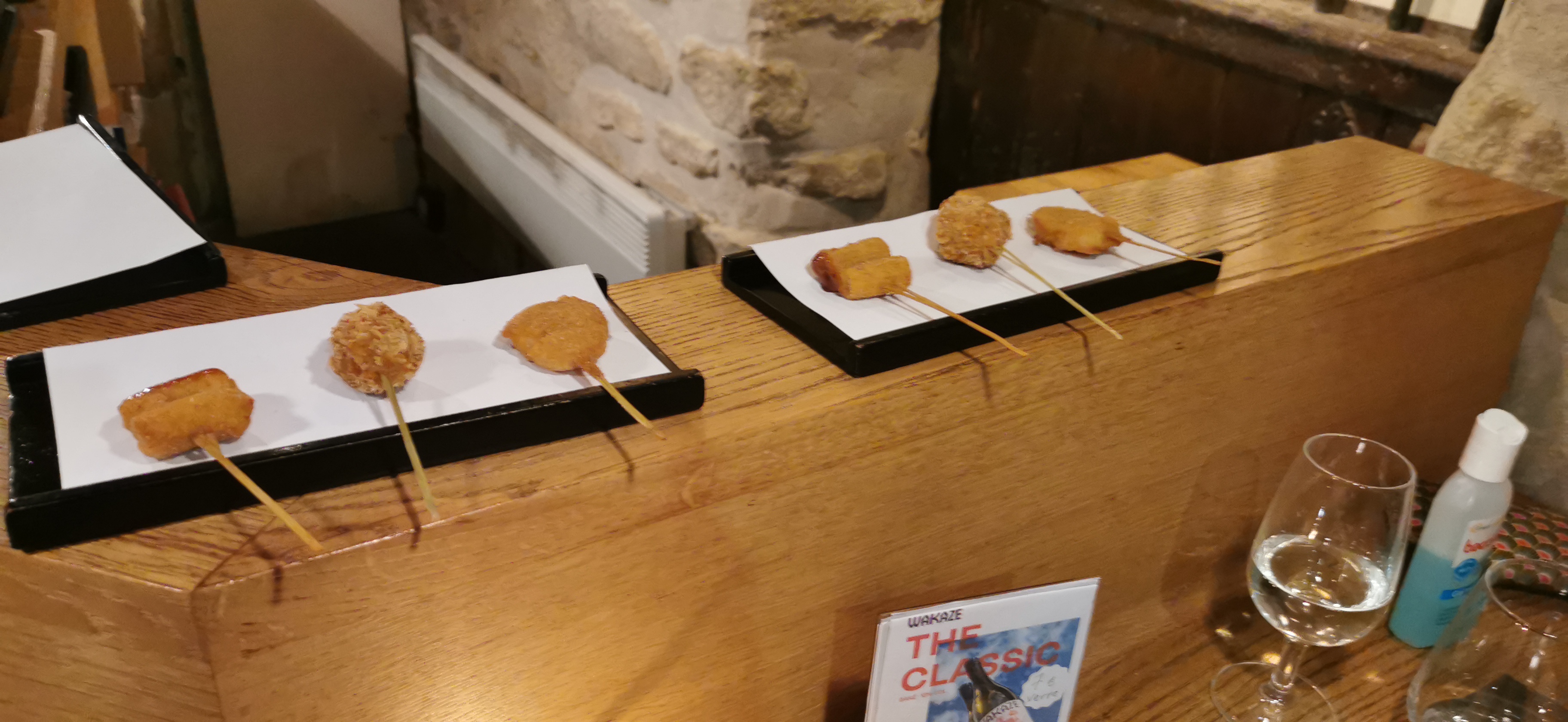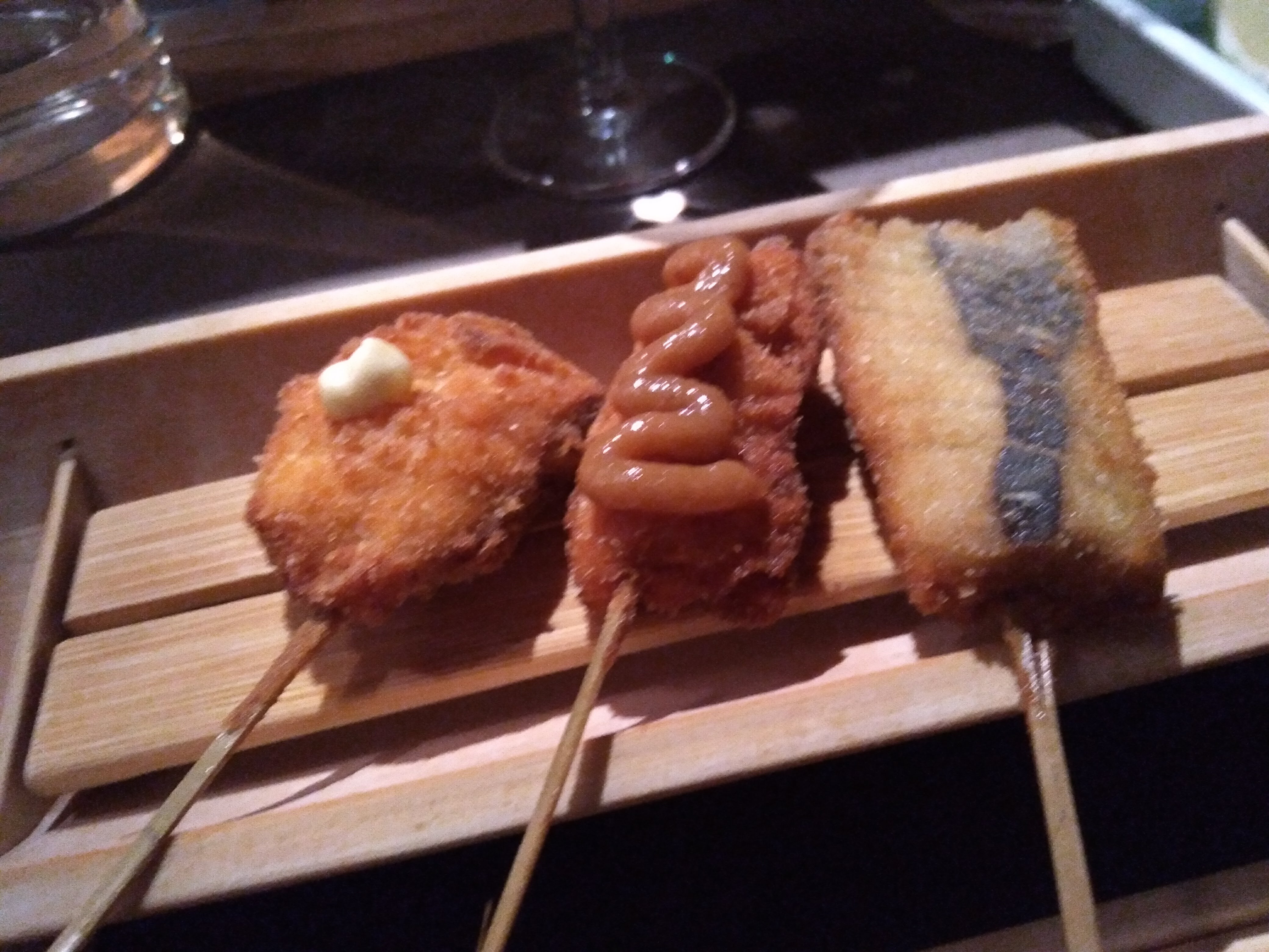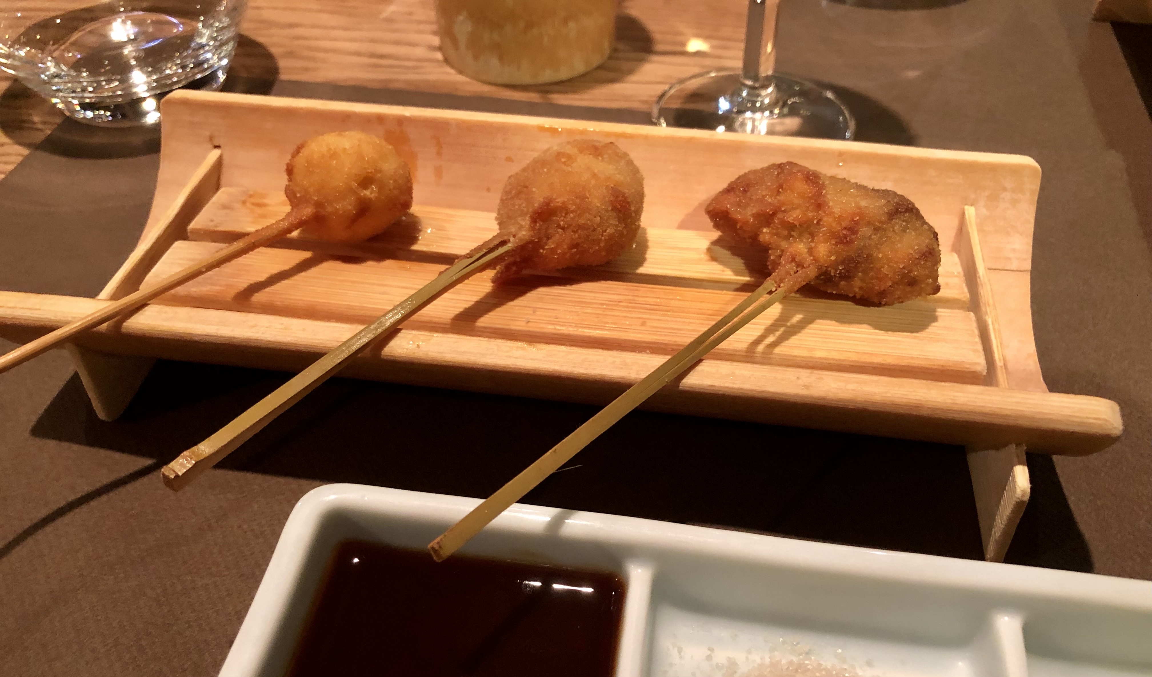 Restaurant spécialisé dans les kushiage, petites brochettes panées dans du panko (panure japonaise) très populaires dans la région d’Osaka. Viandes, fruits de mer, légumes, vous pouvez en trouver aussi aux œufs de caille, boulettes, fromages… Bref, on s’est régalé ! Deux choix de menu, avec mise en bouche, entremets et dessert, et une belle carte de sakés. Et le personnel est là pour vous conseiller tout au long du repas.