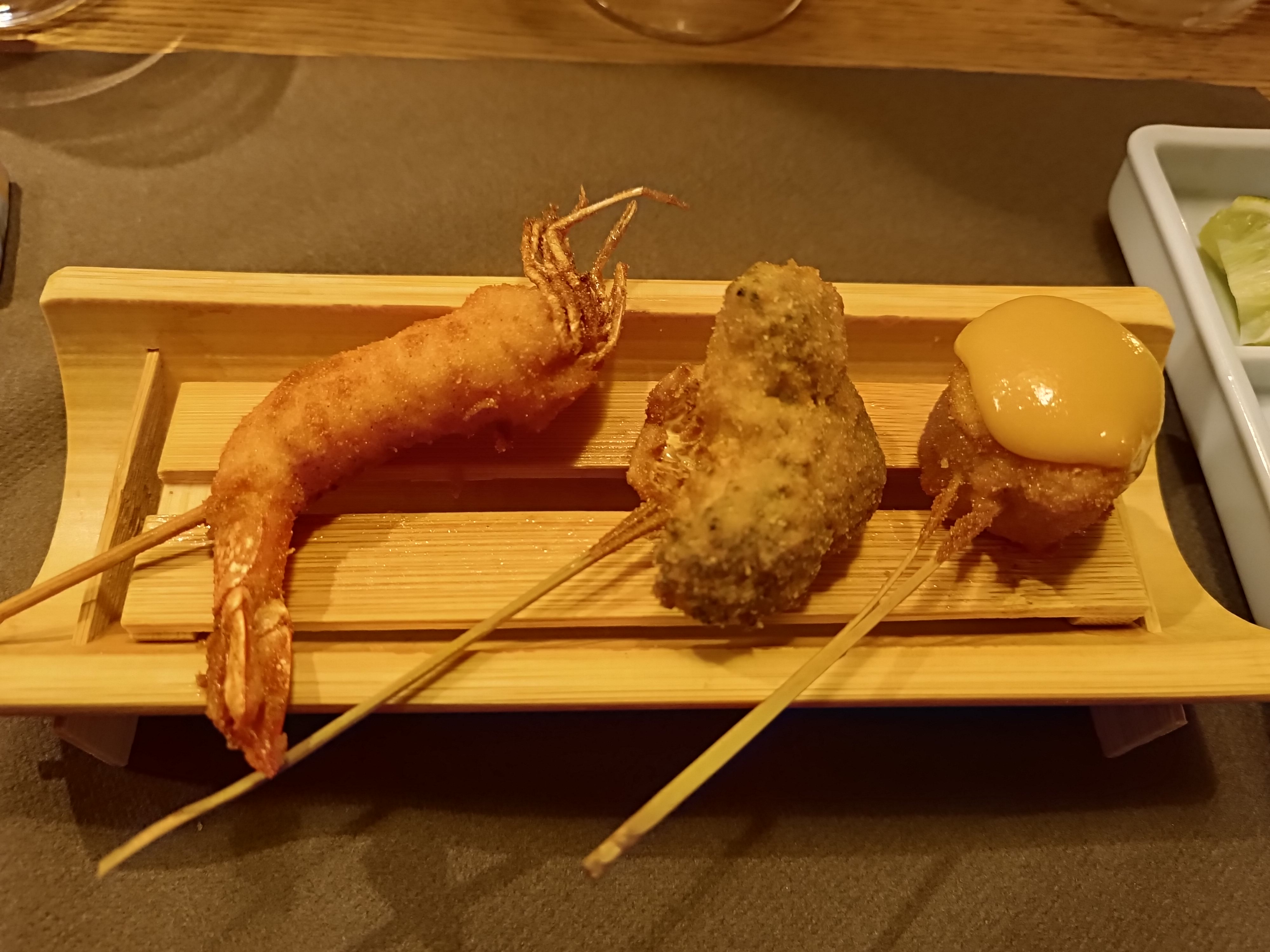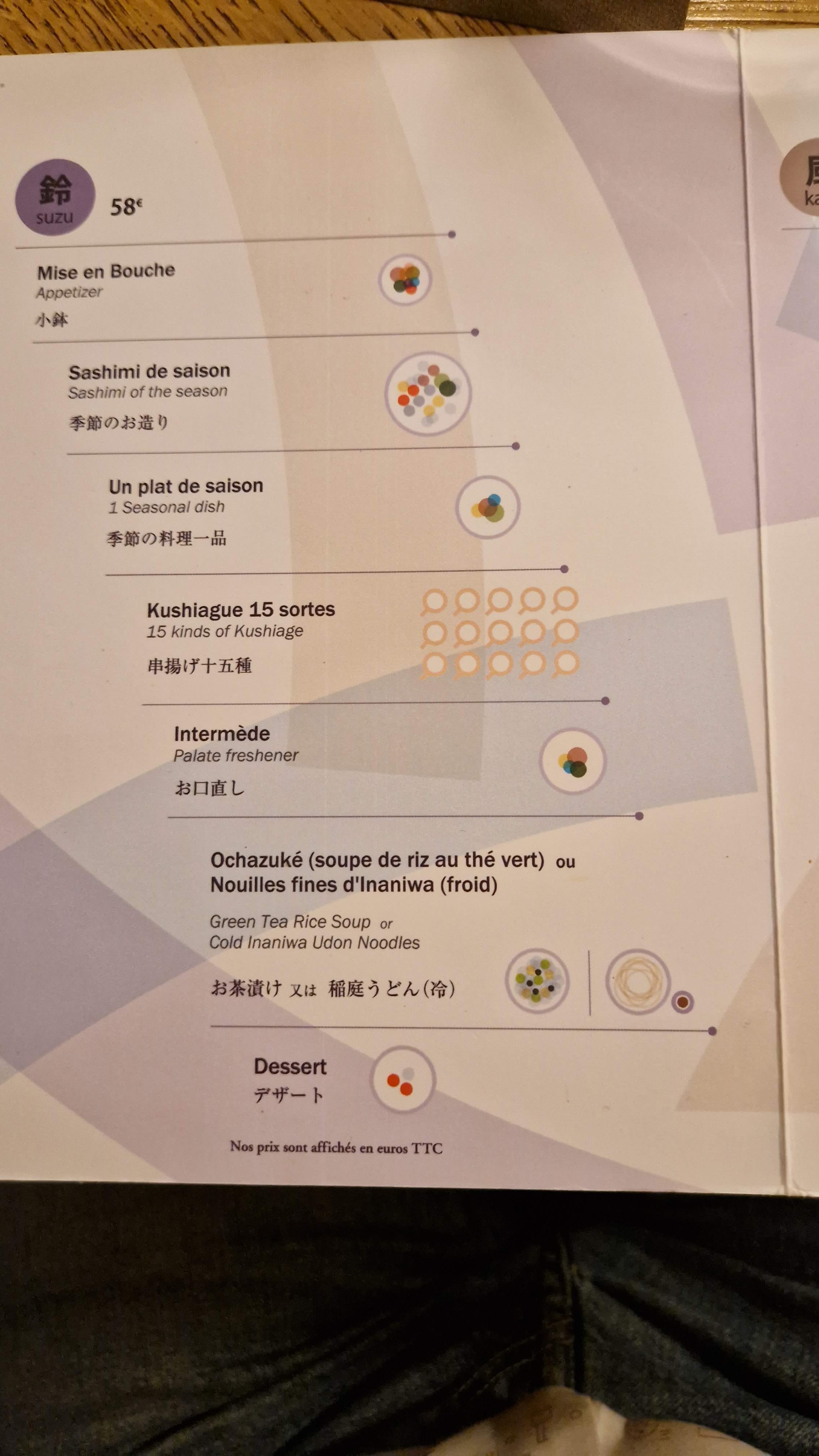 Dès la porte d'entrée très particulière, on plonge au Japon. La salle voutée est vraiment dépaysante. Les clients japonais indiquent certainement une adresse de référence. L'ambiance est discrète et tranquille. Tout est excellentissime. Nous avons pris le menu Suzu. Tout est très fin, les Kushiagué (petites brochettes avec une panure fine) sont variées et dignes d'un 3 étoiles. Le service est discret, sympatique et très souriant. Les plats sont décrits par le serveur et accompagnés chacun d'une sauce Soja différente et en accord avec le plat. Tous les intermèdes sont un régal et une surprise à chaque plat apporté. Très bonne soirée passée à deux et de bons souvenirs.