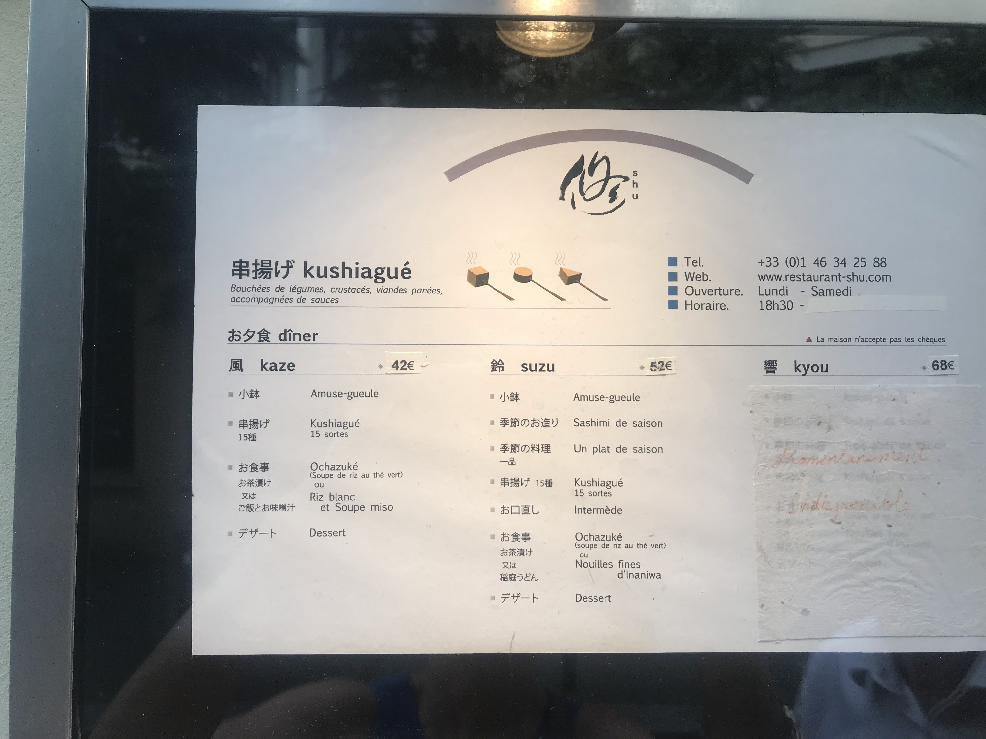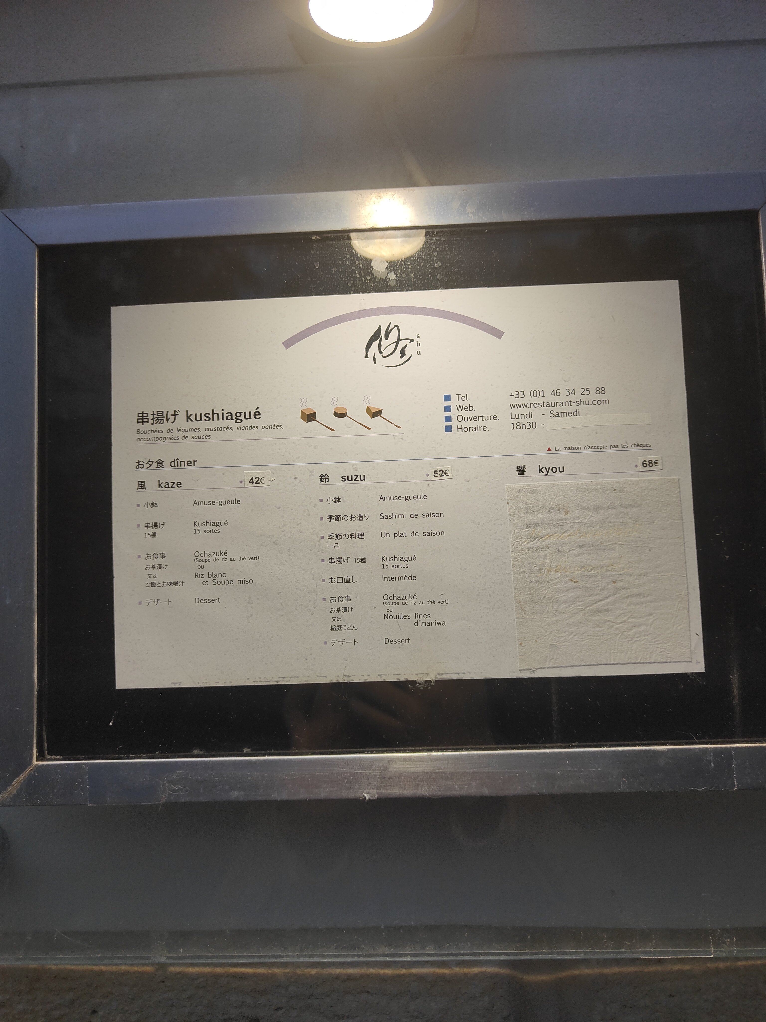 Cela faisait longtemps que je n étais pas venu chez Shu. C est toujours aussi bon, avec un repas de Kushiage de qualité et des petits plats tout en délicatesse. 2 menus à 48 et 58€ et belle carte de sakes