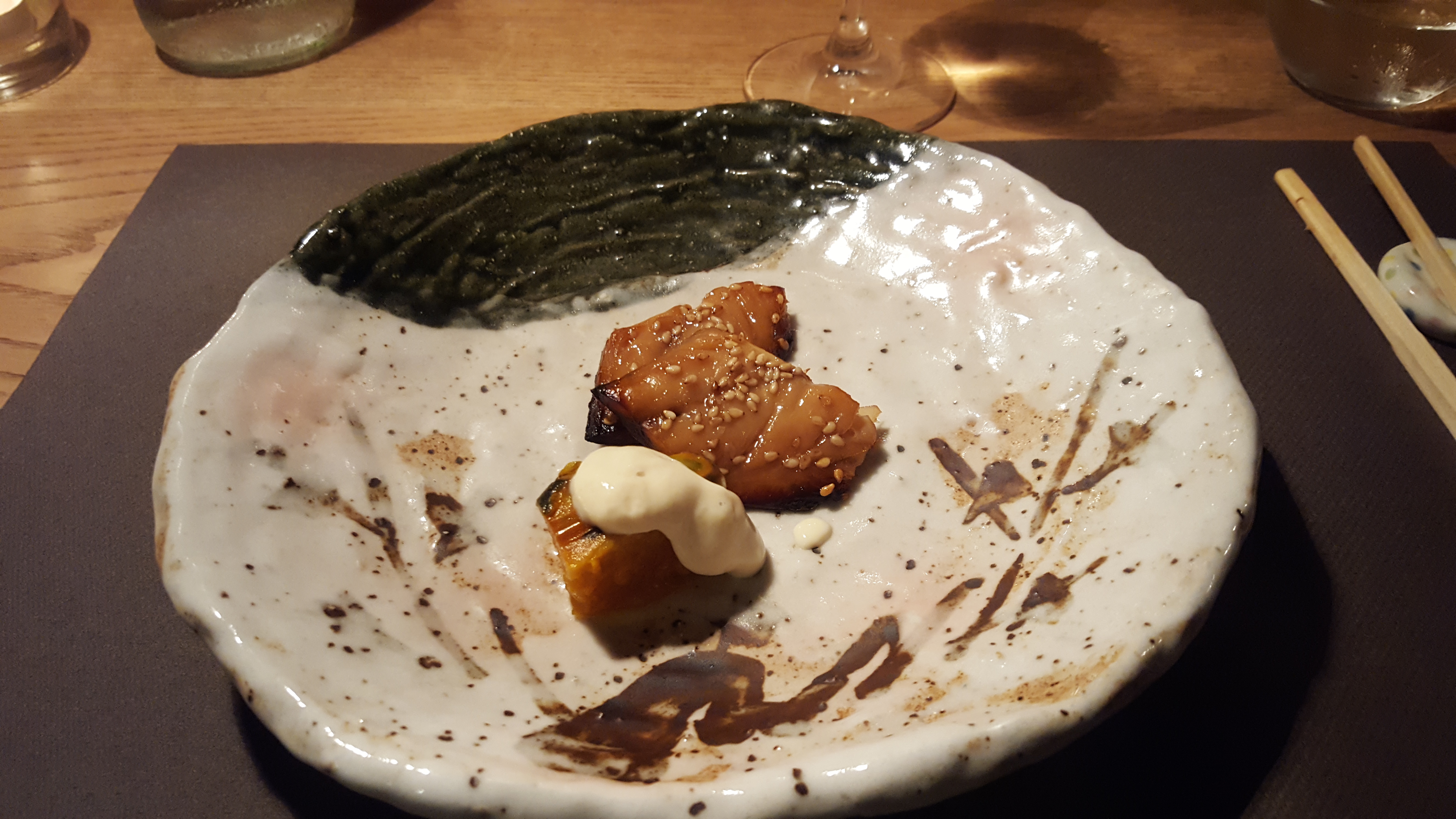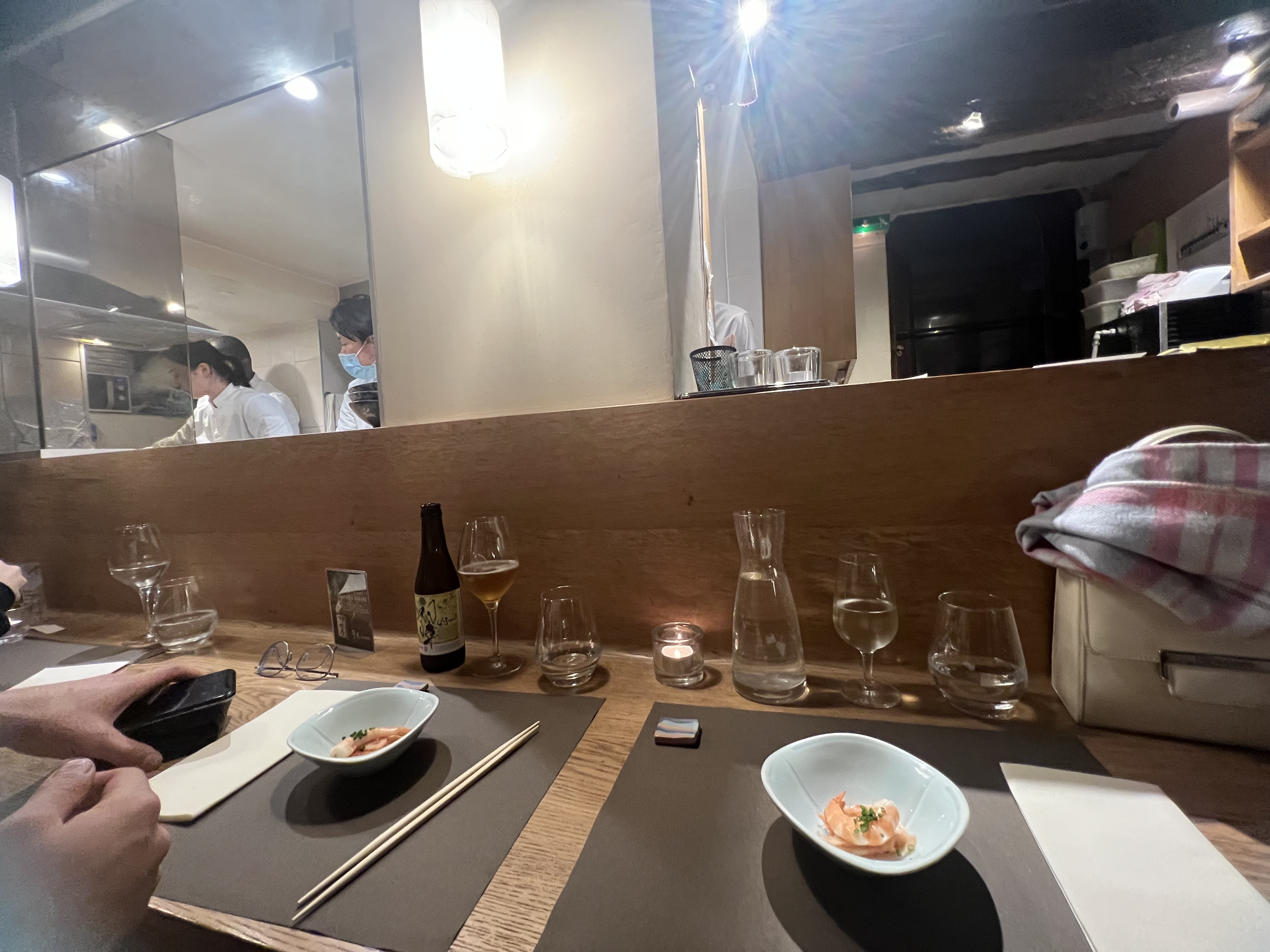 La porte d'entrée fait 1.40m, mais une fois franchie, on est au Japon. Choix de saké impressionnant, dommage qu'ils ne servent pas des sakés français comme celui des larmes du levant. Note correct vu la qualité des mets (42 ou 52€)