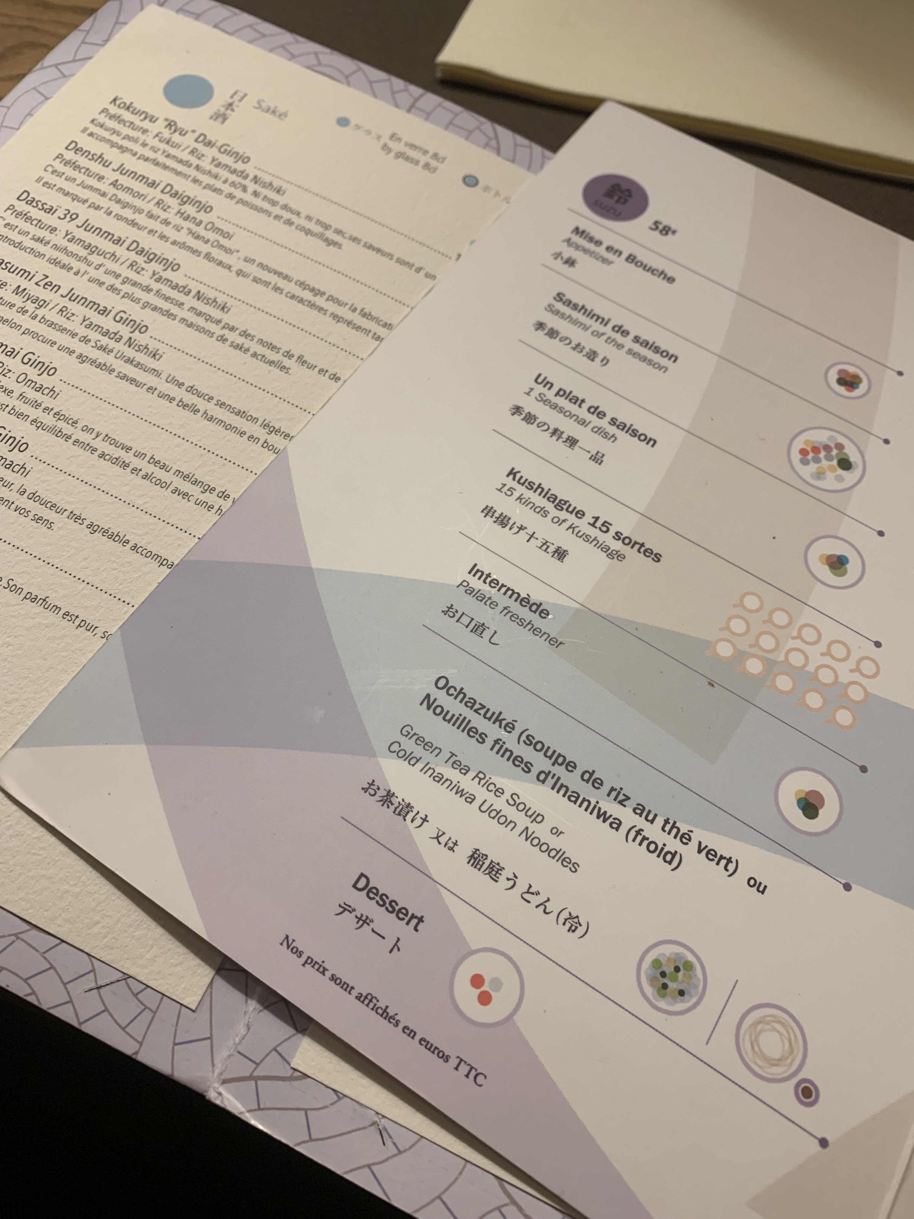 A notre arrivé, l’accueil impeccable, un bon service. Les serveuses nous expliques ce qu’on nous sert. Les brochettes: une très bonne découverte. Une bonne variété. Points négatifs: Les toilettes… ça sent le moisi, les murs sont sale, la porte des toilettes a l’air d’être humide et le sol très collant. Attention prix assez élevé 58 le menu Suzu, 48 l’autre. Dans l’ensemble, tout était plus ou moins parfait, bonne ambiance, de bon produits et une très bonne accueil.