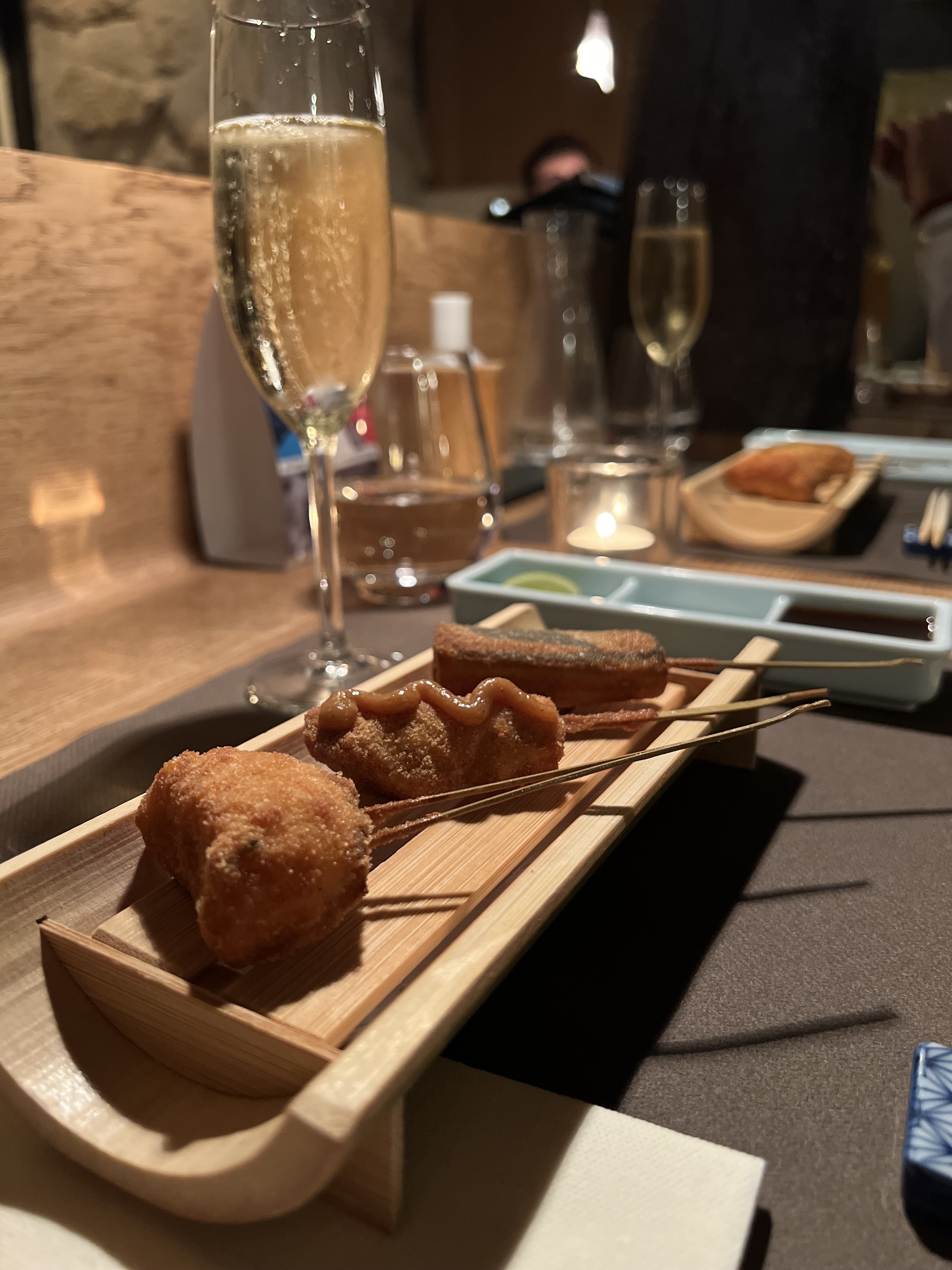 Original ! Cette expérience est extrêmement originale. On entre par une toute petite porte. Une odeur de cave a l'entrée du restaurant, non dérangeant car elle laisse place à la particularité du lieu et de la décoration. Nous avons pris le menu suzu accompagné d'un thé. Le début du repas nous a laissé dubitatif, sur notre faim, malgré la douceur des sashimis. Cependant, les 15 sortes de kushiage étaient un délice, tout particulièrement, ceux aux saint jacques et au foie gras. Concernant les ochazuke, je vous conseille les nouilles froides d'inaniwa. Le dessert était tout aussi bon, avec des touches franco-japonaises. Je vous recommande ce restaurant pour un dîner en amoureux ou d'affaires afin de surprendre vôtre/vos invités.