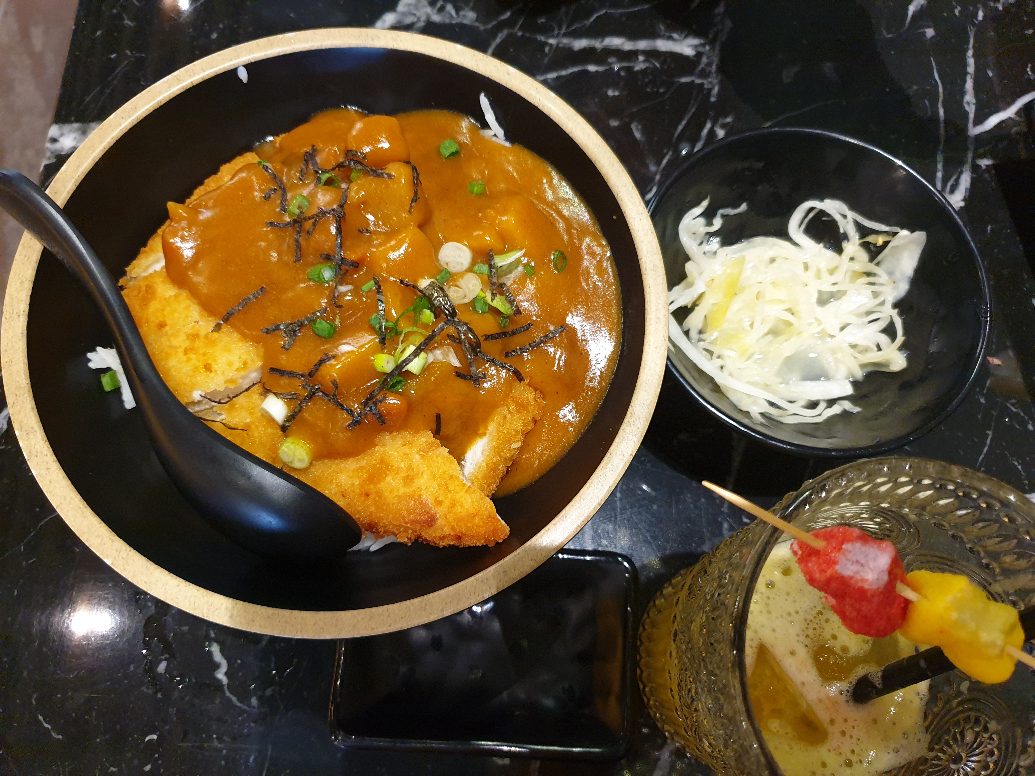 Très belle déco par ailleurs le cocktail semble être du jus de fruits. Plutôt savoureux mais trop cher pour une si petite quantité et une soupe non exceptionnelle