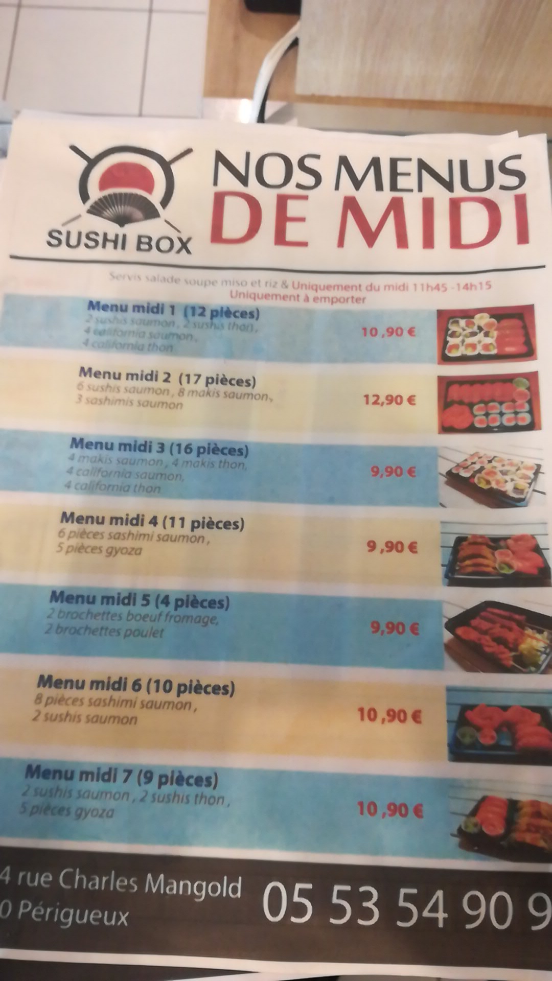 Découvrez toutes les informations concernant Restaurant japonais Sushi-Box qui se situe au 14 Rue Charles Mangold, 24000 Périgueux (24). Cette fiche inclut les photos, les horaires d'ouverture, l'adresse, le numéro de téléphone et les avis des clients.