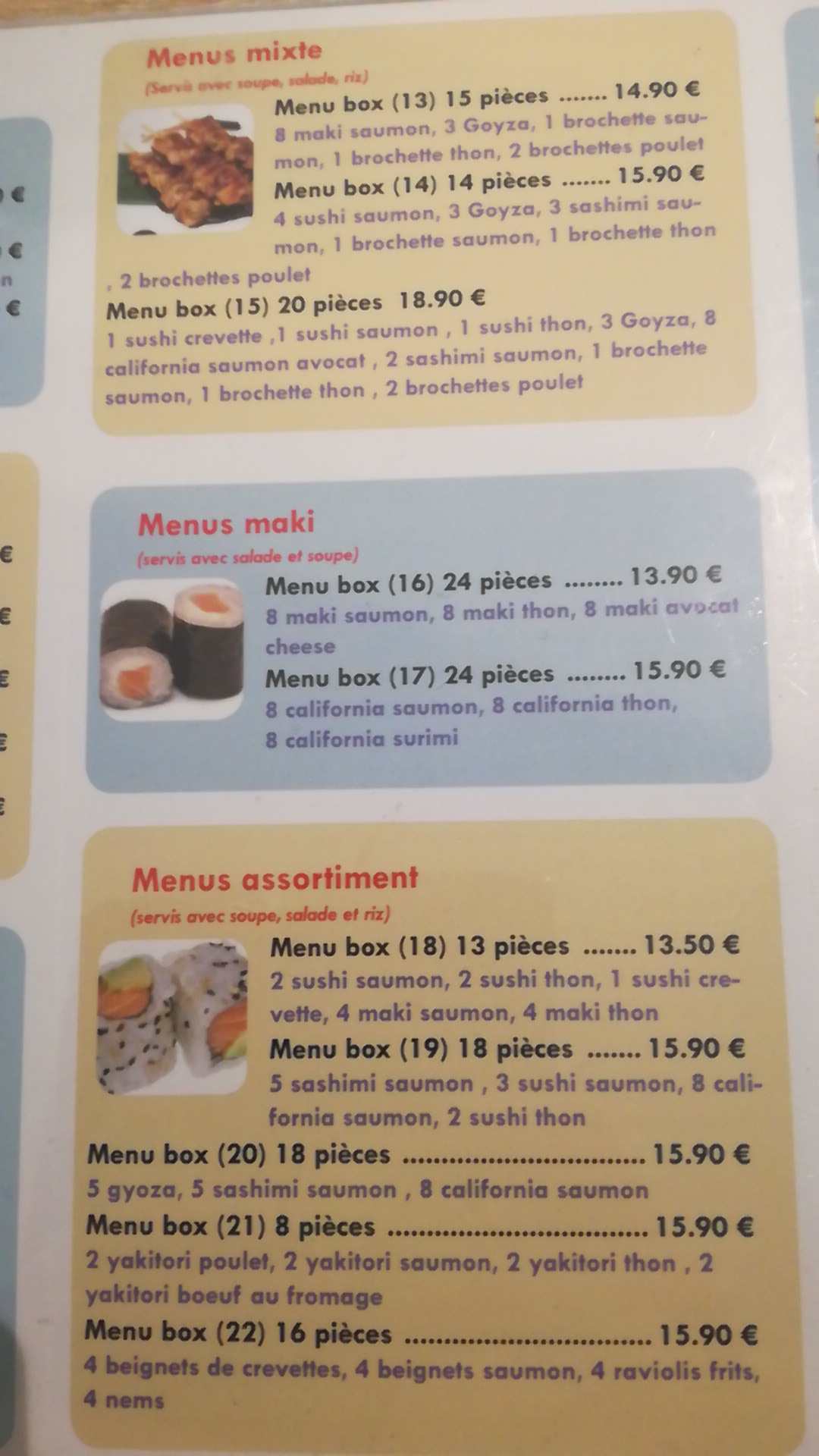 Posté le 20/08/2018 à 08:09"Des menus midi à prix très abordables faits avec des produits frais sous nos yeux. Les menus sushis sont accompagnés de riz, soupe et salade. Très bon rapport qualité prix. Service agréable des nougats nous ont été offerts."