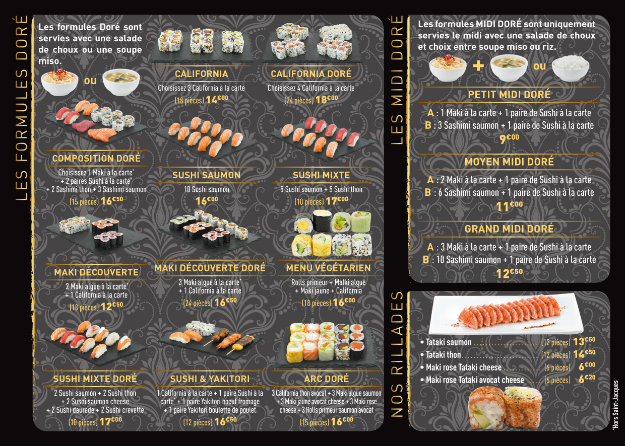 Nous sortons de sushi doré où nous eu droit à un accueil très chaleureux. Nous ne savions pas trop quoi commander et avons fait confiance au patron qui nous à servi un excellent assortiment de sushis.Les filles étaient ravies et nous avions les papilles en ébullition !!!!Produit extra frais .Nous recommandons très sincèrement. Merci à vous. Famille Domet.