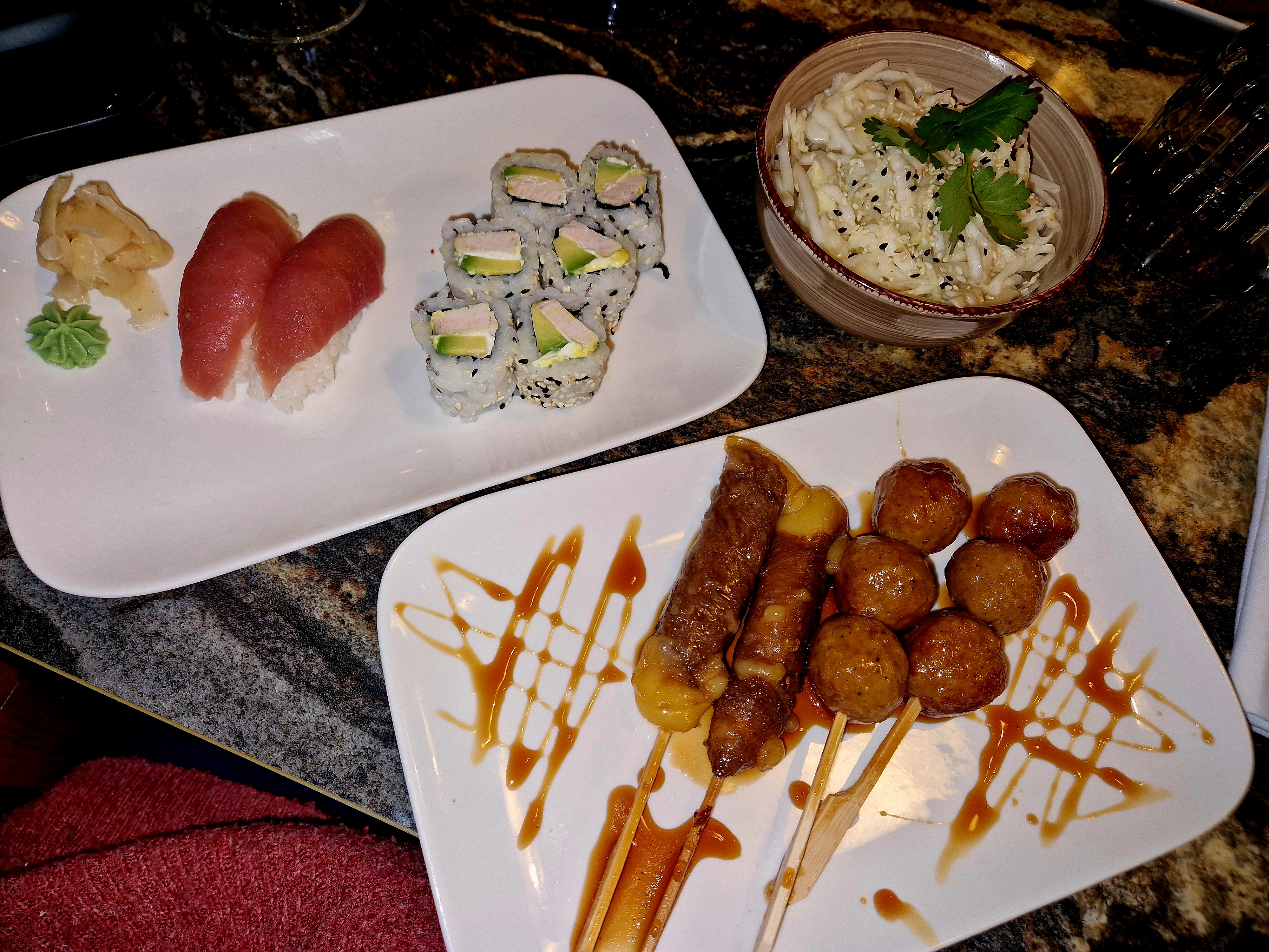 Commande en livraison. Personnel gentil et courtois. Malheureusement, ça s’arrête là. Le riz était beaucoup trop cuit et étouffant. Les sushis sont sans saveur. Brochettes sèches. J’ai retrouvé une queue de crevette dans mon sushi au saumon alors qu’aucun des plats ne comportait de crevette ... Je me demande comment elle est arrivée là. Franchement, l’une de mes pires expériences en la matière.