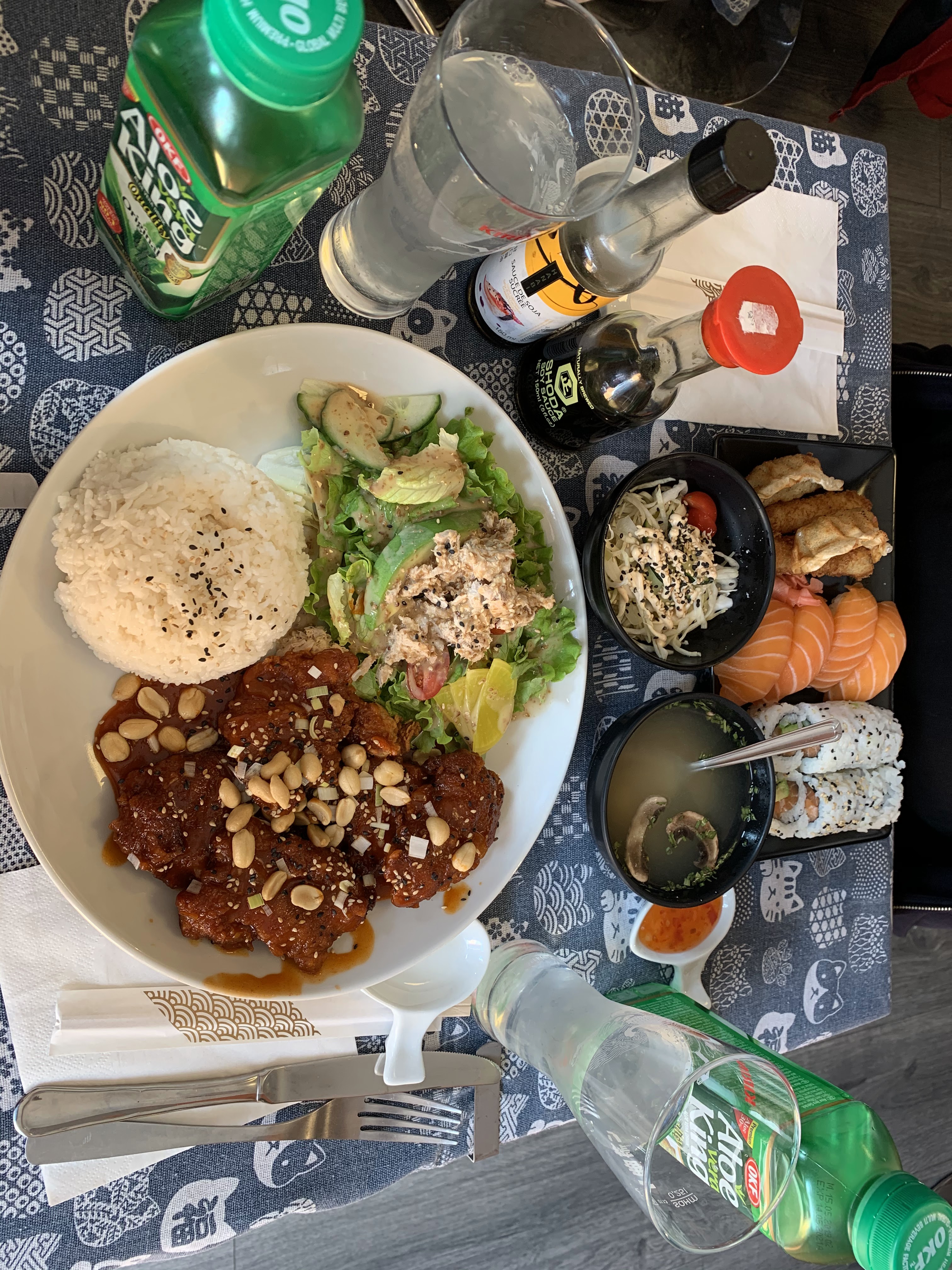 Sushi pris en commande. Rien à redire sur le poulet Coréen très bon! Par contre énorme déception pour les sushis/California : le riz était trop cuit, très collant mais absolument pas vinaigré donc très fade... ayant été au Japon plusieurs fois un riz comme ça est juste inmangeable ! On a fini par manger seulement les tranches de poisson... bref vraiment déçu pour ce prix!